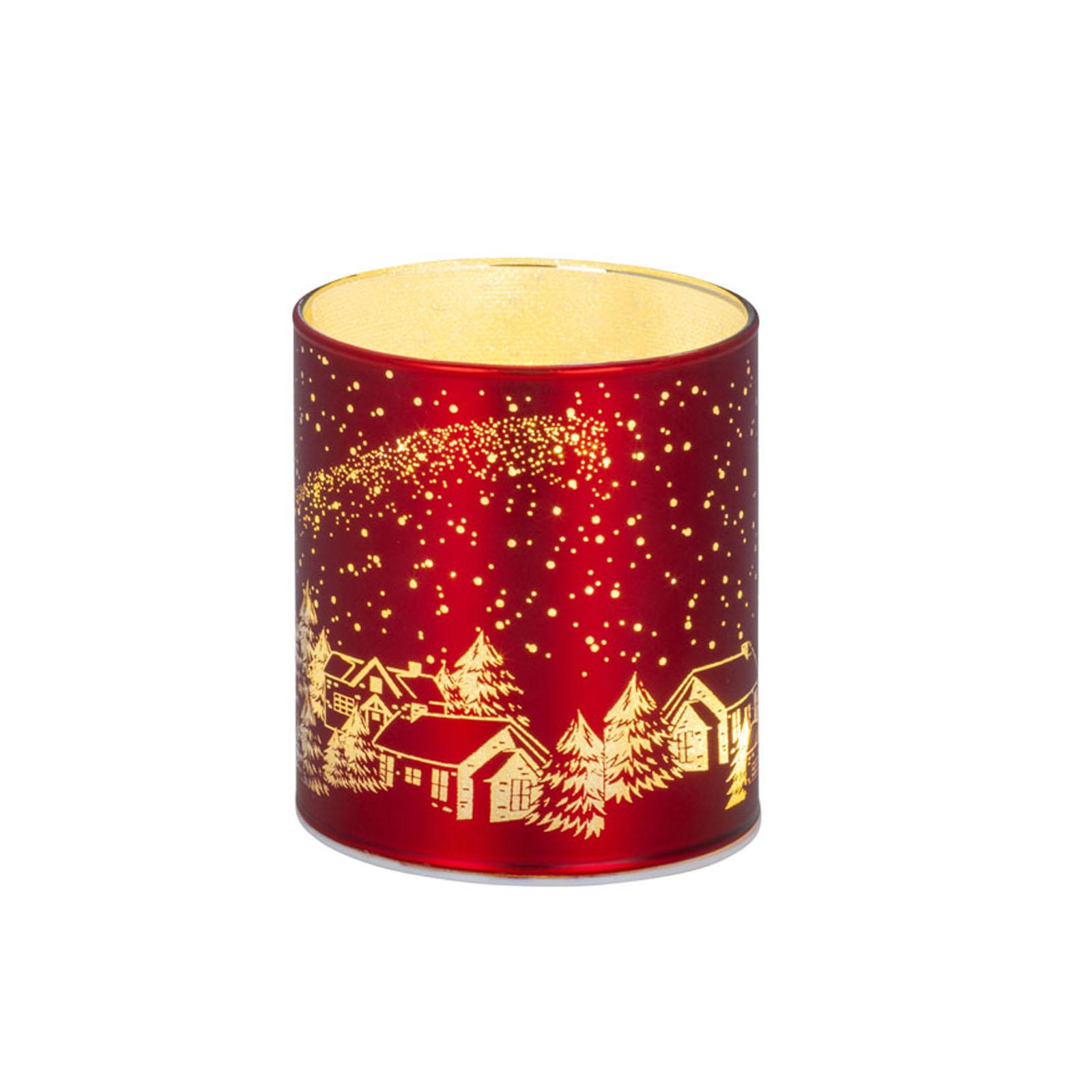 • Länge ca.: 7.5 cm • Breite ca.: 7.5 cm • Höhe ca.: 8.5 cm • Durchmesser ca.: 7.5 cm • Material: Glas • Oberfläche: glatt • Oberfläche Details: verziert • spülmaschinengeeignet: nein • Farbe: rot-gold • Eigenschaft: mit 6er LED-Lichterkette • Ausstattung: ohne Batterien (für 3xAAA 1,5V Batterie) • Form: rund • Dimension: klein • Motiv-Design: Weihnachtsdorf Santa
