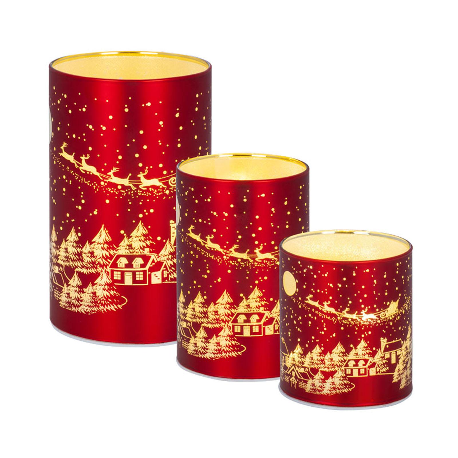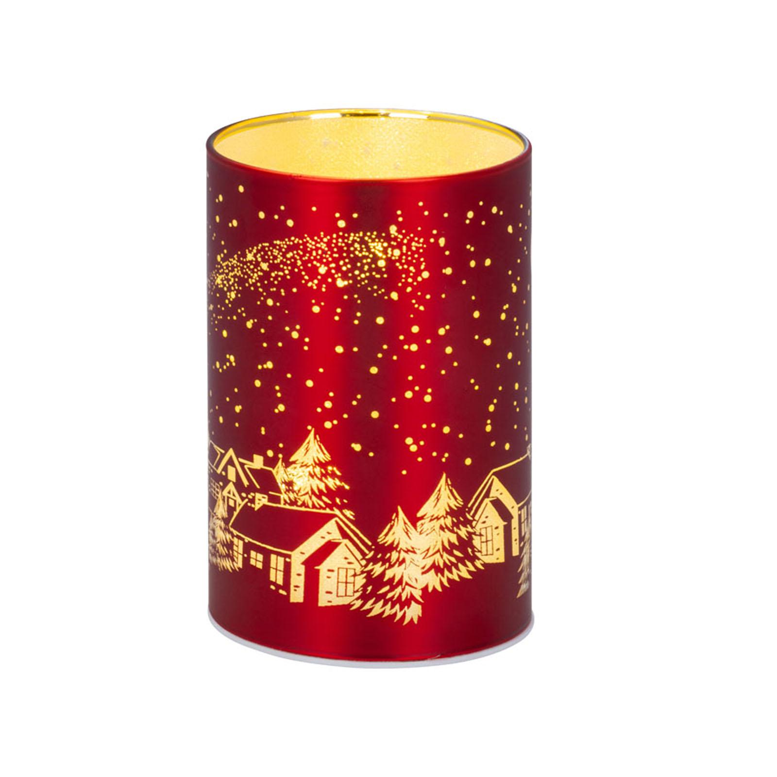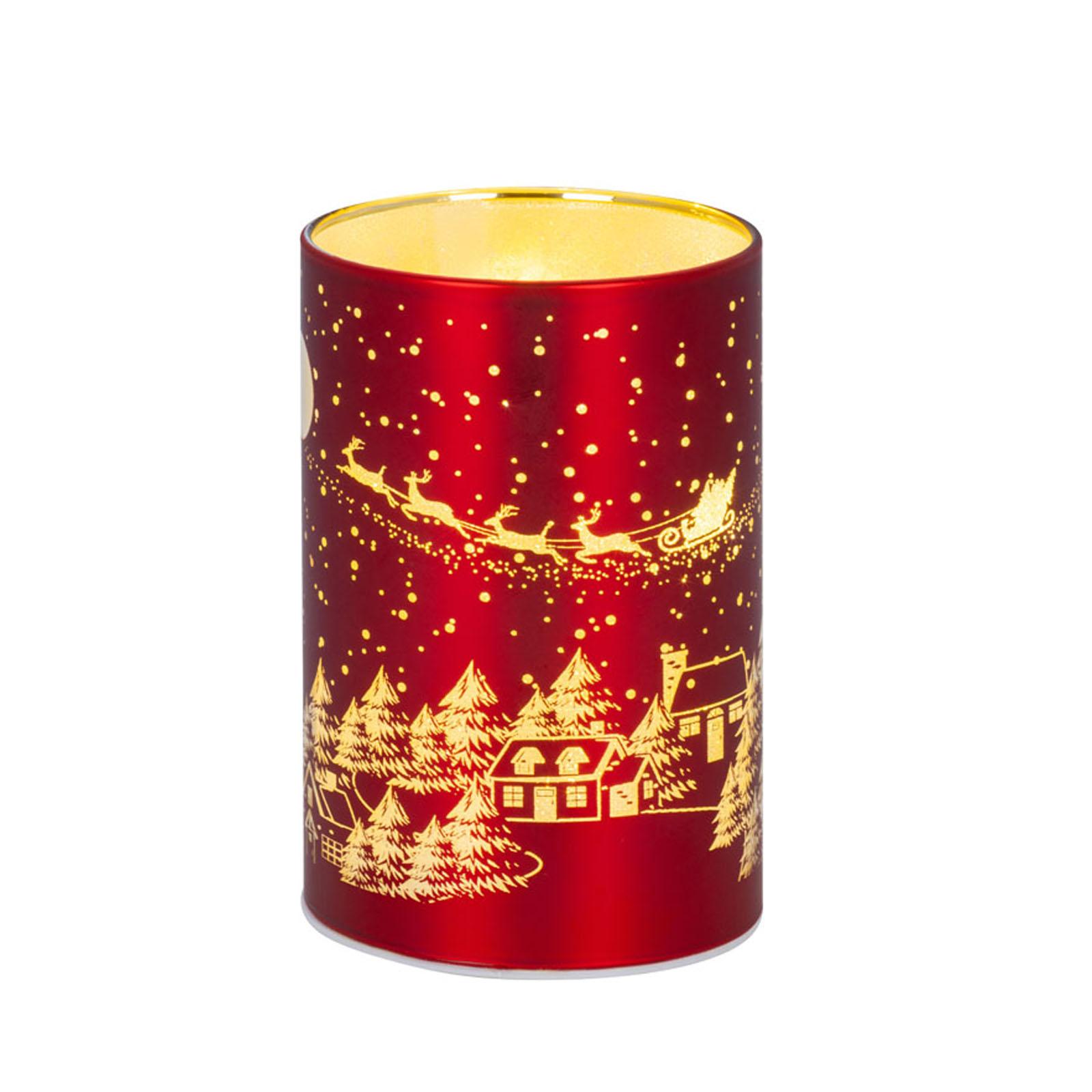 • Länge ca.: 7.5 cm • Breite ca.: 7.5 cm • Höhe ca.: 11.5 cm • Durchmesser ca.: 7.5 cm • Material: Glas • Oberfläche: glatt • Oberfläche Details: verziert • spülmaschinengeeignet: nein • Farbe: rot-gold • Eigenschaft: mit 8er LED-Lichterkette • Ausstattung: ohne Batterien (für 3xAAA 1,5V Batterie) • Form: rund • Dimension: mittel • Motiv-Design: Weihnachtsdorf Santa