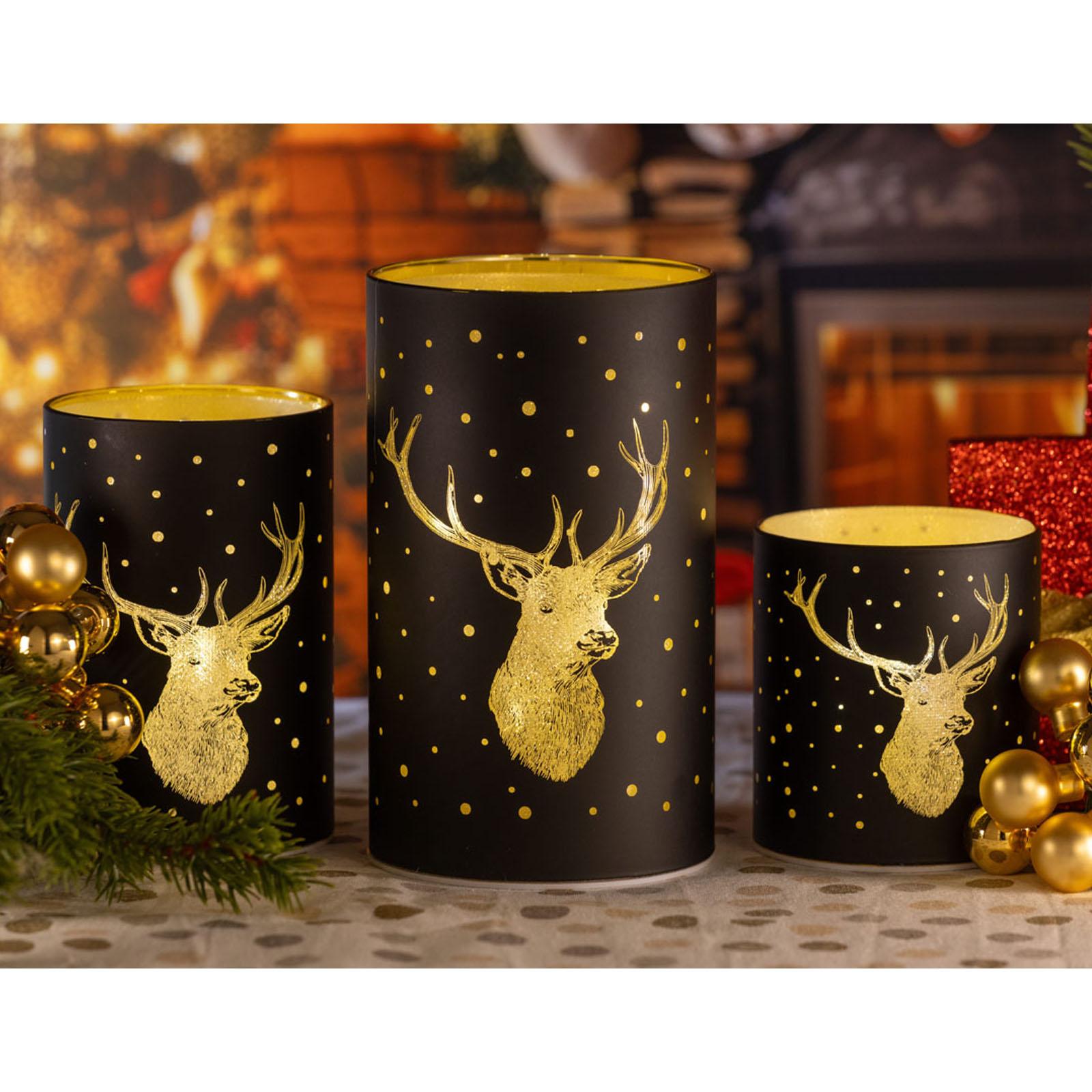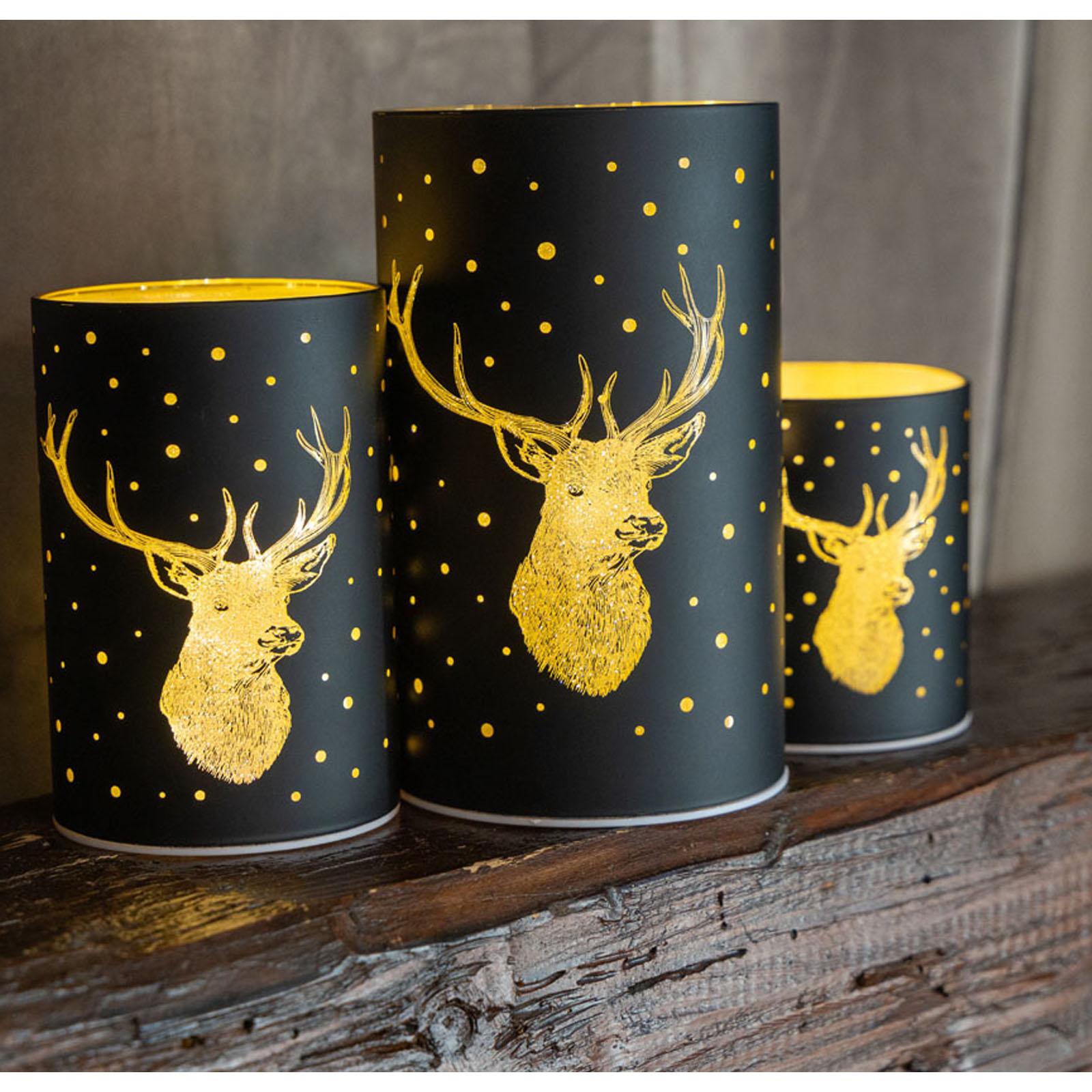 • Länge ca.: 7.5 cm • Breite ca.: 7.5 cm • Höhe ca.: 8.5 cm • Durchmesser ca.: 7.5 cm • Material: Glas • Oberfläche: glatt • Oberfläche Details: verziert • spülmaschinengeeignet: nein • Farbe: schwarz-gold • Eigenschaft: mit 6er LED-Lichterkette • Ausstattung: ohne Batterien (für 3xAAA 1,5V Batterie) • Form: rund • Dimension: klein • Motiv-Design: Hirschkopf