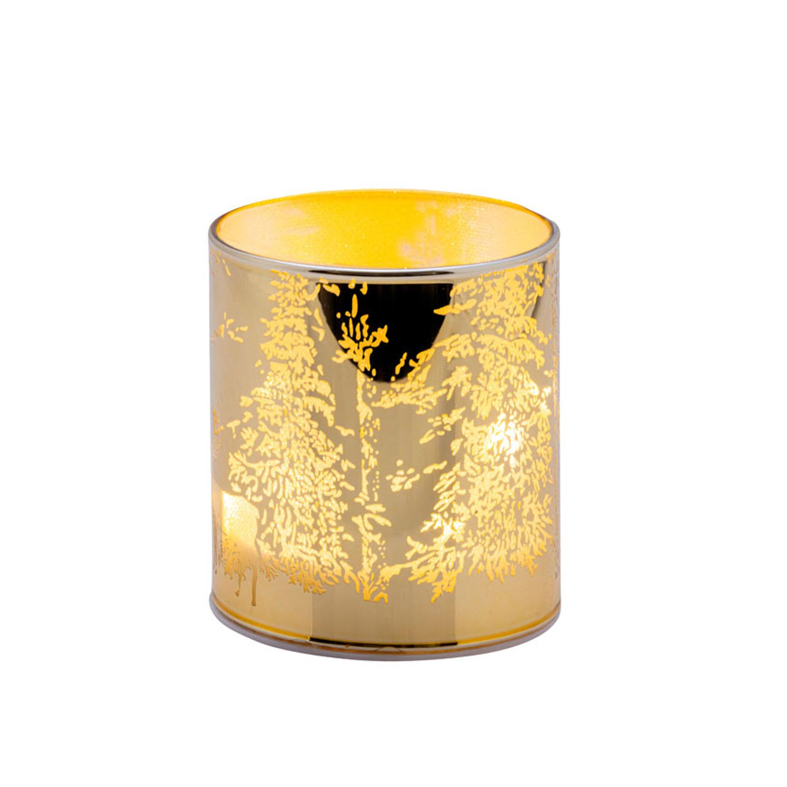 • Länge ca.: 7.5 cm • Breite ca.: 7.5 cm • Höhe ca.: 8.5 cm • Durchmesser ca.: 7.5 cm • Material: Glas • Oberfläche: glatt • Oberfläche Details: verziert • spülmaschinengeeignet: nein • Farbe: goldfarben • Eigenschaft: mit 6er LED-Lichterkette • Ausstattung: ohne Batterien (für 3xAAA 1,5V Batterie) • Form: rund • Dimension: klein • Motiv-Design: Hirsche & Bäume