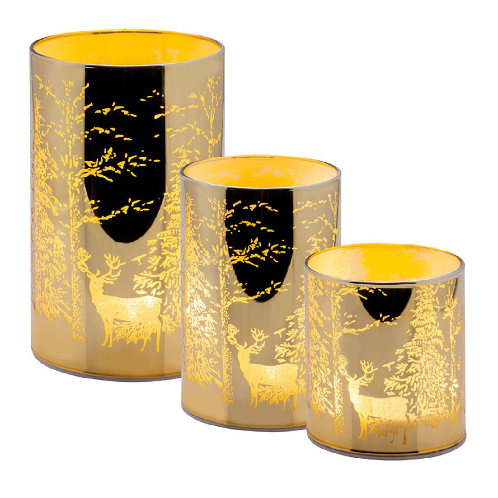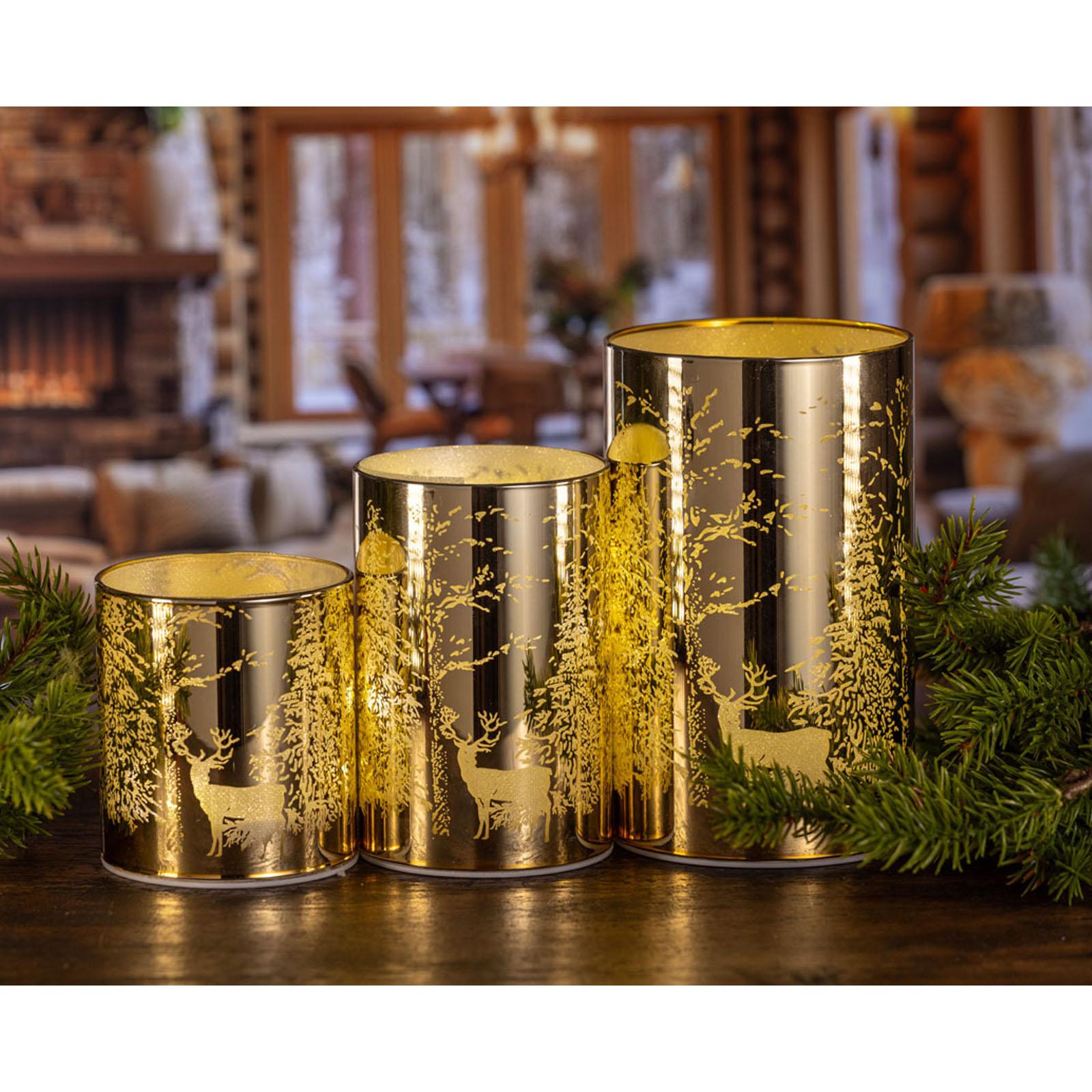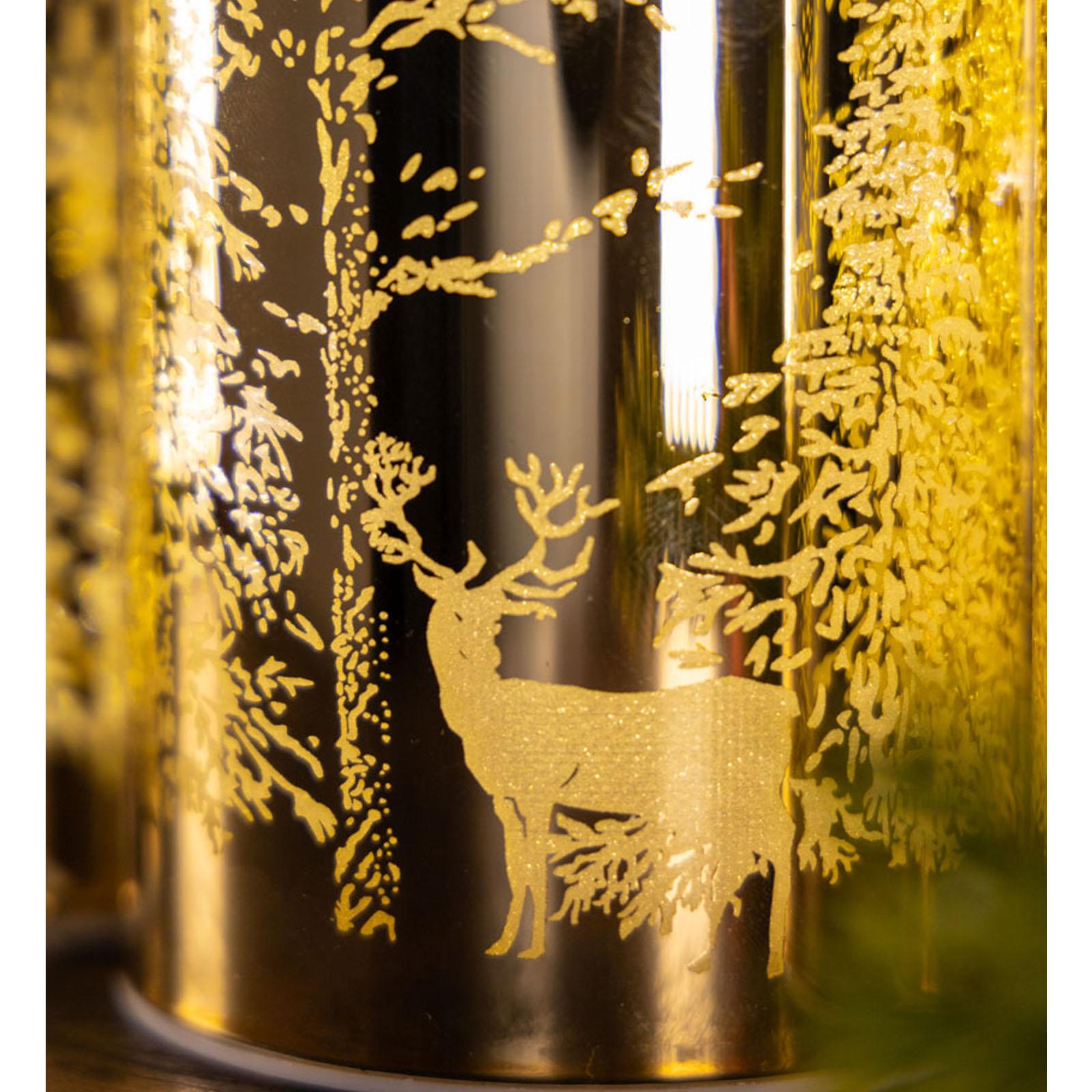 • Länge ca.: 7.5 cm • Breite ca.: 7.5 cm • Höhe ca.: 11.5 cm • Durchmesser ca.: 7.5 cm • Material: Glas • Oberfläche: glatt • Oberfläche Details: verziert • spülmaschinengeeignet: nein • Farbe: goldfarben • Eigenschaft: mit 8er LED-Lichterkette • Ausstattung: ohne Batterien (für 3xAAA 1,5V Batterie) • Form: rund • Dimension: mittel • Motiv-Design: Hirsche & Bäume