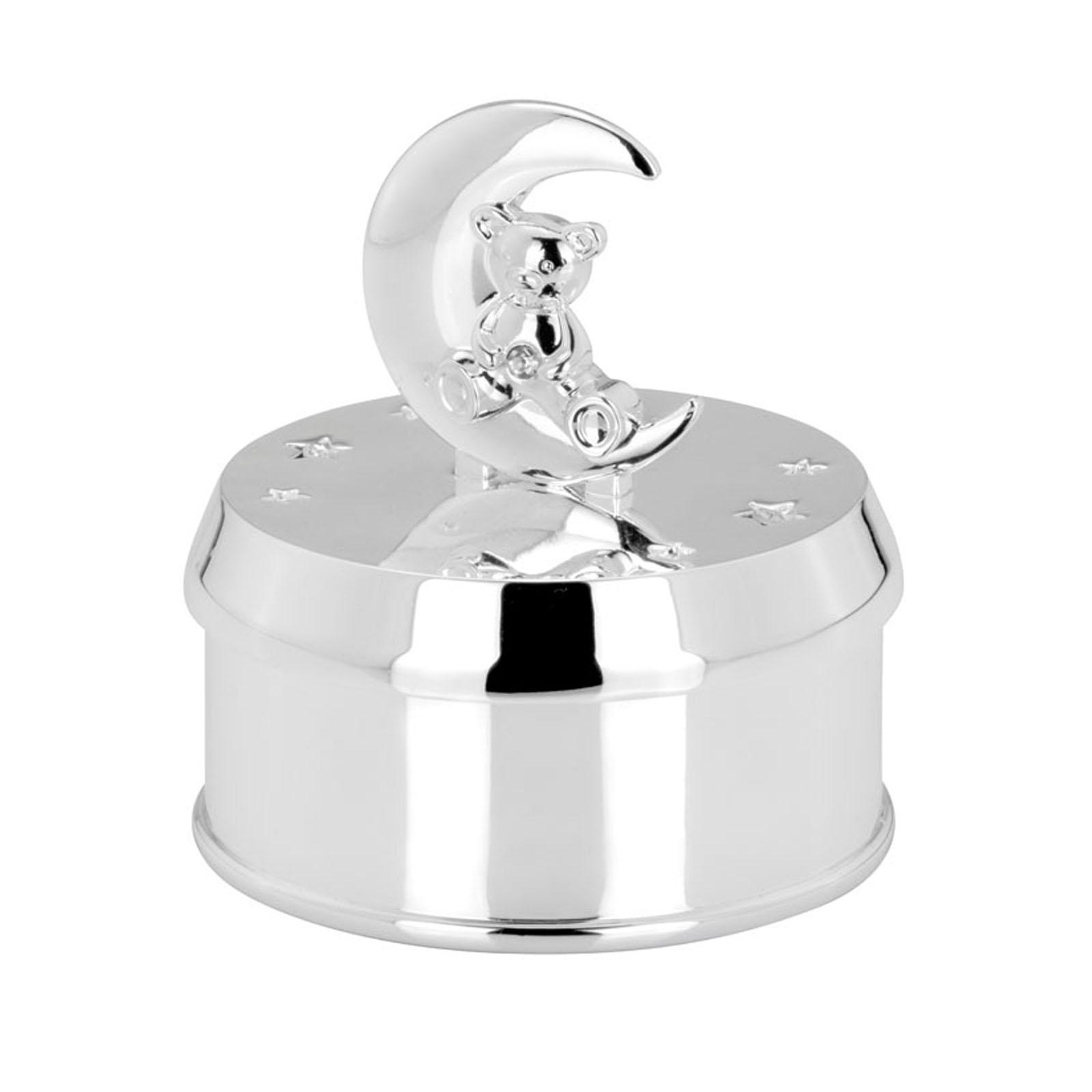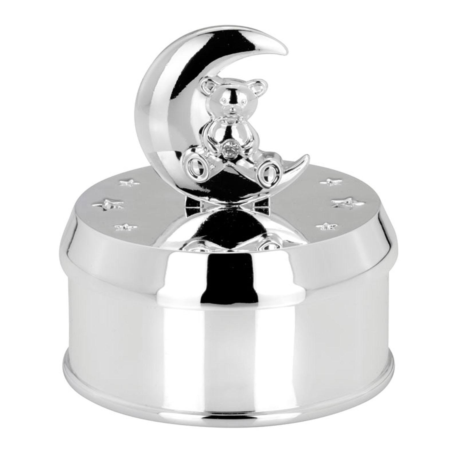 • Länge ca.: 7.4 cm • Breite ca.: 7.4 cm • Höhe ca.: 8.0 cm • Durchmesser ca.: 7.4 cm • Material: Metall • Beschichtung: versilbert • Veredelung: anlaufgeschützt • Oberfläche: glatt poliert • spülmaschinengeeignet: nein • Farbe: silber • Eigenschaft: Melodie: Guten Abend - Gute Nacht • Form: rund • Dimension: klein • Motiv-Design: Teddy & Mond