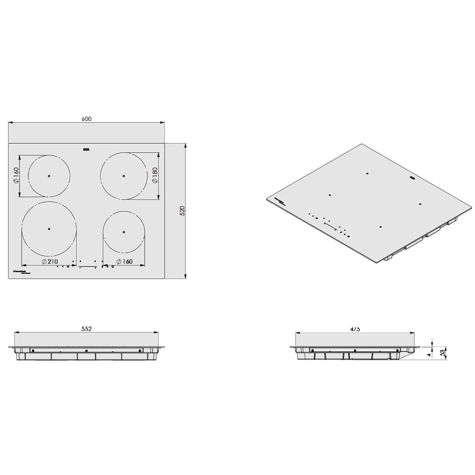 ☛ Einbauvarianten aufgelegt flächenbündig aufgelegt mit Kochfeldrahmen ☛ Sicherheit Kindersicherung Restwärmeanzeige Überhitzungsschutz automatische Sicherheitsabschaltung ☛ Ausstattung 11 Leistungsstufen 0-9 + P + P2 Booster je Kochzone & Doppelbooster automatische Topferkennung LED Anzeigen in Rot Voreingestellte Kochzonen: Schmelzstufe 50°C Warmhaltestufe 70°C Simmerstufe 92°C Fortkochautomatik Stop & Go Funktion Memory Funktion Timer (99 min.) ☛ Kochzonen 4 Induktions-Kochzonen Zone vorne links Ø 210 mm - 2,2 / 2,4 / 2,6 kW Zone vorne rechts Ø 160 mm - 1,2 / 1,3 / 1,5 kW Zone hinten links Ø 160 mm - 1,2 / 1,3 / 1,5 kW Zone hinten rechts Ø 180 mm - 1,8 / 2,0 / 2,4 kW ☛ Besonderheiten Ausschnittmaße (B x T) 560 x 490 mm Unterschrankbreite 600 mm