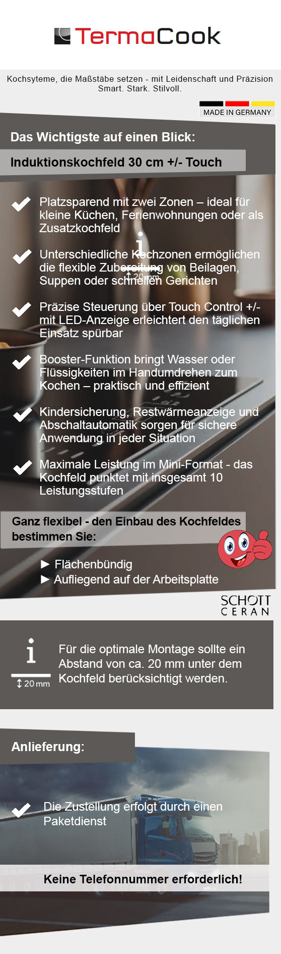 TermaCook - Küchentechnologie mit Anspruch. Seit 2012 steht TermaCook für Innovation Made in Germany: moderne Induktionskochfelder, präzise Technik und durchdachtes Design, die Kochen einfacher, flexibler und sicherer machen. Das Domino Induktionskochfeld mit 30 cm Breite ist die platzsparende Lösung für kleine Küchen, Ferienwohnungen oder als Zusatzkochfeld. Mit zwei Kochzonen, einfacher Touch Control Steuerung und automatischer Topferkennung bietet es volle Leistung auf kompaktem Raum. Der Booster beschleunigt den Kochprozess, während der Timer für punktgenaues Garen sorgt. Sicherheit ist durch Kindersicherung und Restwärmeanzeige gewährleistet. Ideal für Singles, Paare oder als Ergänzung zu einem größeren Kochfeld.