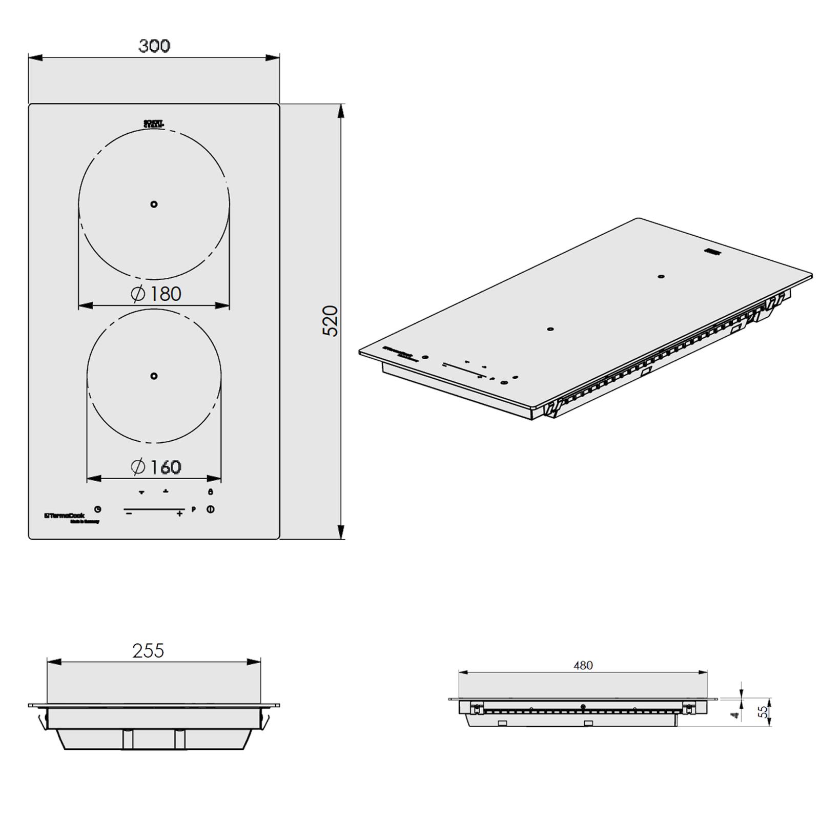 • Gerätebreite: 30 cm • Länge: 520 mm • Breite: 300 mm • Höhe: 55 mm • Tiefe: 520 mm • Farbe: schwarz • Material: Glas • Material Oberfläche: Schott HIGHTRANS-Glas • Bedienung: Touch Control, +/- Steuerung • Betrieb: Elektro / Induktion • Ausführung: rahmenlos • Installationsart: aufliegend, flächenbündig • Form: rechteckig • Leistungsstufen: 9 • Anschluss: 220-240 / 50-60 / - V / Hz / A • Anschlusswert: 3,5 kw • Kabel & Anschluss: 1.5 m • Besonderheit: Made in Germany • Design: modern, elegant
