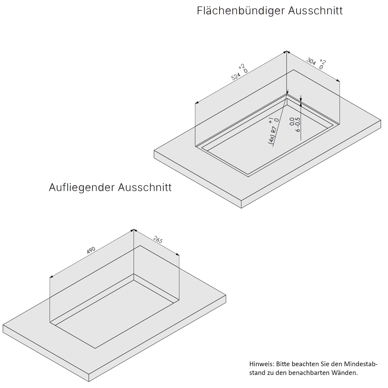 Für die Montage gelten klare Vorgaben: Das Kochfeld misst 300 x 55 x 520 mm und benötigt einen Ausschnitt von 265 x 490 mm bei einer Unterschrankbreite von mindestens 400 mm. Ein Freiraum von ca. 20 mm unterhalb des Geräts sowie ein Mindestabstand zu den Seitenwänden werden empfohlen. Mit einem vormontierten 1,5 m Anschlusskabel und einer Leistung von 3,5 kW ist das Gerät unkompliziert einzubauen und bestens für kompakte Küchenlösungen geeignet.