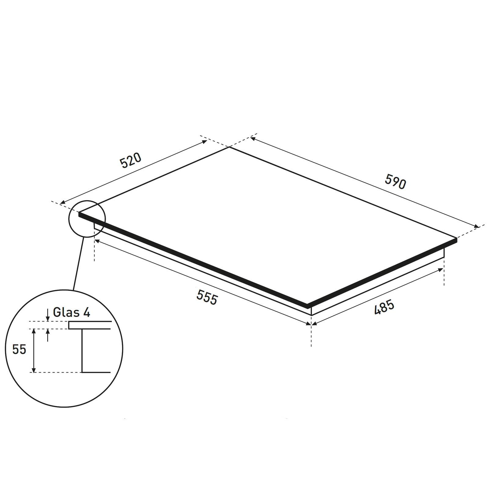• Gerätebreite: 60 cm • Breite: 590 mm • Höhe: 55 mm • Tiefe: 520 mm • Farbe: schwarz • Material: Glas • Material Oberfläche: Glaskeramik • Bedienung: Touch-Control-Bedienung • Betrieb: Elektro / Induktion • Ausführung: rahmenlos • Installationsart: aufgelegt • Form: quadratisch • Leistungsstufen: 9 • Anschluss: 400 / 50 / 16 V / Hz / A • Anschlusswert: 6.4 kw • Kabel & Anschluss: ca. 140 cm lang • Design: matte Optik