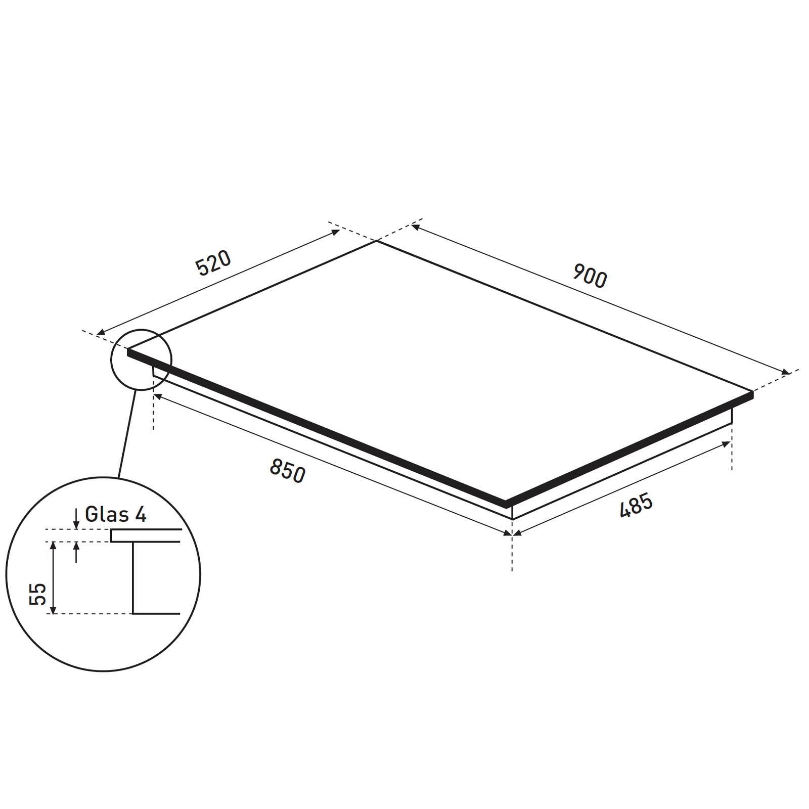 • Gerätebreite: 90 cm • Breite: 900 mm • Höhe: 55 mm • Tiefe: 520 mm • Farbe: schwarz • Material: Glas • Material Oberfläche: Glaskeramik • Bedienung: Multi-Slider-Bedienung • Betrieb: Elektro / Flächen-Induktion • Ausführung: rahmenlos • Installationsart: flächenbündig, aufgelegt • Form: rechteckig • Leistungsstufen: 9 • Anschluss: 400 / 50 / 16 V / Hz / A • Anschlusswert: 10.8 kw • Kabel & Anschluss: ca. 140 cm lang