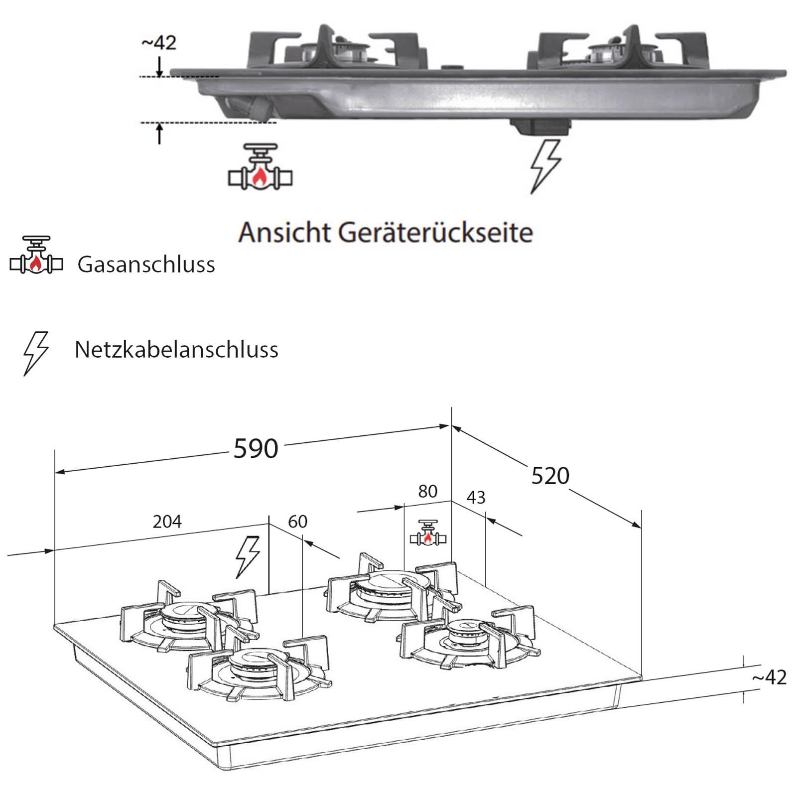 • Gerätebreite: 60 cm • Breite: 590 mm • Höhe: 40 mm • Tiefe: 520 mm • Farbe: schwarz • Material: Glas-Gusseisen • Material Oberfläche: Glaskeramik • Bedienung: Design Bedienknebel • Betrieb: Erdgas: Düsen G20 - 20 mbar • Ausführung: 4-flammig • Installationsart: Einbau • Form: quadratisch • Leistungsstufen: 4 • Anschluss: 230 / 50 / - V / Hz / A • Kabel & Anschluss: ca. 140 cm lang, hinten rechts, Gasanschluss 1/2 "
