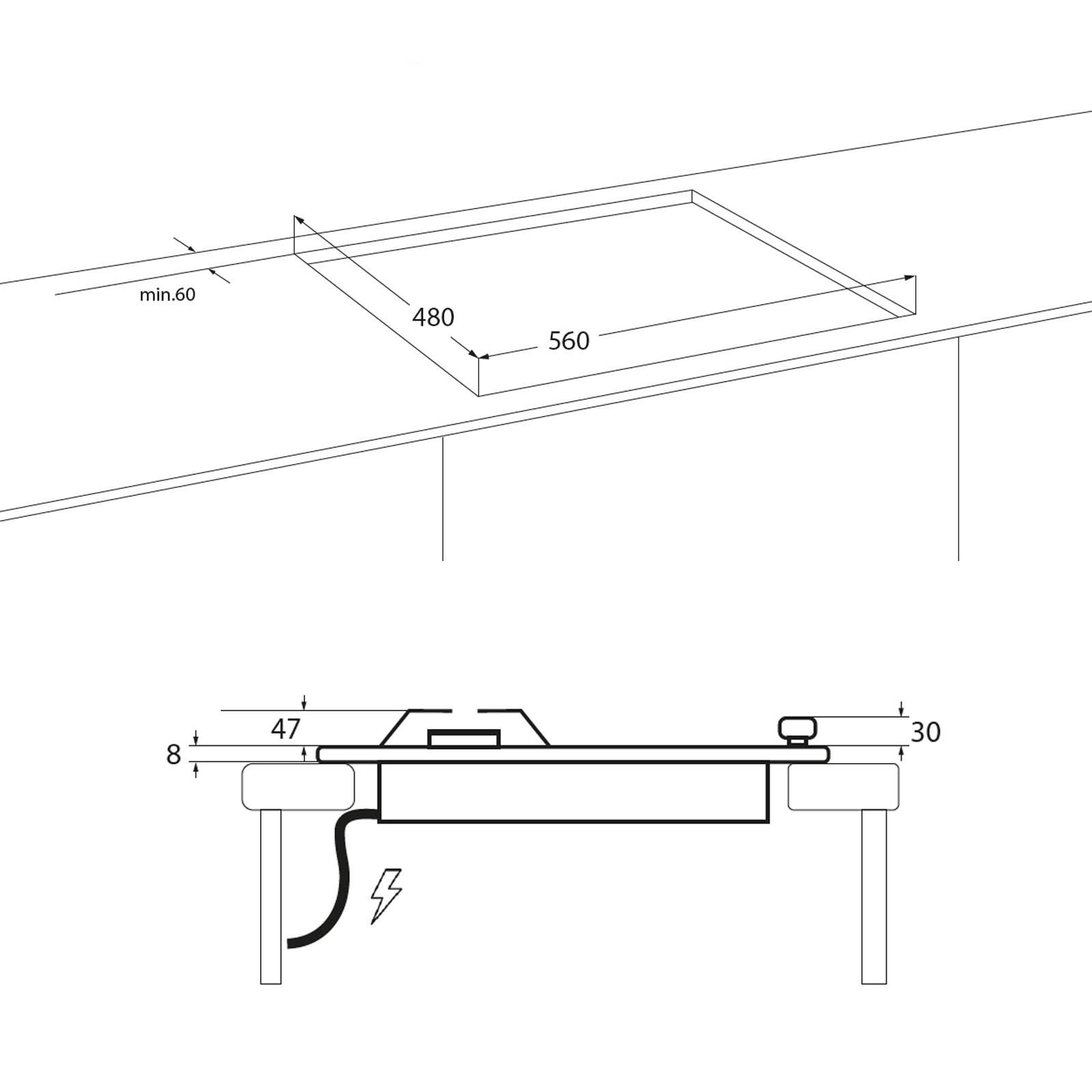 Für eine sichere Installation sind bestimmte Abstände einzuhalten. Der seitliche Abstand zu Hochschränken sollte ausreichend groß sein, um eine angenehme Nutzung zu gewährleisten. Auch oberhalb der Kochfläche ist ein Mindestabstand zu Hängeschränken erforderlich, um Wärmeeinwirkung und Hitzestau zu vermeiden. Für die elektronische Zündeinrichtung wird ein Stromanschluss benötigt; hierfür ist eine geerdete Schutzkontakt-Steckdose erforderlich.