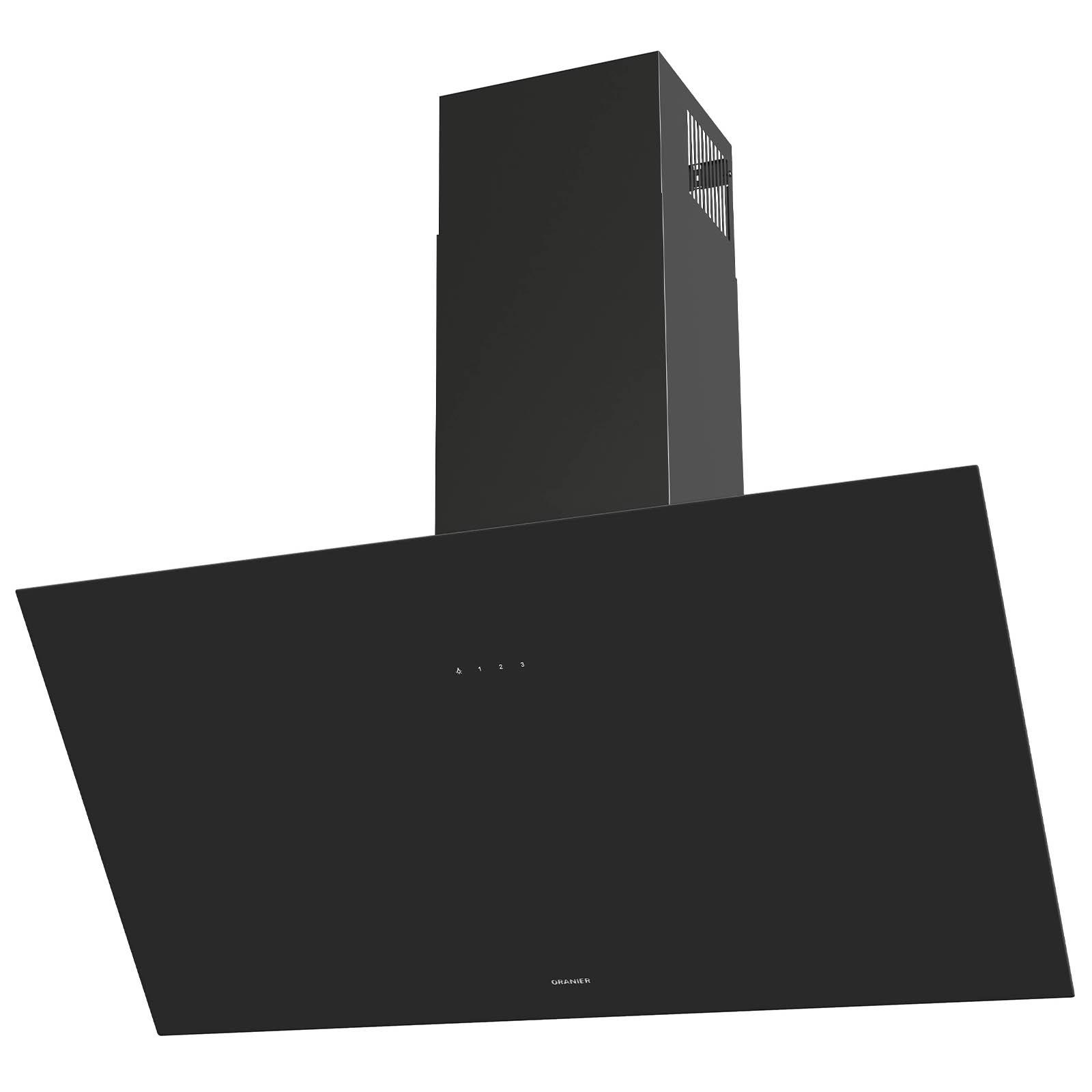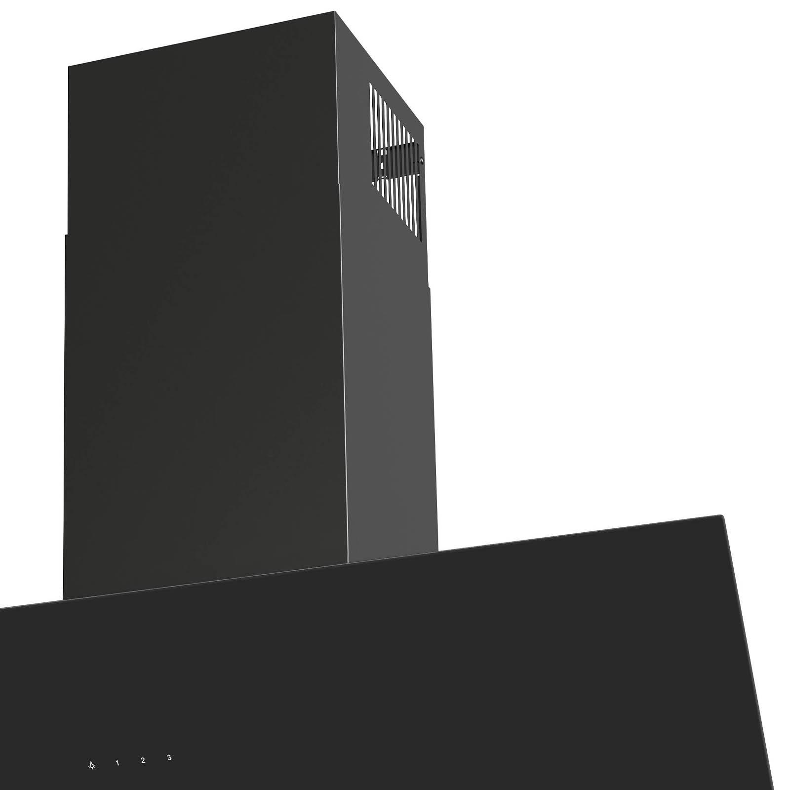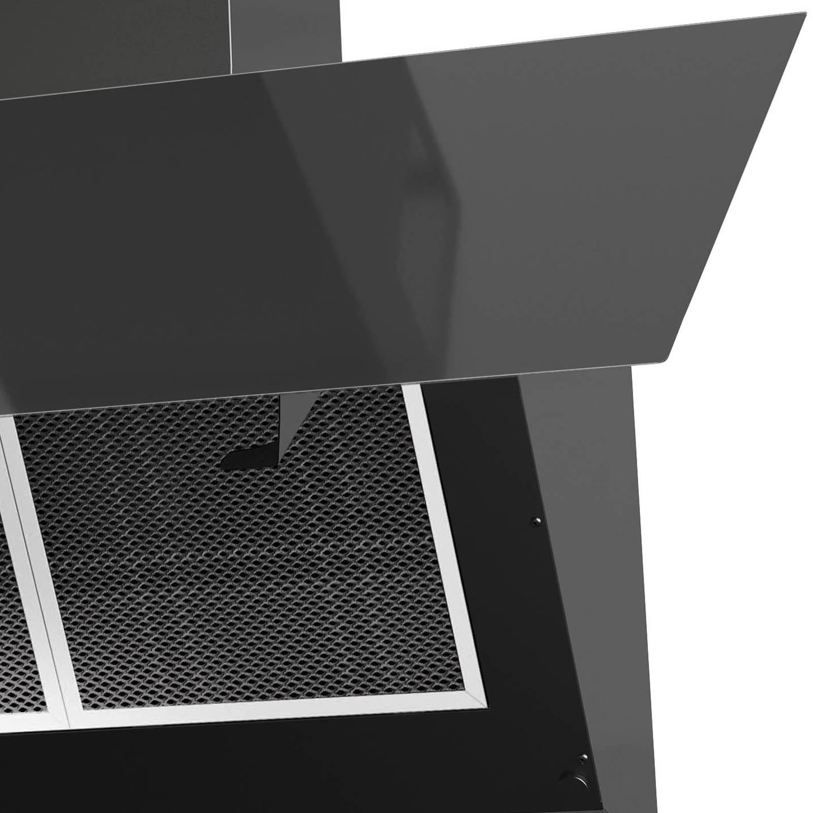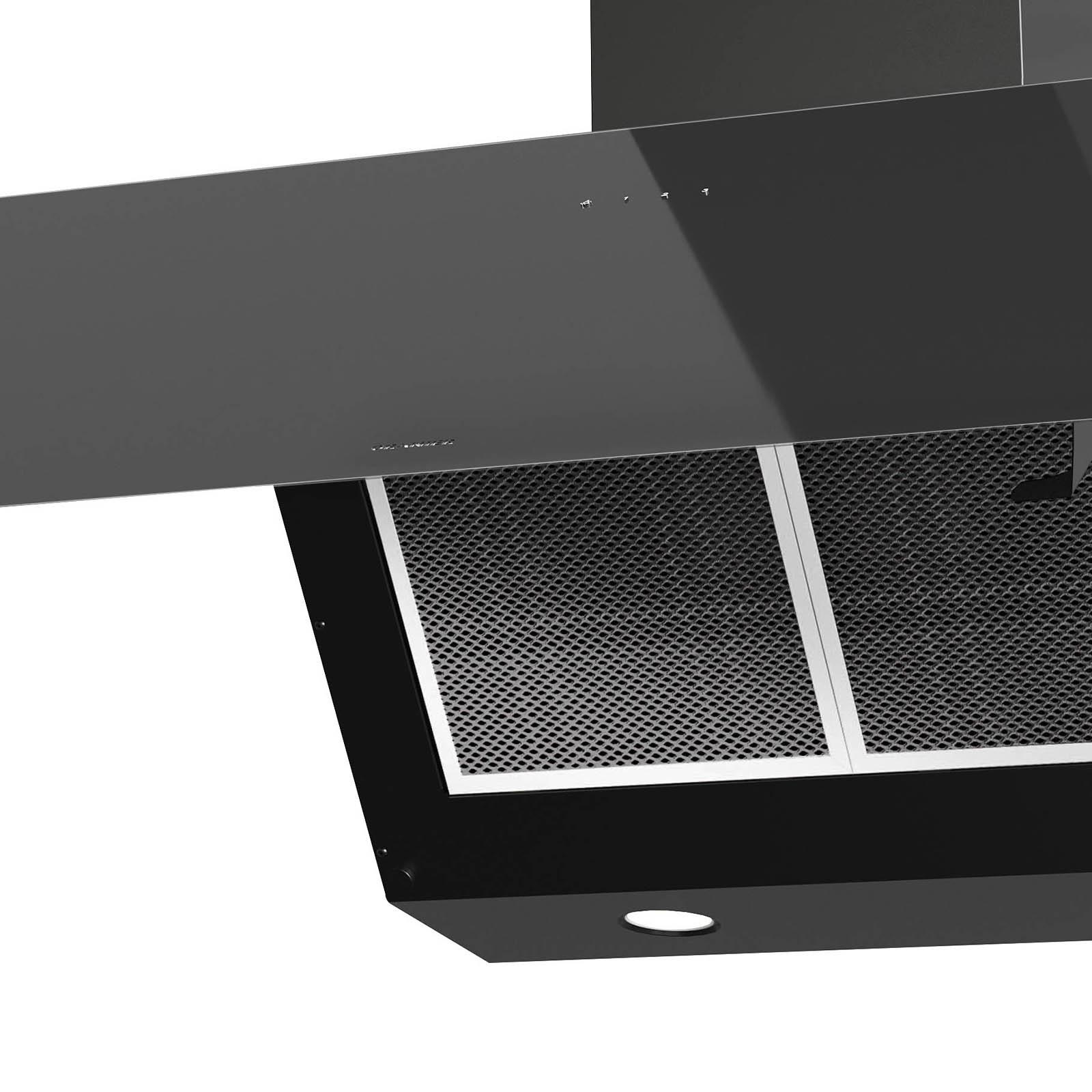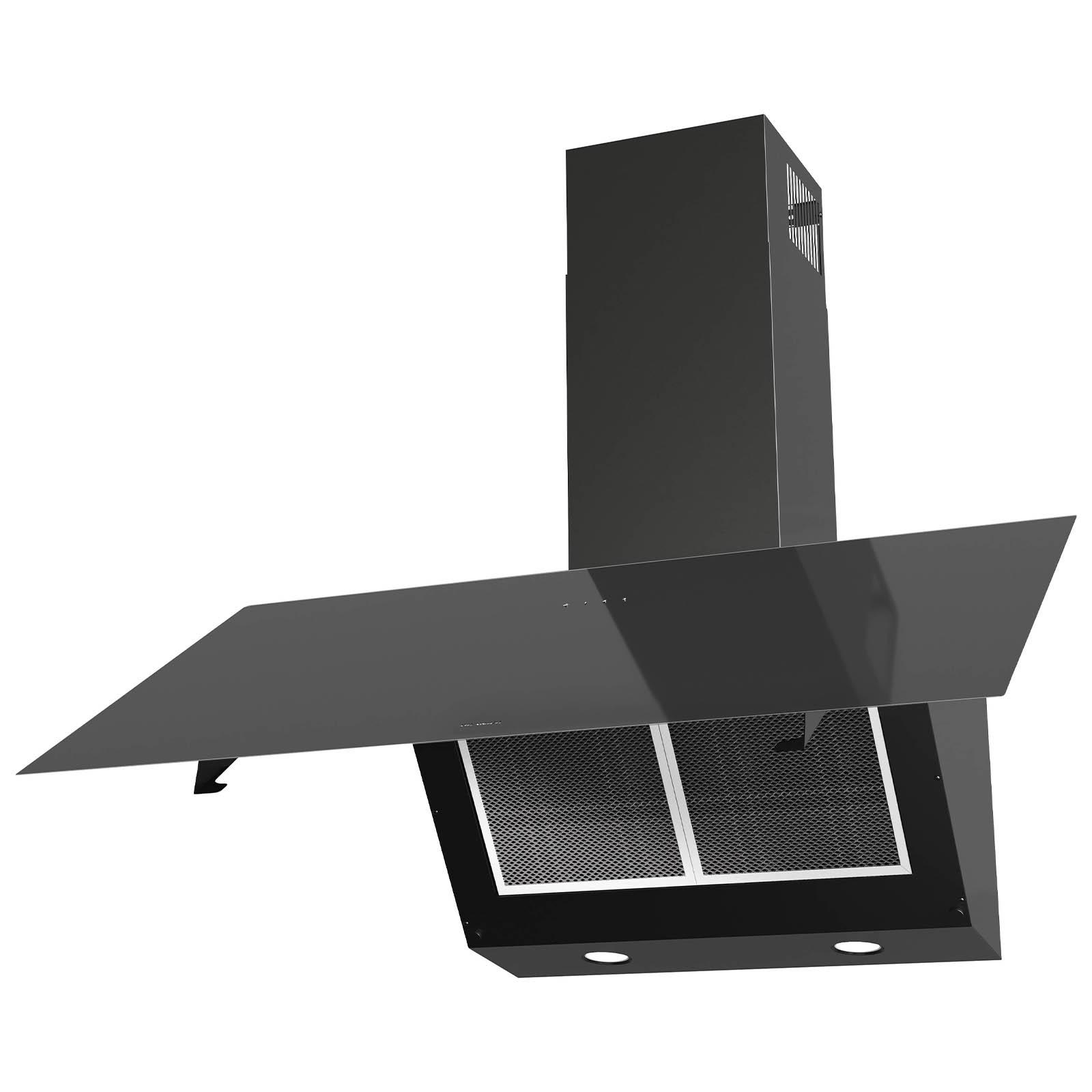 ✓ Schwarze 90 cm breite kopffreie Wandhaube mit Touch Control Bedienung und Sicherheitsglas-Schirm ✓ Abluft Schräghaube mit 3 normalen Leistungsstufen, weißer LED Anzeige und 2facher LED Beleuchtung ✓ Dunstabzugshaube mit klappbarer Front aus Glas, Serviceöffnung mit Scharnieren und Randabsaugung ✓ Breite 90er und LED beleuchtete Kopffreiwandhaube inklusive schwarzem Schacht im schrägen Design ✓ Die schwarz lackierte Wanddunsthaube verfügt über einen spülmaschinengeeignetem Metallfettfilter