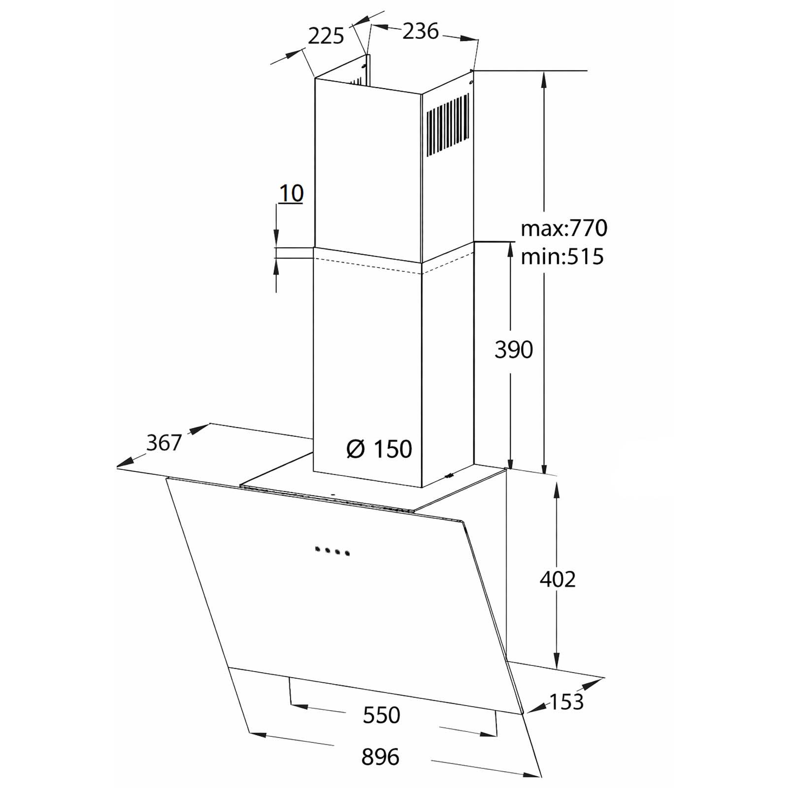 • EEK: B • EEK-Bereich: A+++-D • Gerätebreite: 90 cm • Breite: 896 mm • Höhe: 402 mm • Tiefe: 367 mm • Farbe: schwarz • Material: Edelstahl • Material Oberfläche: Glas • Bedienung: Touch-Control-Bedienung • Betrieb: Abluft • Ausführung: kopffrei - wandhängend • Installationsart: Wandmontage • Leistungsstufen: 3 • Besonderheit: mit schwarzem Schacht • Design: Ablufthaube