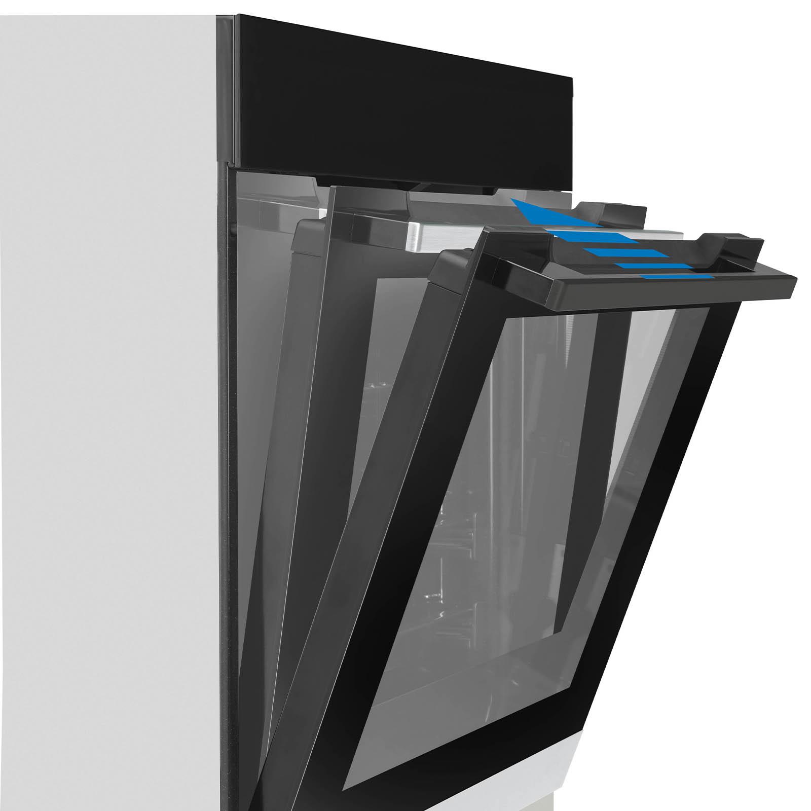 Jegliches Zubehör wie das Backblech, der Rost und die Reling nach jeder Benutzung einfach per Handwäsche spülen und danach gut abtrocknen. Dank der fugenlosen Ganzglas-Türinnenscheibe mit schwarzem Top-Cover lässt sich dieser Einbaubackofen einfach und schnell reinigen.