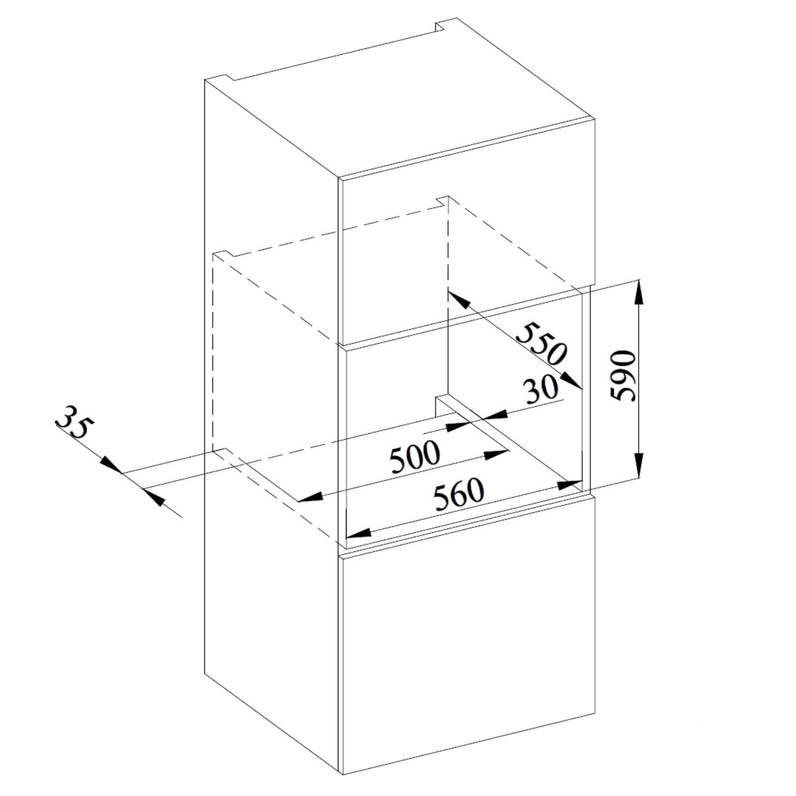 Die Ebene 1 des Backofens ist nicht zur Verwendung von Teleskop-Vollauszügen geeignet. Bitte achten Sie darauf, dass das Küchenmöbelmaterial hitzebeständig sein muss. Der schwarze 60 cm Backofen muss zu den Küchenmöbelwänden zentriert und mit den mitgelieferten Schrauben und Buchsen befestigt werden. Die Standfläche in der Nische muss zur Wand hin (ohne Rückwand des Schrankes) eine Aussparung von mindestens 500 x 35 mm aufweisen!