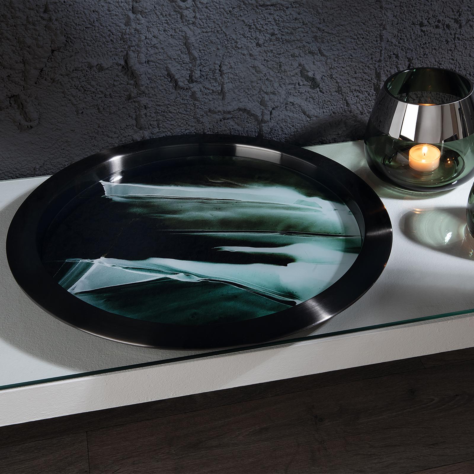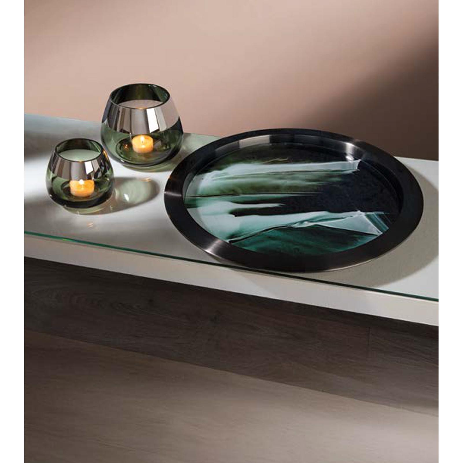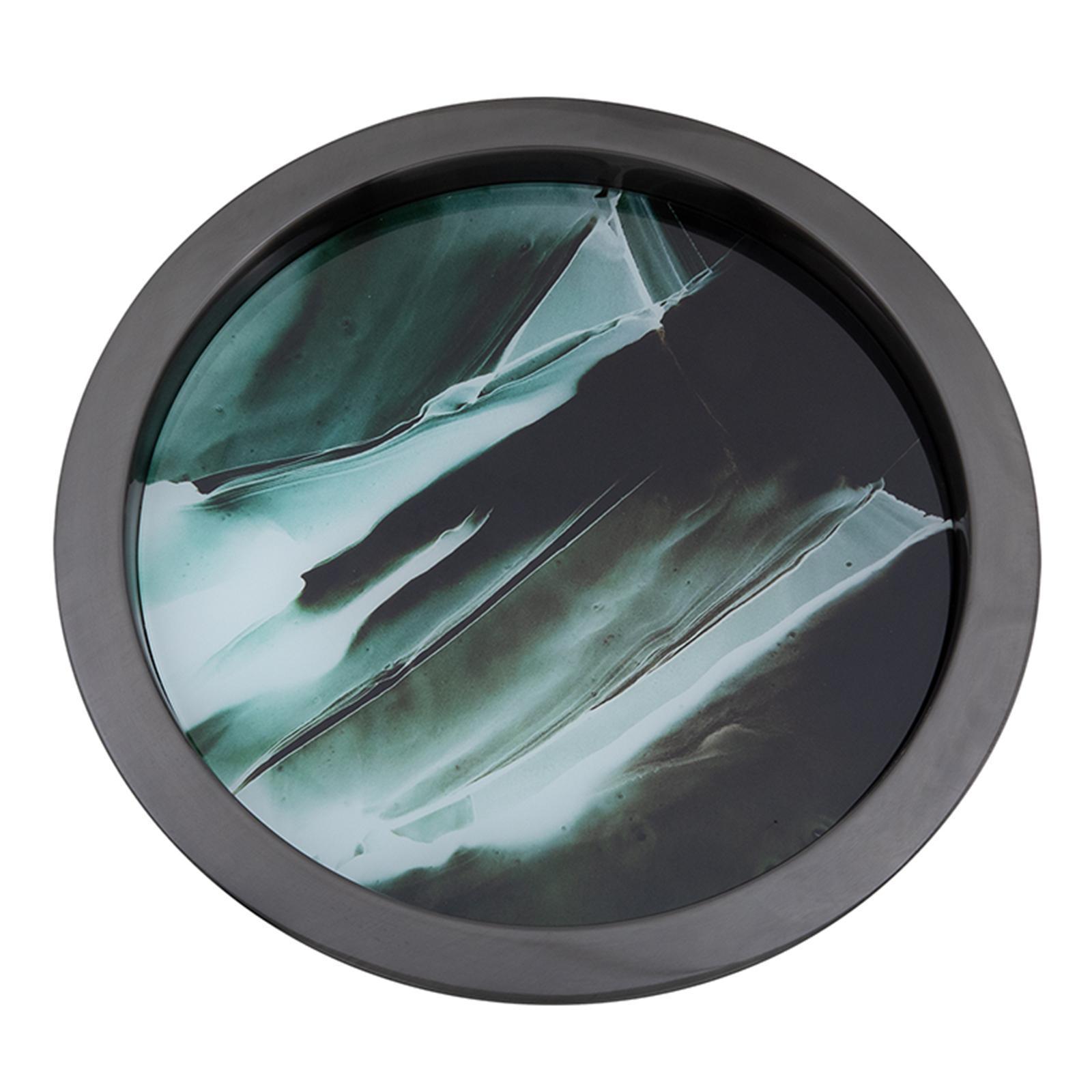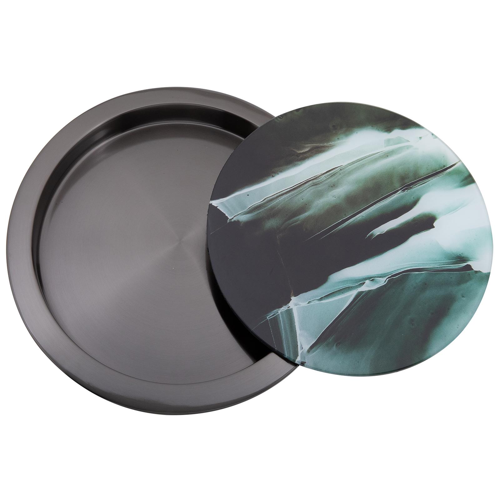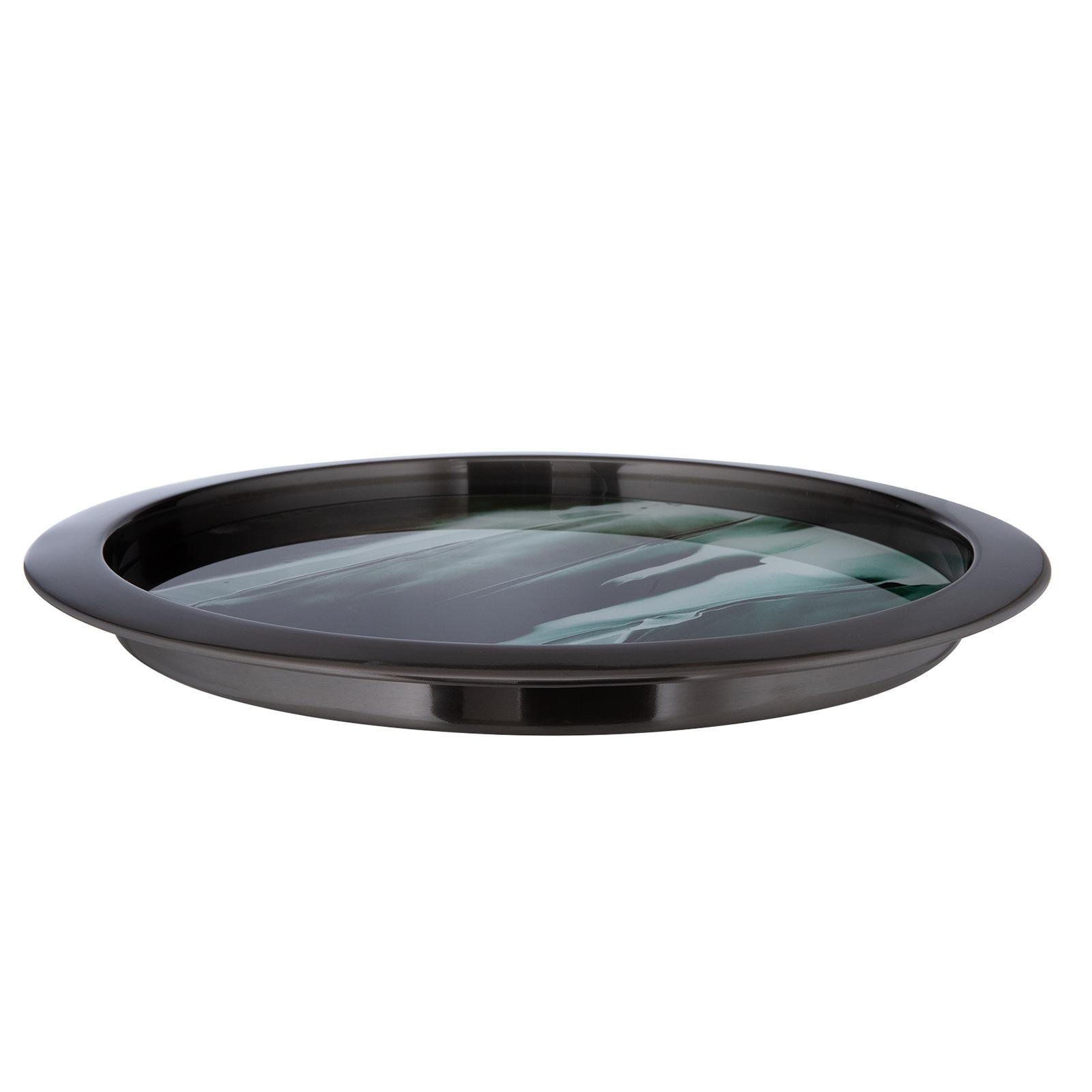 ✓ Serviertablett mit Glaseinlage und Edelstahlrahmen für markante Akzente auf dem Tisch & Sideboard ✓ Rundes Tablett mit herausnehmbarer Platte aus Glas und einer eleganten Maserung in Grün-Schwarz ✓ Mit einem Durchmesser von ca. 40,5 cm großzügig dimensioniert für Gläser, Karaffen oder Dekoration ✓ Der dunkle Edelstahlrand mit 2,5 cm Höhe sorgt für ein gutes Handling beim Servieren von Getränken ✓ Design Deko Tablett kombinierbar mit Holz, Glas oder Porzellan für moderne Tisch- & Raumgestaltung