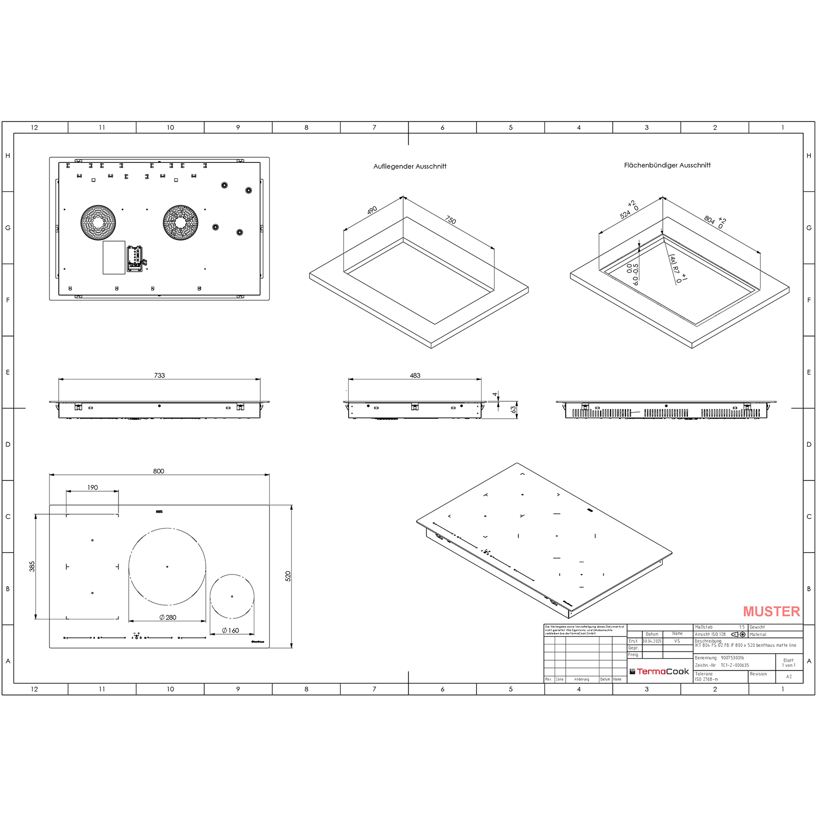 Für die Montage kann das Kochfeld sowohl aufliegend als auch flächenbündig in die Arbeitsplatte integriert werden. Es ist ein ausreichender Abstand unterhalb des Gerätes sowie zu angrenzenden Bauteilen einzuplanen, um eine sichere Luftzirkulation zu gewährleisten. Die Gerätemaße betragen 800 x 63 x 520 mm, bei einem erforderlichen Ausschnitt von 750 x 490 mm. Der Anschluss erfolgt über ein vormontiertes Kabel.