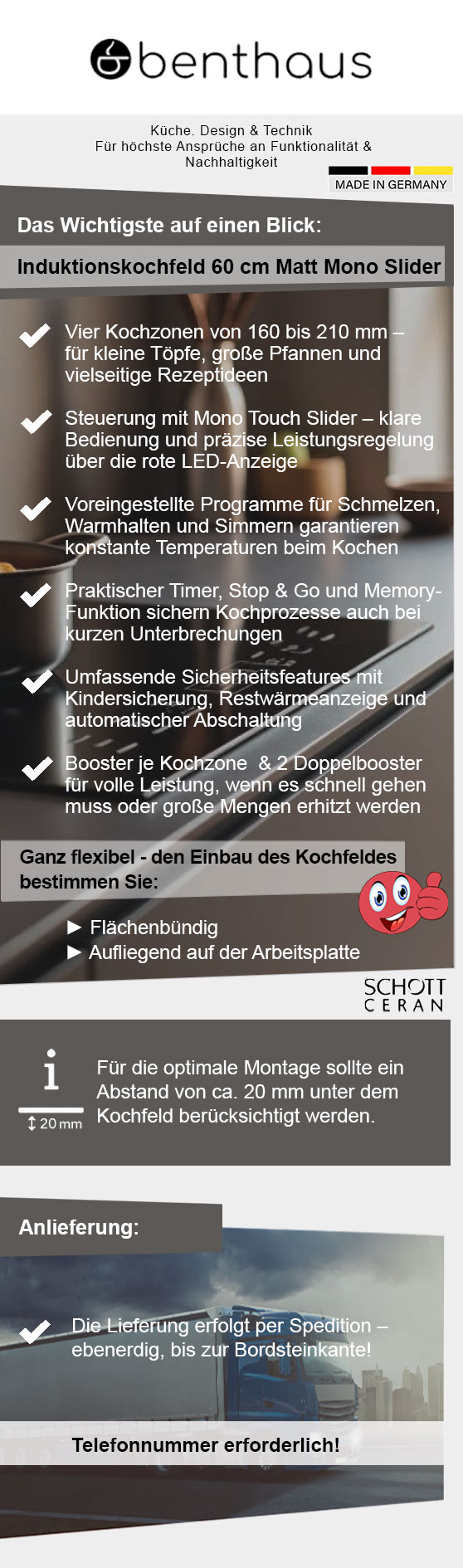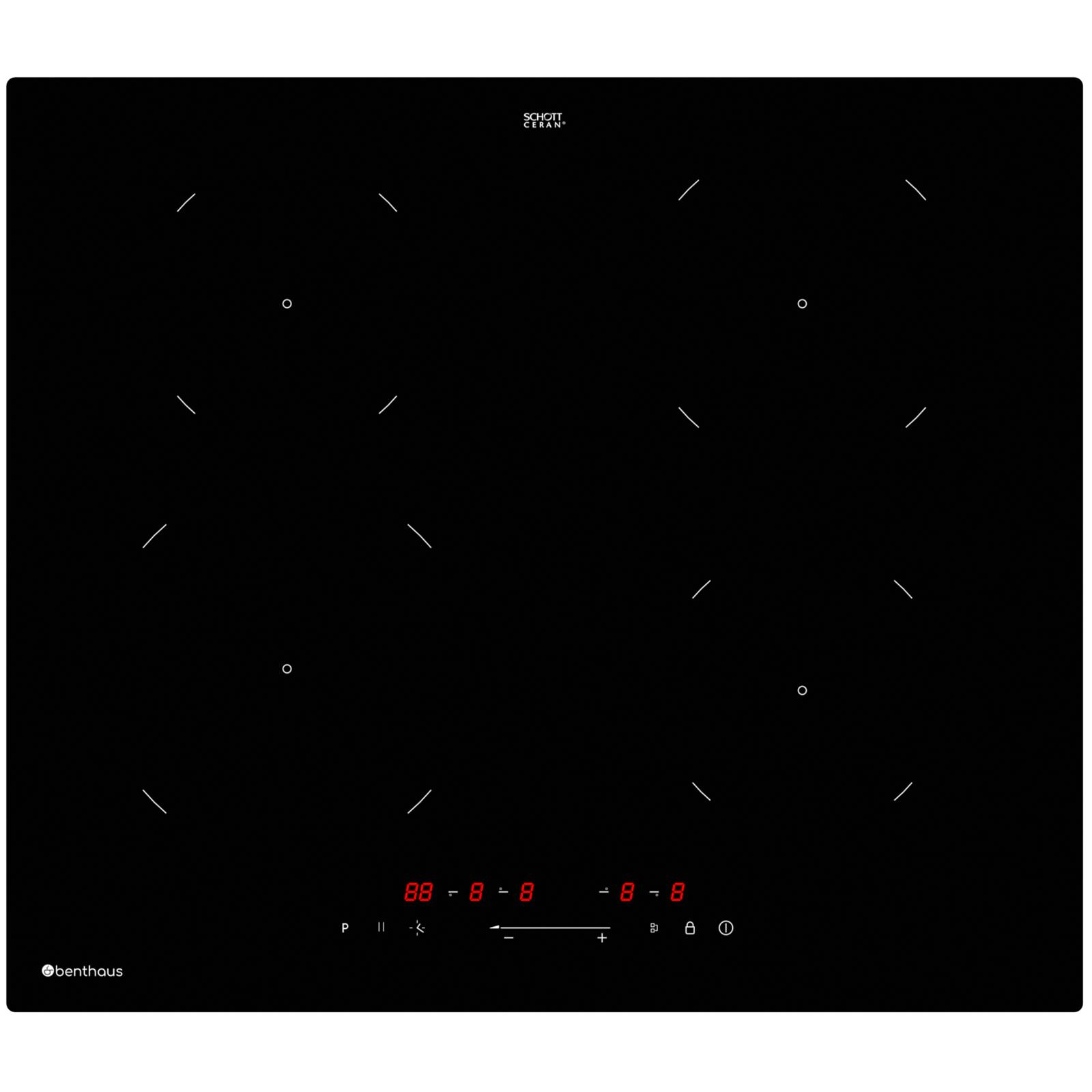 Benthaus mattes Induktionskochfeld 60 cm autark - Glaskeramik mit Mono Slider, LED-Anzeige, Timer & Memory-Funktion