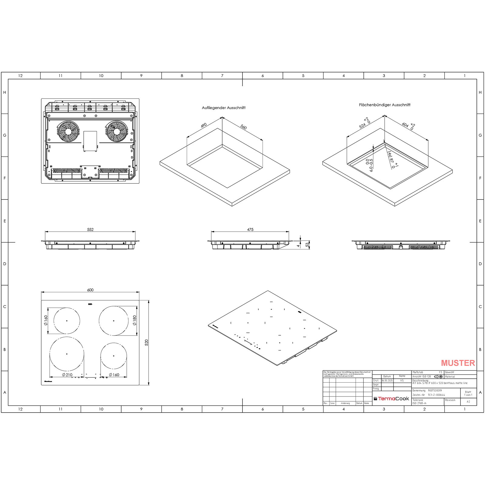 Das Kochfeld kann sowohl aufliegend als auch flächenbündig eingebaut werden. Für eine sichere Installation ist ein ausreichender Abstand unterhalb des Gerätes sowie zu angrenzenden Bauteilen erforderlich, um eine zuverlässige Wärmeabfuhr zu gewährleisten. Die Gerätemaße betragen 600 x 53 x 520 mm, bei einem Ausschnittmaß von 560 x 490 mm. Eine Unterschrankbreite von 600 mm ist vorgesehen. Der Anschluss erfolgt über ein vormontiertes Kabel.