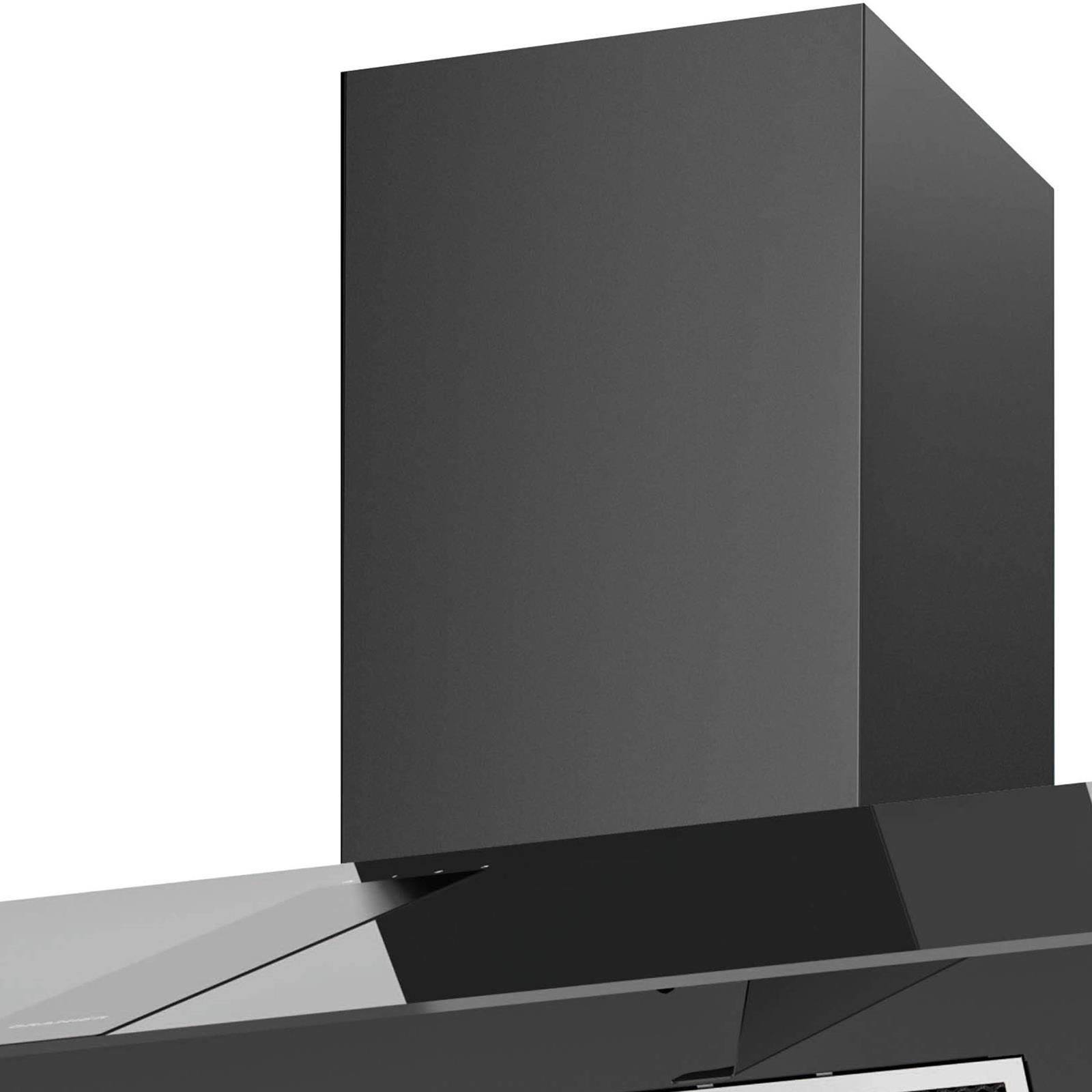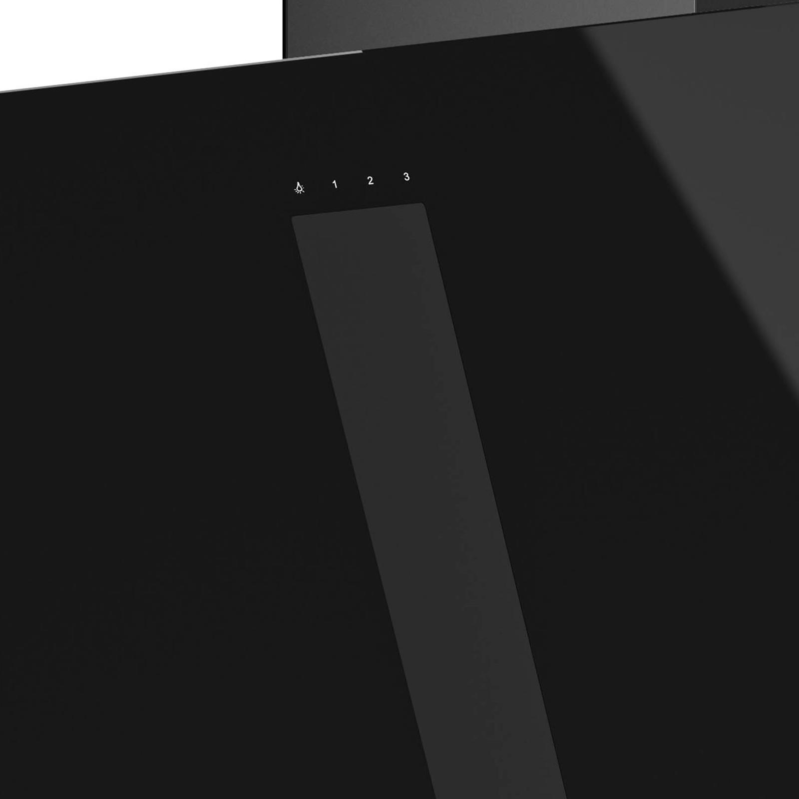 • EEK: B • EEK-Bereich: A+++-D • Gerätebreite: 90 cm • Breite: 896 mm • Höhe: 455 mm • Tiefe: 392 mm • Farbe: schwarz • Material: Edelstahl • Material Oberfläche: Glas • Bedienung: Touch-Control-Bedienung • Betrieb: Abluft • Ausführung: kopffrei - wandhängend • Installationsart: Wandmontage • Leistungsstufen: 3 • Besonderheit: mit schwarzem Schacht • Design: Ablufthaube