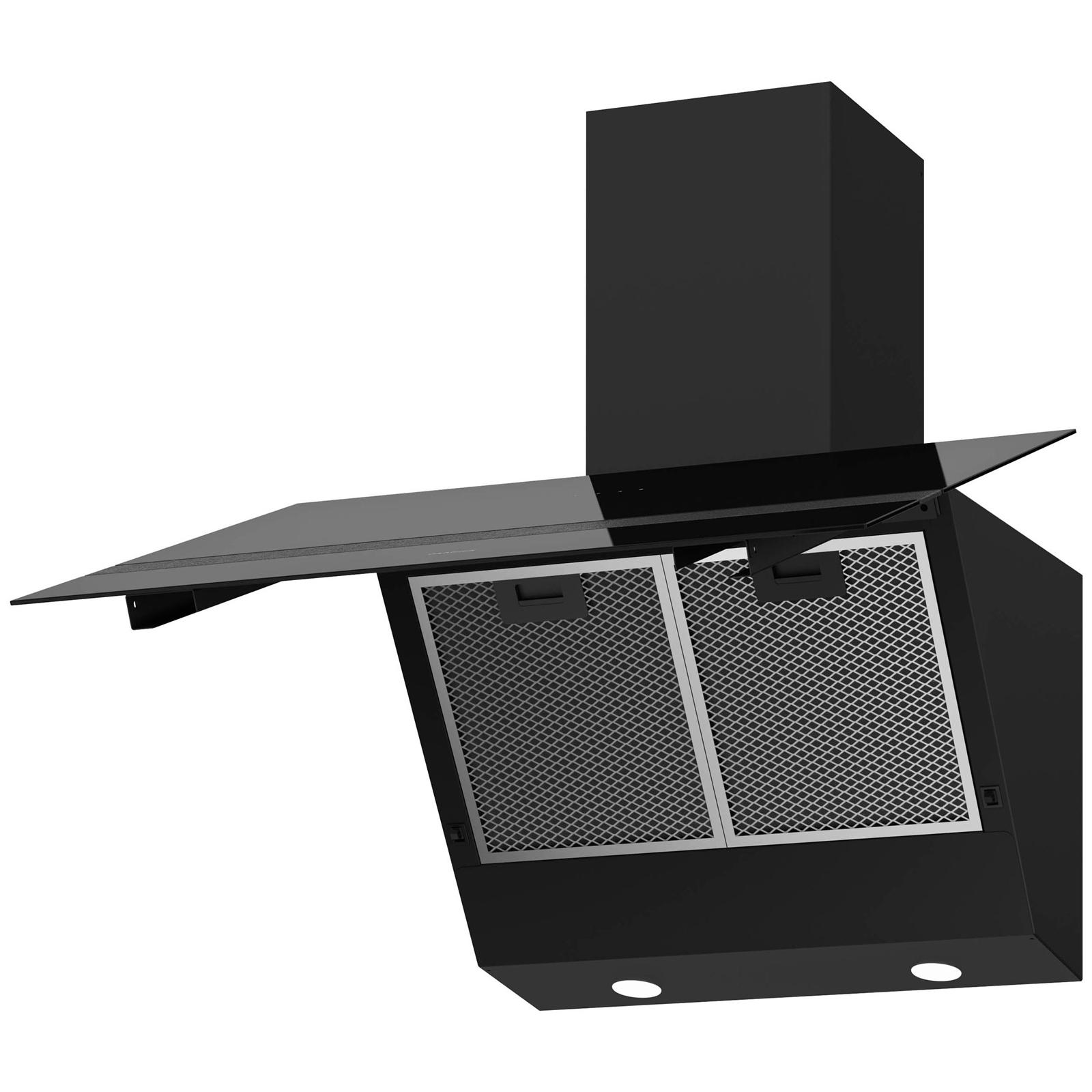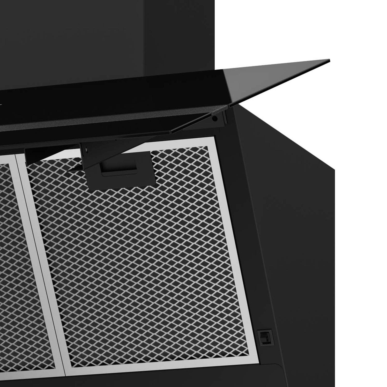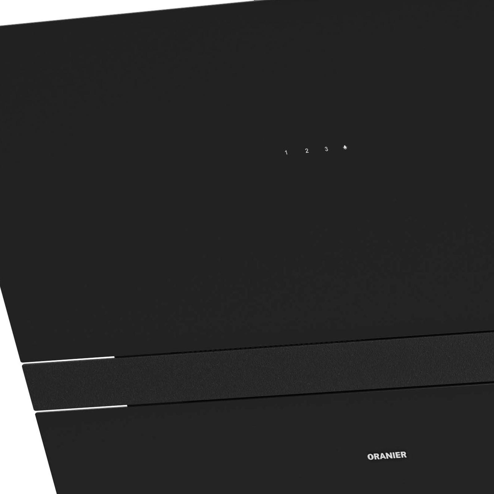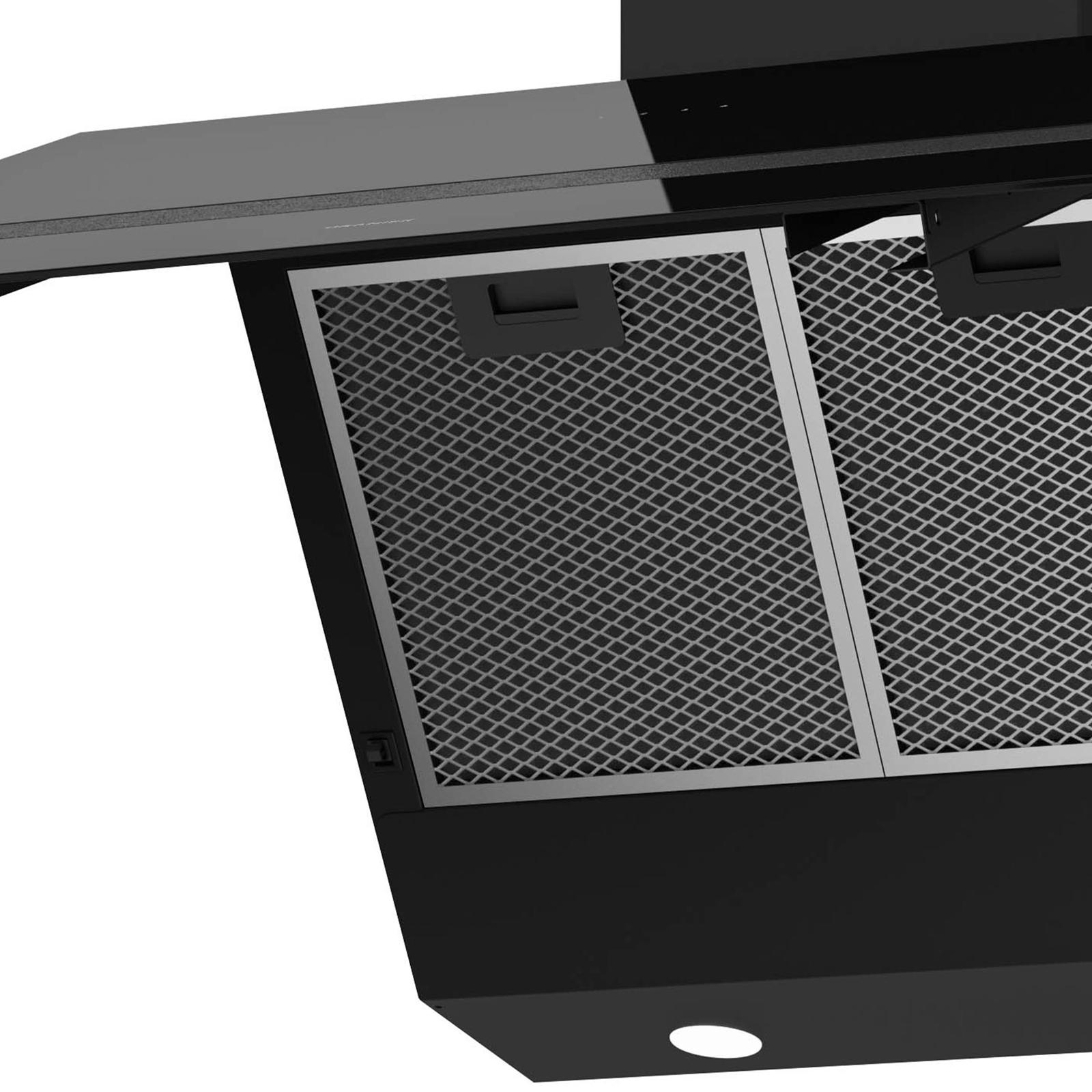Produkt-Eigenschaften ✓ Dunstabzugshaube mit schwarzer Glasfront in schräger Form und Zierleiste - für freie Sicht am Kochfeld