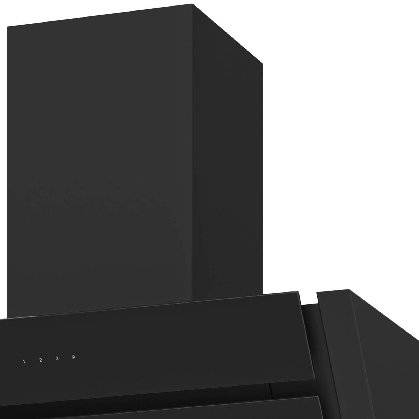 • EEK: B • EEK-Bereich: A+++-D • Gerätebreite: 75 cm • Breite: 746 mm • Höhe: 449 mm • Tiefe: 390 mm • Farbe: schwarz • Material: Edelstahl • Material Oberfläche: Glas • Bedienung: Touch-Control-Bedienung • Betrieb: Abluft • Ausführung: kopffrei - wandhängend • Installationsart: Wandmontage • Leistungsstufen: 3 • Besonderheit: mit schwarzem Schacht • Design: Ablufthaube