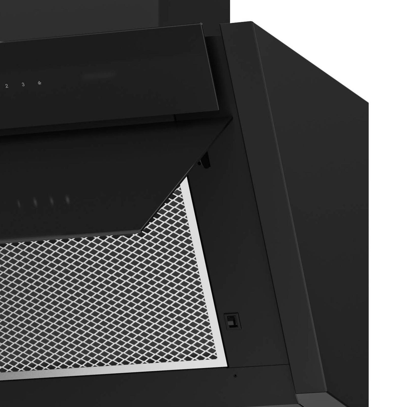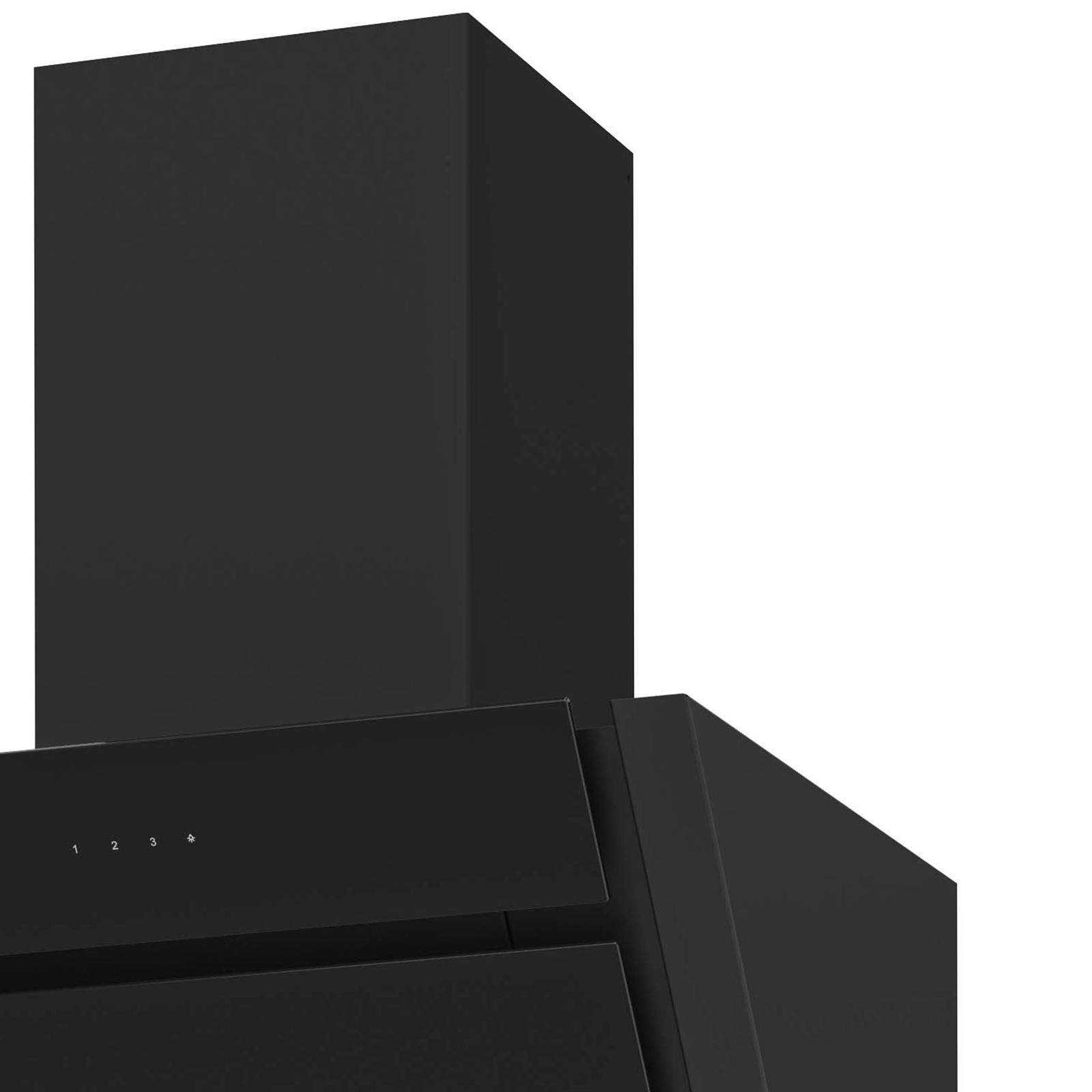 • EEK: B • EEK-Bereich: A+++-D • Gerätebreite: 60 cm • Breite: 596 mm • Höhe: 449 mm • Tiefe: 390 mm • Farbe: schwarz • Material: Edelstahl • Material Oberfläche: Glas • Bedienung: Touch-Control-Bedienung • Betrieb: Abluft • Ausführung: kopffrei - wandhängend • Installationsart: Wandmontage • Leistungsstufen: 3 • Besonderheit: mit schwarzem Schacht • Design: Ablufthaube