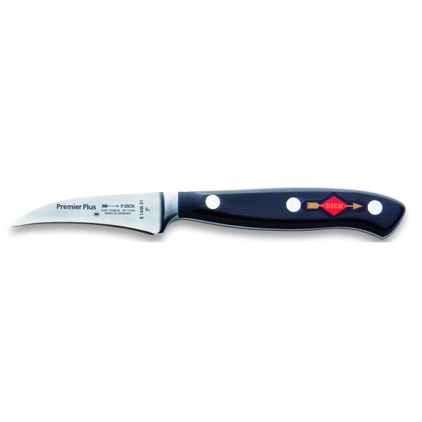 Qualitätsmesser Made in Germany von Fr. Dick - Qualität, die man spüren und auf die man sich verlassen kann - von Profis für Profis. Das handliche Schälmesser, dessen geschmiedete Messerklinge aus speziellen, hochlegierten und ausgewogenen Materialen zusammen gesetzt ist, stammt aus der traditionellen Serie Premier Plus, ein griffiges Küchenmesser für den universellen Einsatz beim Schälen von Gemüse und Obst. Angesichts einer besonderen Herstellung des Profi Messers, ist der hygienische Kunststoffgriff mit der polierten Klinge fest und ohne Spalt zusammengefügt. Die 7 cm lange gebogene Messerklinge ist auf das Höchste an Schärfe ausgelegt, um Ihren Anforderungen beim Schälen gerecht zu werden. Der Vorteil der geschwungenen Klinge dieses Messers zum Schälen ist, dass diese sich ideal an das Schneidgut angleicht und im Handumdrehen ein vorteilhaftes Arbeiten gewährleistet. Dank der außergewöhnlichen Messerspitze des Vogelschnabelmessers entfernen Sie mühelos und einfach unerwünschte Stellen am Gemüse oder Obst.