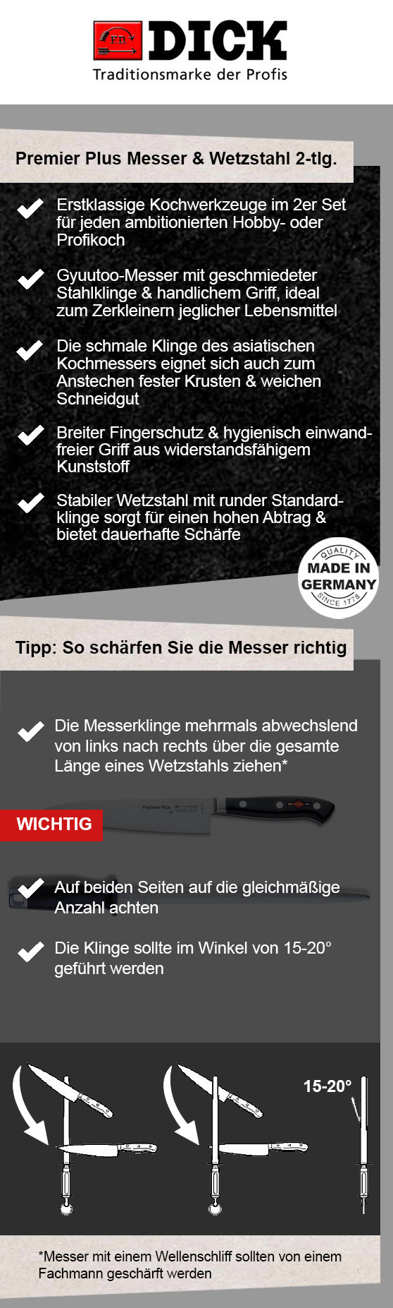 Qualitätsmesser im Set inkl. Wetzstahl Made in Germany von Fr. Dick - Qualität, die man spüren und auf die man sich verlassen kann - von Profis für Profis. Das ausgewogene Kochmesser, dessen breite geschmiedete Messerklinge aus speziellen, hochlegierten und ausgewogenen Materialen zusammen gesetzt ist, stammt aus der traditionellen asiatischen Serie Premier Plus Eurasia, ein unerlässliches Allzweckmesser für den universellen Einsatz beim Schneiden und Zerlegen von Fleisch, Gemüse oder Fisch. Angesichts einer besonderen Herstellung des Profi Messers, ist der hygienische Kunststoffgriff mit der polierten Klinge fest und ohne Spalt zusammengefügt. Die 18 cm lange polierte asiatische Messerklinge ist auf das Höchste an Schärfe ausgelegt, um Ihren Anforderungen beim Schneiden gerecht zu werden. Der Vorteil der schlanken, scharfen Klinge dieses Asia Küchenmessers ist, dass diese sich auch zum Hacken oder Wiegen von Kräutern eignet und im Handumdrehen ein vorteilhaftes Arbeiten gewährleistet. Dank der Vielseitigkeit darf das Allroundmesser in keiner Küche fehlen. Mit dem im Set enthaltenden kleinen Messerschärfer, dessen Griff aus hochwertigen hygienischem Kunststoff besteht, erreichen Sie dank des Standardzuges ein beeindruckendes Schleifergebnis sowie einen einheitlichen und hohen Abtrag. Durch die runde 25 cm lange Klingenform mit einer Härte von 65° HRC lässt sich der Wetzstahl mit Standardschliff auffallend leicht und vorteilhaft führen, die Messerklinge liegt beim Schleifen punktuell auf dem Wetzstahl auf. Aufgrund der Edelstahl-Öse kann der Messerschleifer problemlos aufgehangen werden.