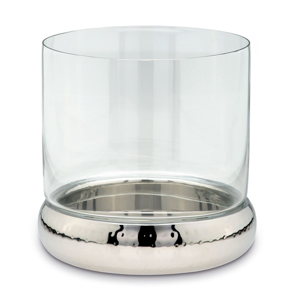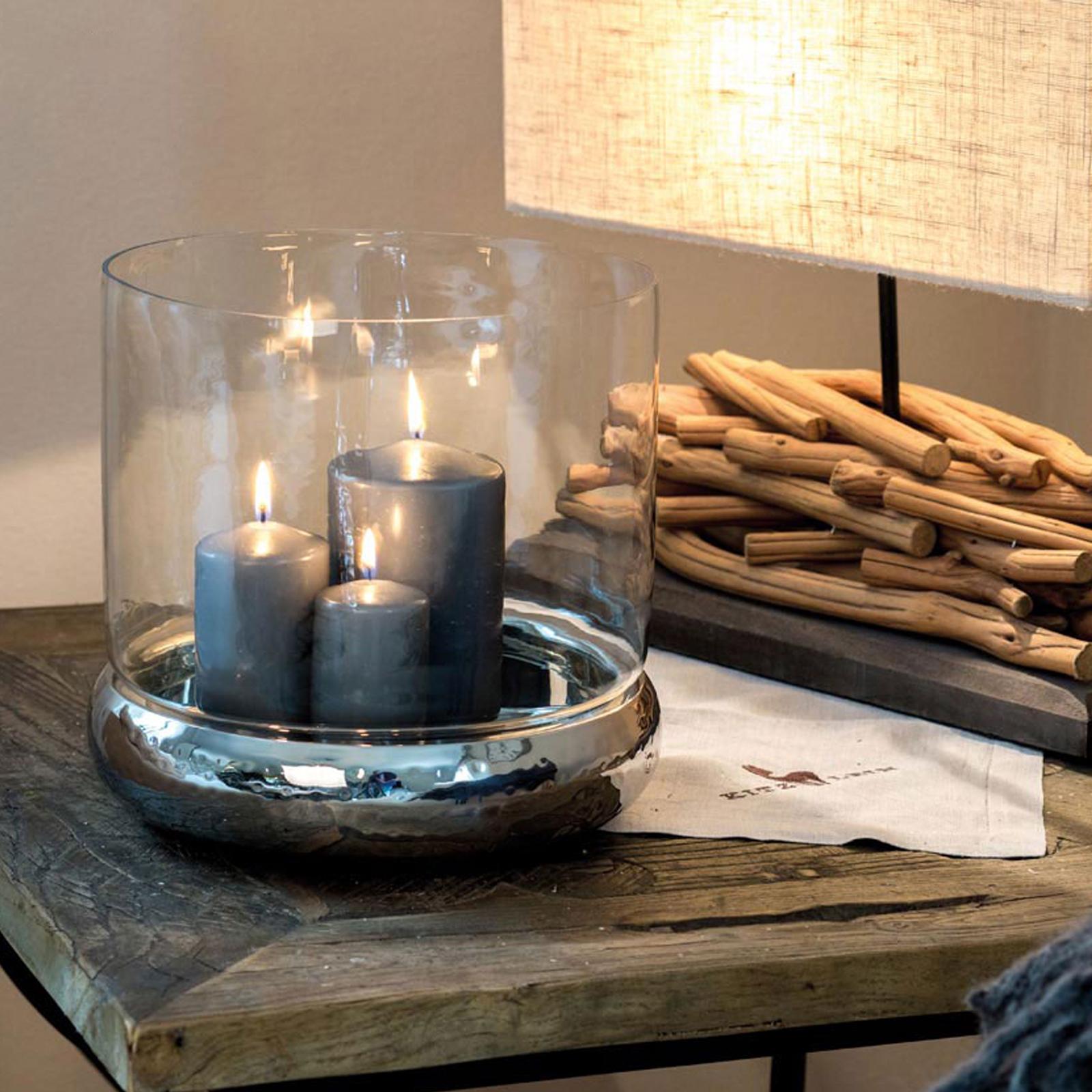 • Höhe ca.: 24 cm • Durchmesser ca.: 24 cm • Detailmaß ca.: Glaszylinder Ø oben 23.8 cm/unten 20.5 cm / 19.7 cm hoch • Kapazität: für 1 Stumpenkerze • Material: Glas • Material 1: Edelstahl • Oberfläche: glatt poliert • Oberfläche Details: gehämmert • spülmaschinengeeignet: ja • Farbe: silber • Eigenschaft: Glaszylinder abnehmbar • Ausstattung: 1 Kerzenhalter • Ausstattung 1: versilberter runder Standfuß • Ausstattung 2: Schutzglas • Funktionalität: Zum Dekorieren und Beleuchten mit Kerzen • Platzierungsart: zum Aufstellen • Form: rund • Dimension: groß • Symbolik: Symbol für Lichtschutz, Achtsamkeit & stilvolle Ruhe • Look & Stil: Beruhigend geformt, klar strukturiert & zurückhaltend edel • Umgebungsnutzung: Für Innenbereich und geschützten Außenbereich • Anlass: Für Wohndeko, Tischdeko, Präsent, Licht, Geschenk, Stil • Nutzungsbereich: Esstisch, Fensterbank, Sideboard, Empfang, Wohnzimmer, Regal • Nutzungsmöglichkeit: Kerze geschützt einsetzen, Licht betonen, Stimmung erzeugen • Gewicht ca.: 2,21 Kg