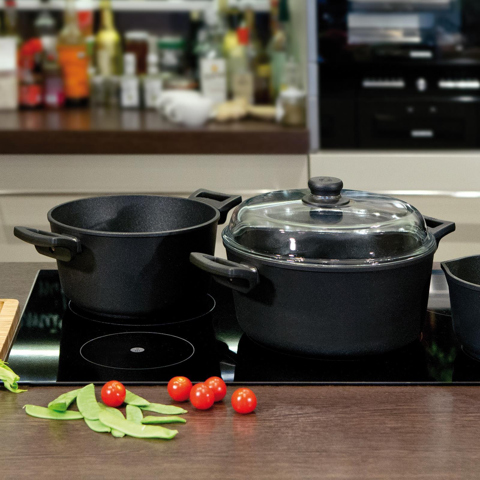 Der große 17 cm hohe Jumbo-Universalkochtopf aus schwarzen Alu-Guss mit einer Größe von Ø 28 cm für 8.5 Liter und die 12.5 cm hohe Küchentopf-Kasserolle Ø 24 cm für 4.5 Liter eignen sich zum Kochen von Gemüse, Beilagen wie Nudeln, Kartoffeln, Reis. Auch leckere Eintöpfe, Suppen und Fleischeinlagen wie herzhaftes Gulasch und Geschnetzeltes können mit Freude und Begeisterung in den tiefen Töpfen mit hohen Rand zubereitet werden.