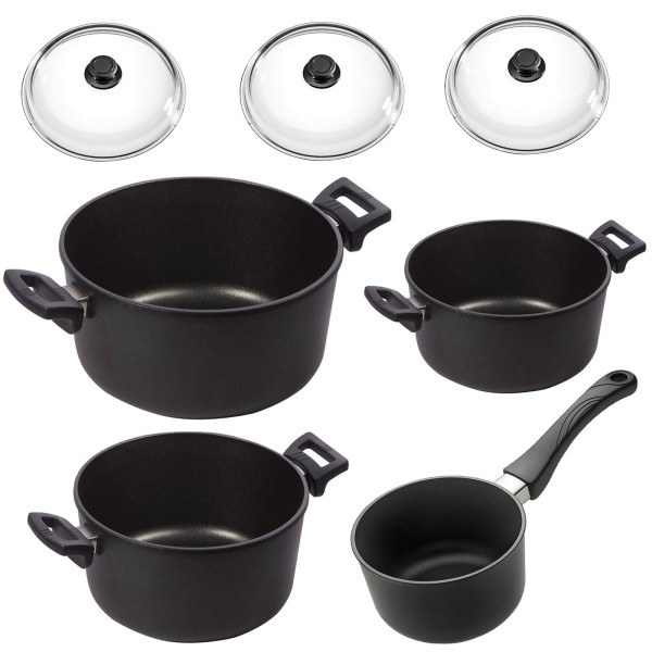 Sie erhalten zu diesem 7-teiligen Aluguss Topf-Set 3 passende Vollglas-Deckel (der Ø 18 cm Stieltopf wird ohne Deckel geliefert), die hochwertigen, antihaftbeschichteten Töpfe ohne Induktion sind aus robustem, langlebigen Aluguss - Made in Germany - hergestellt, welche auch außergewöhnlichen Beanspruchungen in Ihrer Küche standhalten. Aufgrund der stabilen ca. 9 mm starken, glanzgedrehten Thermoböden der Kochtöpfe erreichen Sie bei diesem 7-tlg. beschichteten Kochtopf-Set eine gleichmäßige Hitzeverteilung und eine sehr gute Wärmespeicherung. Sie bekommen mit diesem Antihaft Kochtöpfen beim Kochen, Köcheln oder Aufwärmen einen optimalen Garprozess, ohne lästiges Anbrennen oder Anhaften. Der Vorteil: Dank der Topfdeckel aus Glas, wird ein Entweichen von Aromen oder Gerüchen verhindert, die Flüssigkeiten zirkulieren am Deckel, verbleiben in den Gusstöpfen und die Geschmacksstoffe bleiben erhalten. Das antihaftveredelte Guss-Topf-Set inklusive Stielkasserolle ist für alle Herdarten wie Glaskeramikkochfelder, Gaskochfelder und Elektrokochfelder ohne Induktion nutzbar. Das Alugusstopf-Set mit abriebfester LuxTec® - Antihaftbeschichtung eignet sich ideal für gesünderes und fettarmes Kochen mit wenig oder sogar ohne Fett oder Öl. Das mehrteilige Topfset aus Guss und die Deckel sind zudem spülmaschinengeeignet, backofenfest, bis zu 240° Grad hitzebeständig und leicht zu reinigen.