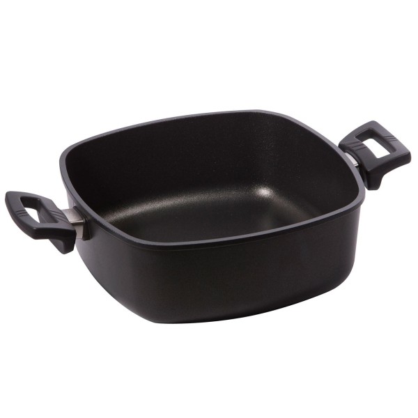 Dieser große, nicht-induktionsgeeignete Aluguss Eck-Bratentopf 28x28 cm mit 6.0 Liter Fassungsvermögen macht beim täglichen Kochen in der heimischen Küche eine gute Figur. Dieser klassische Viereck-Schmortopf ist nahezu für jede Zubereitung von Mahlzeiten verwendbar, insbesondere welche scharf angebraten oder geschmort werden.
