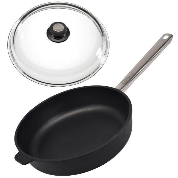 Die große induktionsgeeignete Aluguss-Gastro Schmorpfanne Ø 28 cm mit langem, festmontierten Stiel aus Edelstahl und Gegengriff ist im Besonderen für den Profi Einsatz in Großküchen, in Hotels, in der Gastronomie oder auch in Restaurants geeignet. Auch beim täglichen Kochen, Braten oder Schmoren oder für die heimische Küchenausstattung macht diese Gusspfanne eine gute Figur. Der passende im Lieferumfang enthaltene runde Vollglasdeckel ist bis zu 240°C hitzebeständig sowie spülmaschinengeeignet und rundet dieses Set ab.