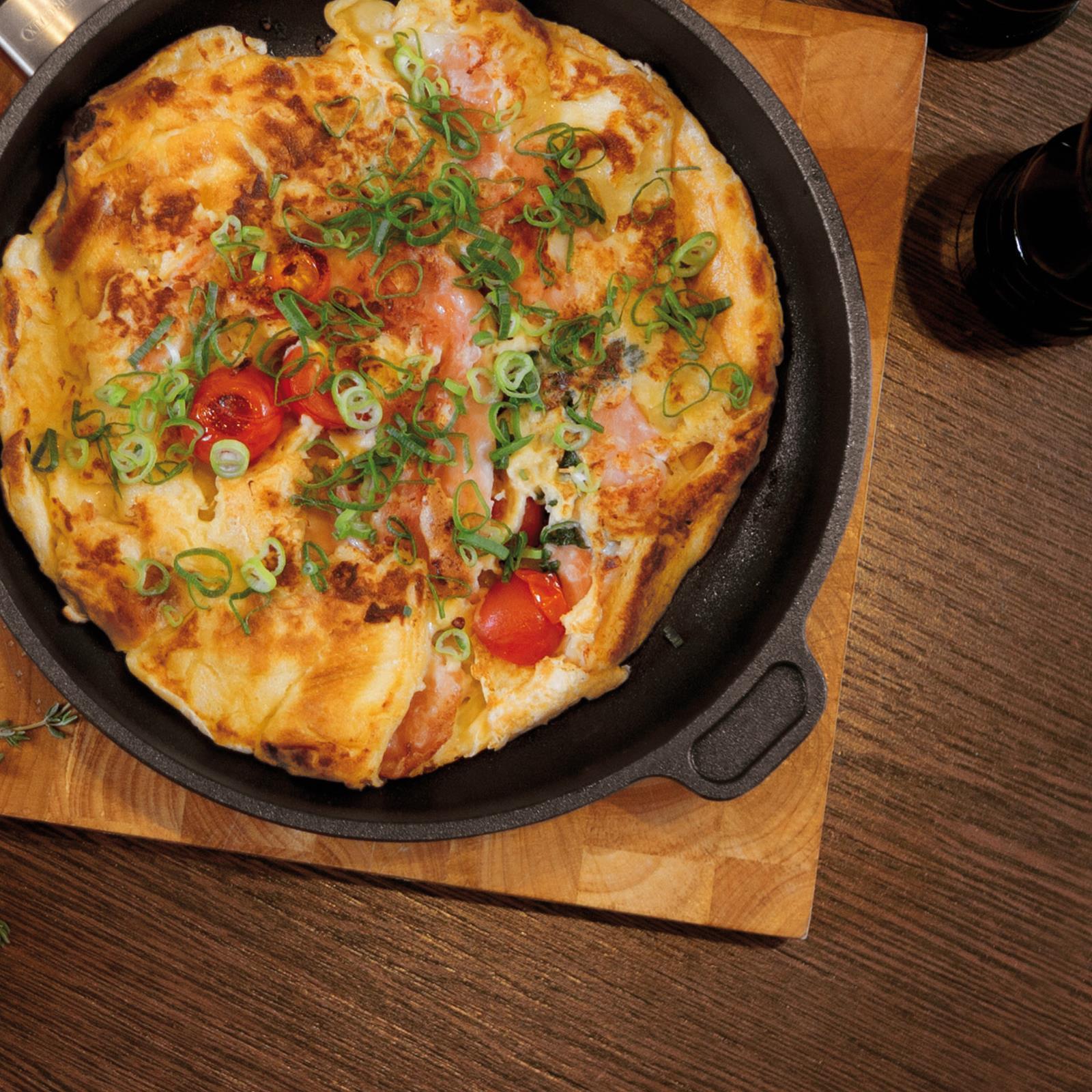 ✓ 7 cm hohe Gusspfanne mit 8-9 mm starkem Thermoboden, hoch erhitzbar und bis 240° C backofenfest