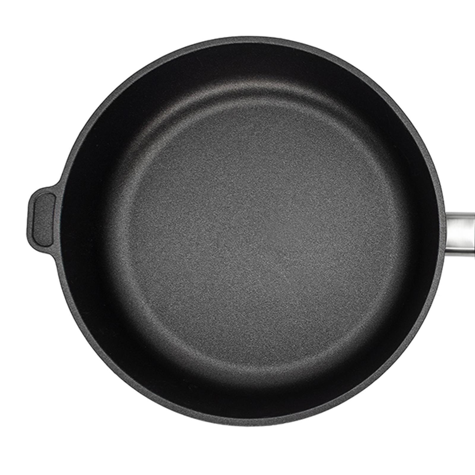Die kleine induktionsgeeignete Aluguss Hochrandpfanne mit Glasdeckel Ø 24 cm und Gegengriff macht beim täglichen Kochen, Braten oder Schmoren in der heimischen Küche eine gute Figur. Diese klassische Schmorpfanne mit Induktion ist hoch gehalten, damit Sie dem Bratgut problemlos Flüssigkeiten hinzufügen und somit eine Soße ziehen können.