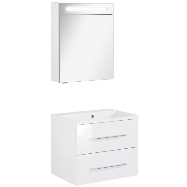 Das weiße Badmöbel Set bestehend aus einer weißen Waschkommode inkl. Gussmarmor Waschbecken und beleuchtetem Spiegelschrank ist platzsparend und bringt Ordnung in Ihr modernes Badezimmer. Auch wenn es mal schnell gehen muss, verstauen Sie einfach Ihre Utensilien in einer der zwei Platz bietenden Waschtischschubladen unter dem weißen Waschbecken und hinterlassen immer ein ordentliches Badezimmer in dem Sie sich wohlfühlen. Der schlicht designte Waschtisch mit passendem weißen Unterbau bietet dank der zwei eleganten Schubladen eine optimale Staumöglichkeit und Ablagefläche für Ihre Toilettenartikel direkt auf dem weißen Gussmarmor Waschbecken. Die Schubladen des Hochglanzweißen Badezimmer-Unterschranks verfügen über ein Soft-Close-System: Dieses gedämpfte Schließsystem der weißen Unterschrank-Schubladen sorgt auch bei morgendlicher Hektik für ein leises Schließen der geräumigen Schubfächer. Das Innere des kleinen 16cm tiefen Spiegelschranks ist mit zwei Einlegeböden aus Glas ausgestattet und bietet zusätzlich Platz für Zahnbürsten, Rasierer und andere Kosmetik. Für die optimale Beleuchtung in einem kleinen Badezimmer sorgt die energiesparende austauschbare LED-Blende, welche im schmalen weißen Spiegel integriert ist. Die Fronten des weißen Waschtisch Sets mit Unterbau und eintürigem LED Badezimmer Spiegelschrank mit Glasböden ist mit wasserfestem Polyurethanleim versehen und somit besonders wasserresistent. Die weiße Fassade der 60cm Badezimmer Einrichtung passt sich jedem Badezimmer an! Das helle 2-teilige Bad Set wird hängend montiert und erleichtert Ihnen die Reinigung des Badezimmerfußbodens unter dem hochwertigen Badmöbel Set inkl. Waschbecken. Einfach drunter her wischen und fertig!
