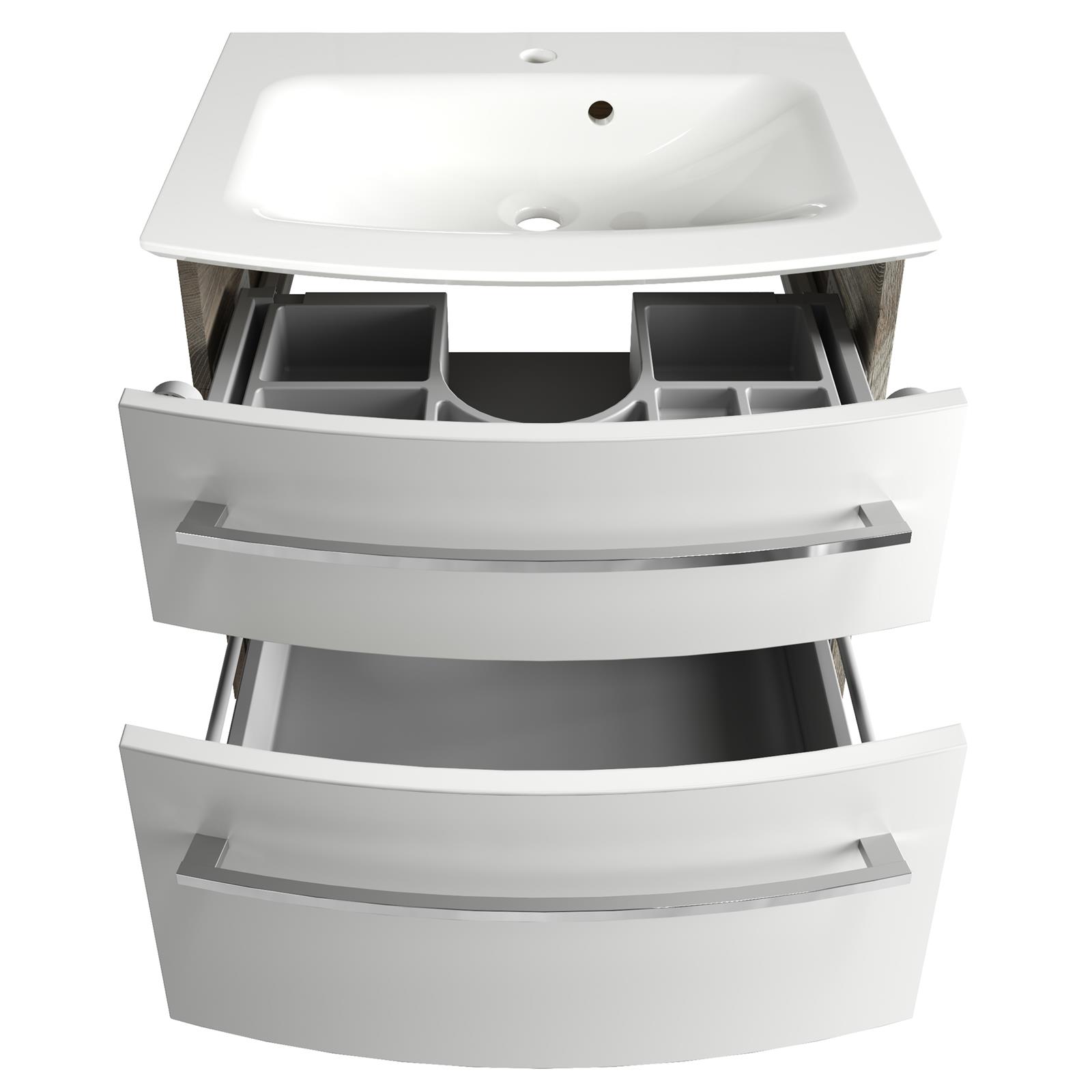☛ Oberfläche Korpusoberfläche matt Frontoberfläche Hochglanz Korpusdekor Nature Oak Frontdekor weiss Korpus feuchtraumoptimierte Holznachbildung ☛ Ausstattung 2 Schublade/n mit Soft-Close chromglänzende Griffe Front & Korpus mit Dickkante wasserfeste quellsichere Verleimung Waschbeckenstärke 21 mm Becken BxHxT 632 x 122 x 460 mm ☛ Besonderheiten oberer Schub mit integriertem Ordnungsfach Schublade innen und Querteile silbergrau