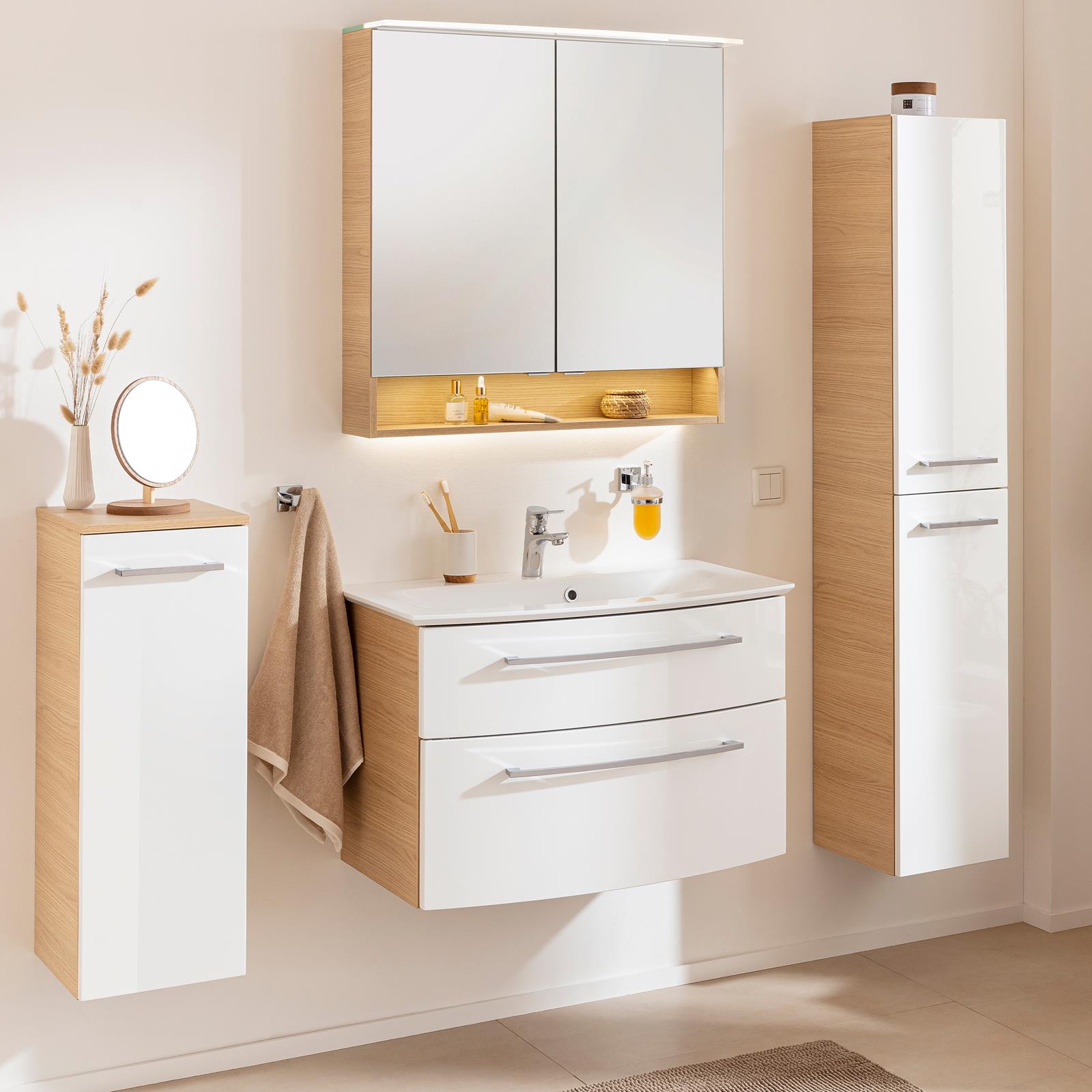 ☛ Oberfläche Korpusoberfläche matt Frontoberfläche Hochglanz Korpusdekor Sandeiche Frontdekor weiss Korpus feuchtraumoptimierte Holznachbildung ☛ Ausstattung 2 Tür/en mit gedämpften Scharnieren 2 Glasböden chromglänzende Griffe Front & Korpus mit Dickkante wasserfeste quellsichere Verleimung ☛ Besonderheiten Abdeckplatte in Korpusfarbe Querteile und Rückwand silbergrau