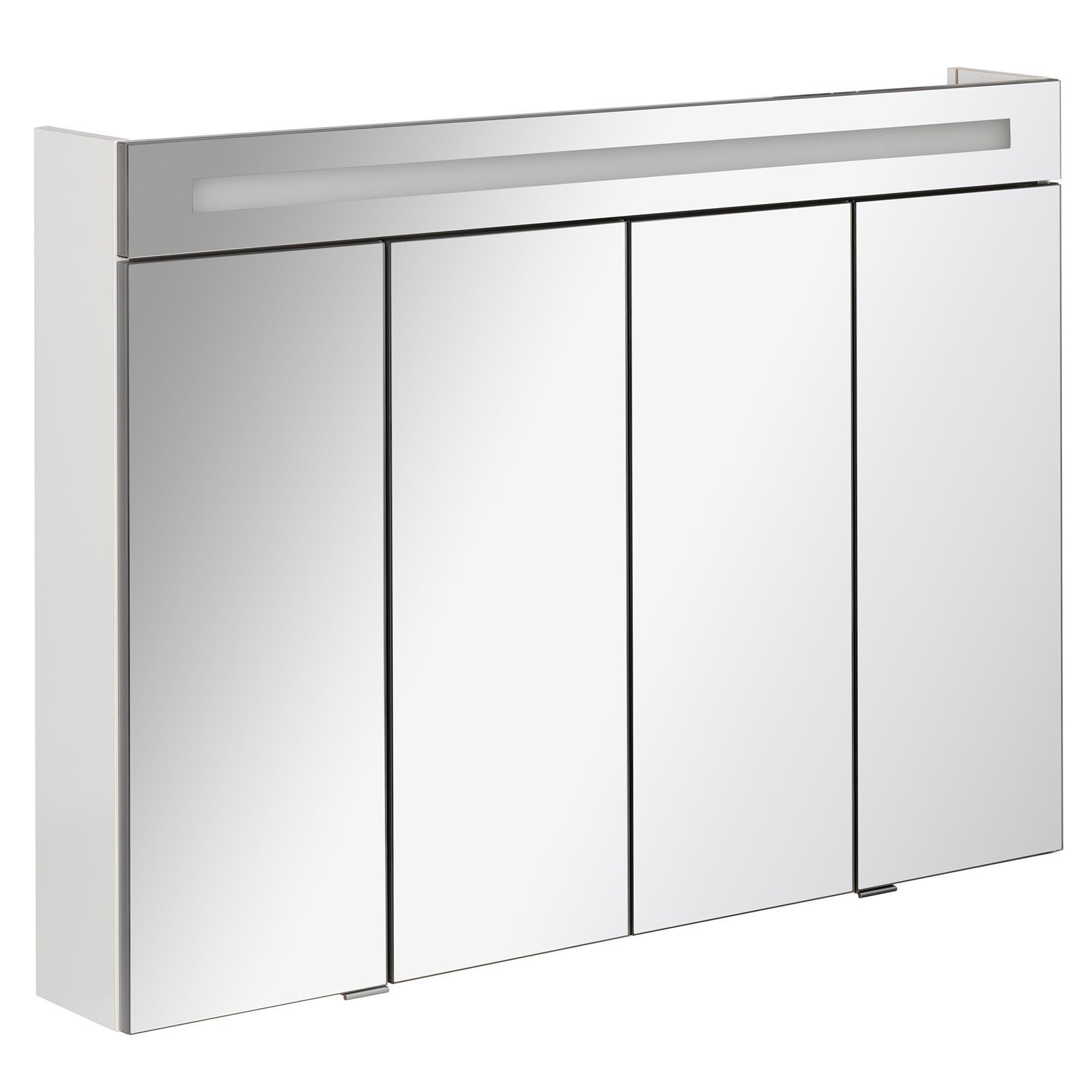 ☛ Oberfläche Korpusoberfläche matt Korpusdekor weiss Kante der Spiegeltür in ALU-Optik ☛ Beleuchtung LED-Paneel-Leuchte (Acrylglas) LED wechselbar 230 V Anschluss 9.6 W Leistung 0.85 m Anschlusskabel 840 Lumen Lichttemperatur kaltweiss ☛ Ausstattung 4 Tür/en 4 Glasböden Steckdose/Schalter rechts unten chromglänzende Griffe Korpus mit Dickkante wasserfeste quellsichere Verleimung abgerunderter Kantenabschluss gedämpfte Scharniere ☛ Besonderheiten Spiegel mit 3D-Effekt mit Falttürtmechanik Querteile & Rückwand silbergrau