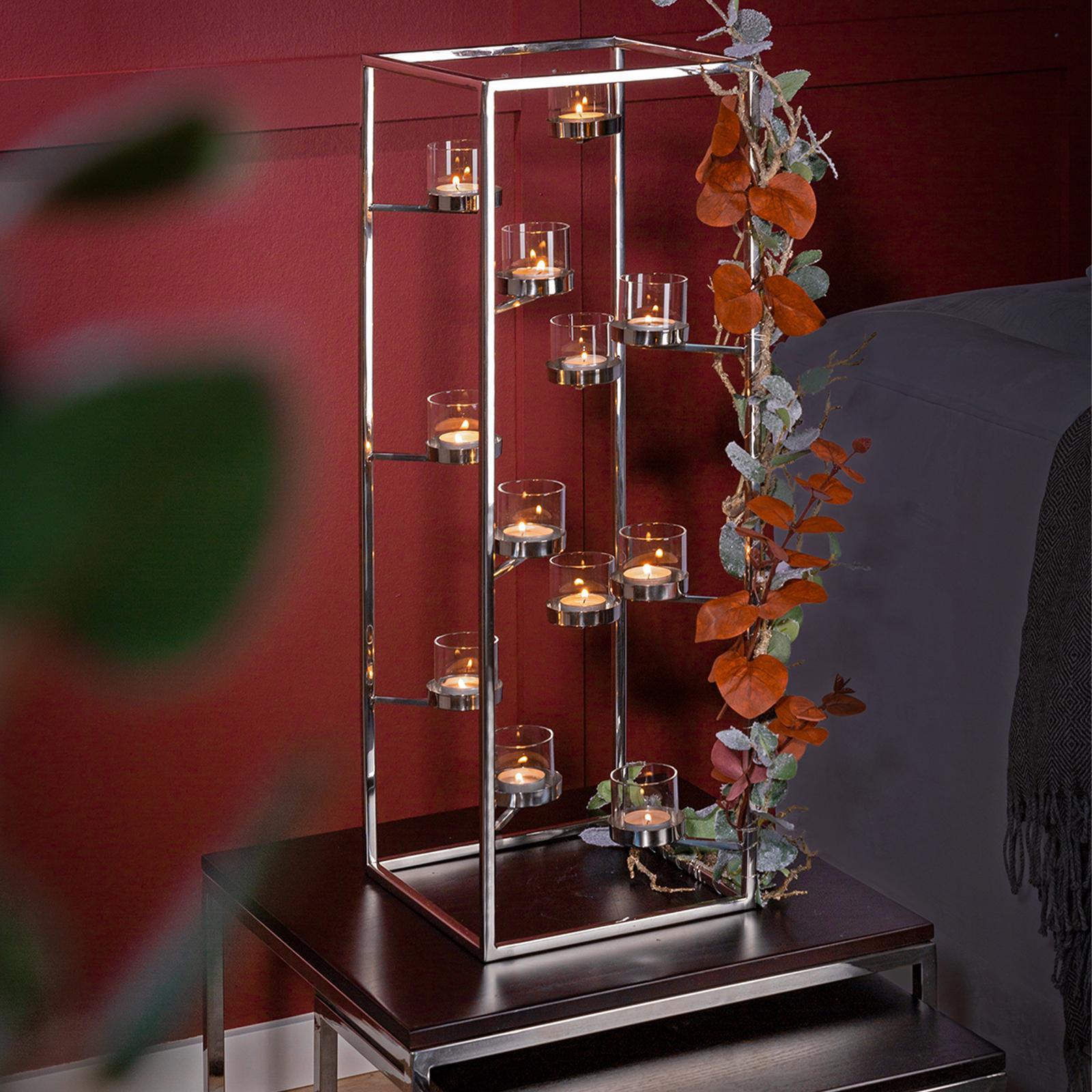 Dieser hohe Kerzenleuchter setzt mit seiner klaren Formensprache und zwölf harmonisch angeordneten Flammen ein eindrucksvolles Lichtstatement. Mit einer Höhe von 70 cm wirkt der Teelichthalter als imposantes Dekoelement, das Wohnräume ebenso wie Terrassen oder Eventlocations aufwertet. Die integrierten Glaseinsätze für Teelichter sorgen für einen sicheren Halt und lassen das Kerzenlicht sanft schimmern. In Kombination mit der glänzend polierten Edelstahlstruktur entstehen faszinierende Reflexionen, die das Ambiente auf elegante Weise veredeln. Seine kubische Rahmenform verleiht dem Design eine architektonische Strenge, die sich hervorragend mit modernen wie klassischen Interieurs kombinieren lässt. Auf dem Boden platziert, wirkt der Teelichtständer sowohl einzeln als auch als Teil eines dekorativen Ensembles eindrucksvoll. Dank der robusten Edelstahlqualität bleibt die Oberfläche beständig und pflegeleicht, sodass der Leuchter sowohl im Innen- als auch im geschützten Außenbereich eingesetzt werden kann. Ob bei festlichen Anlässen, in stilvollen Lounges oder als extravagantes Highlight im Wohnzimmer - dieses Accessoire verbindet Funktionalität mit luxuriöser Wirkung. Ein Designobjekt, das Atmosphäre schafft und besondere Momente in stimmungsvolles Licht taucht.