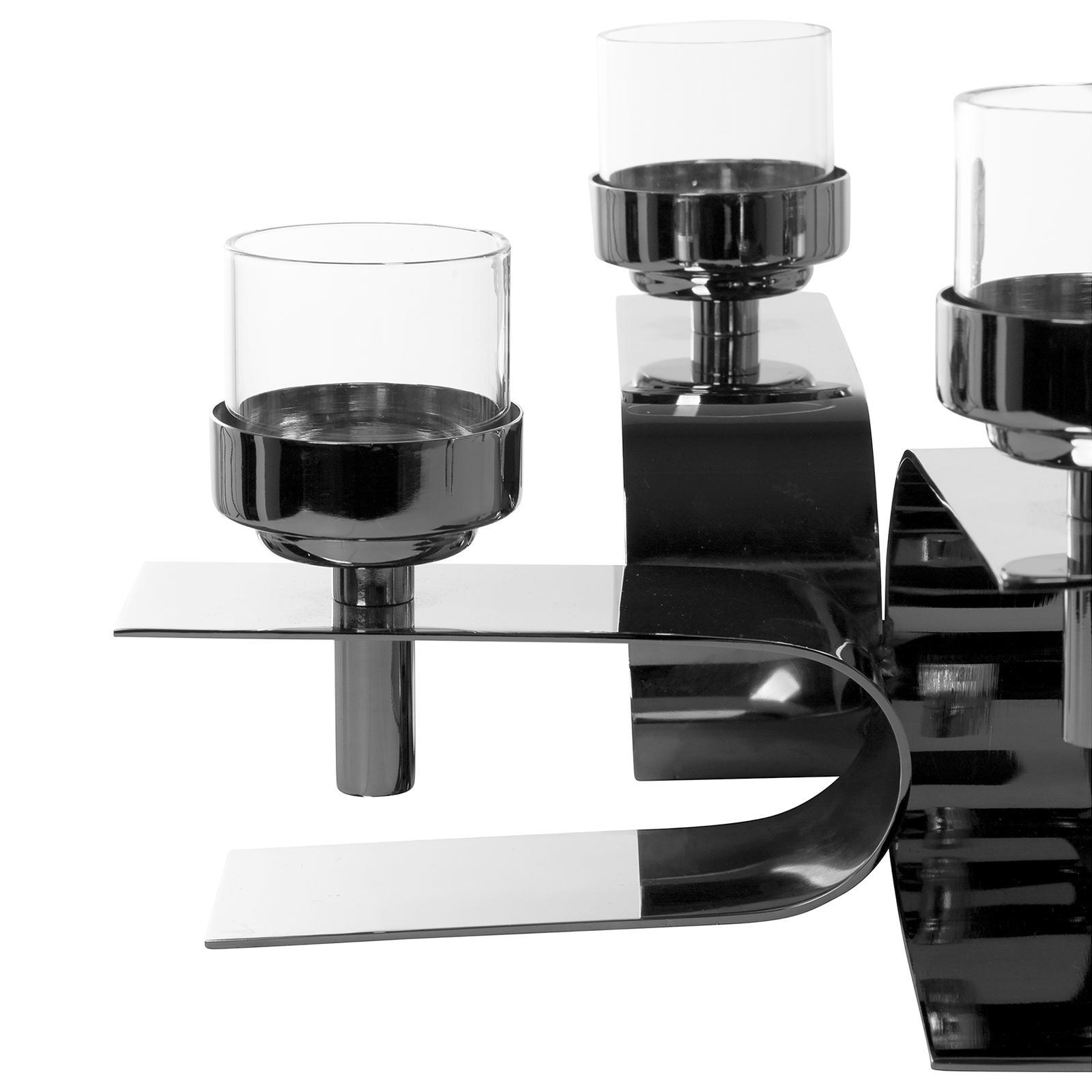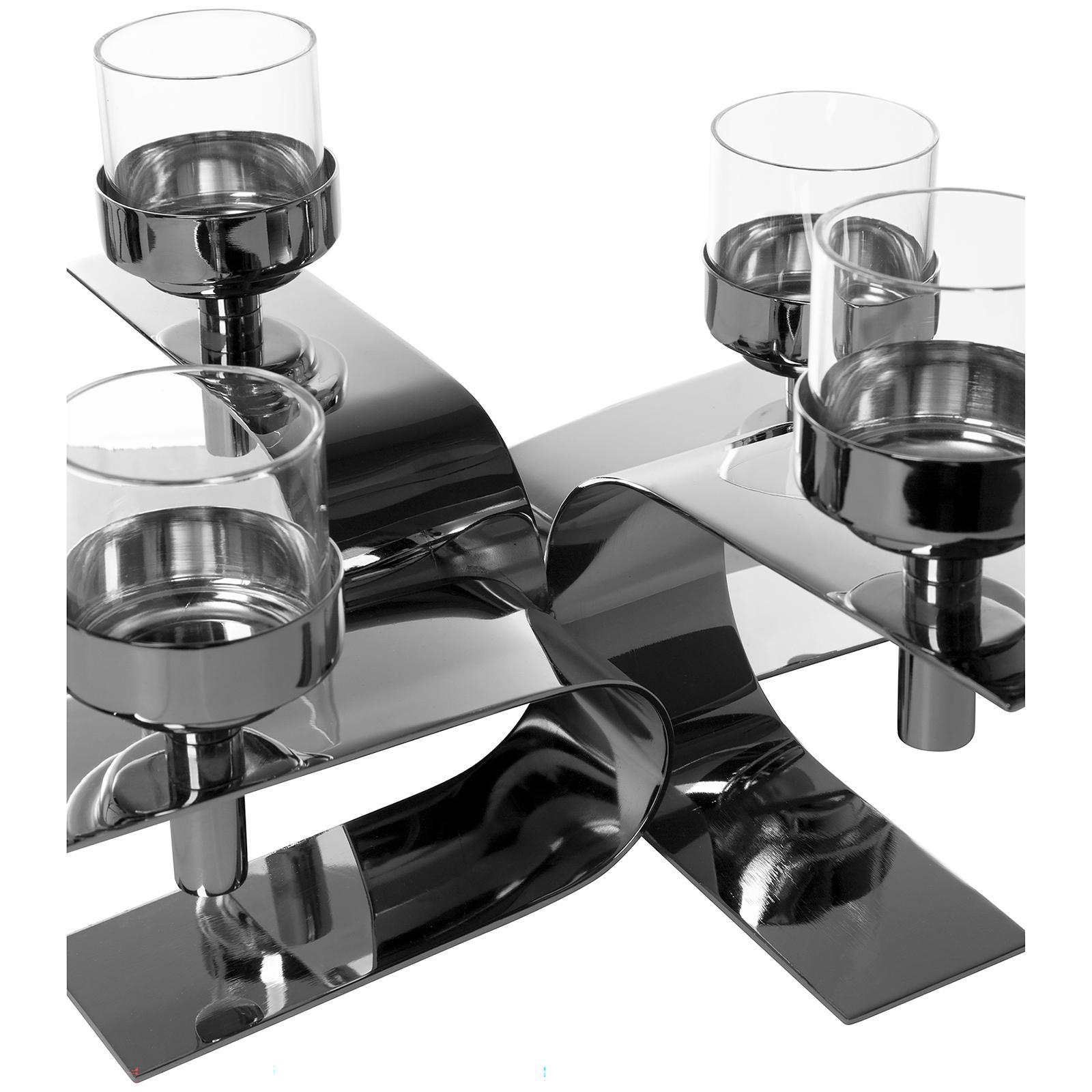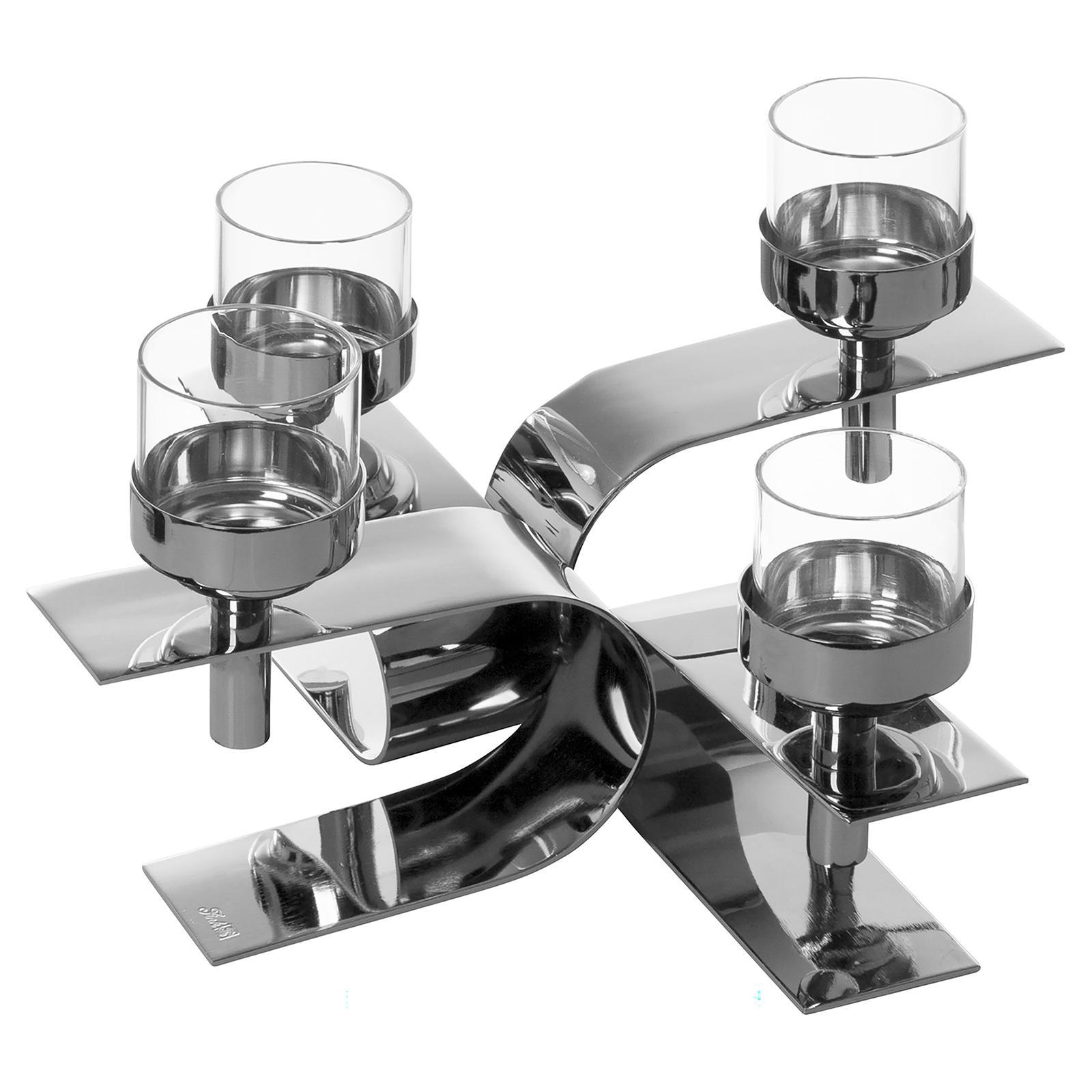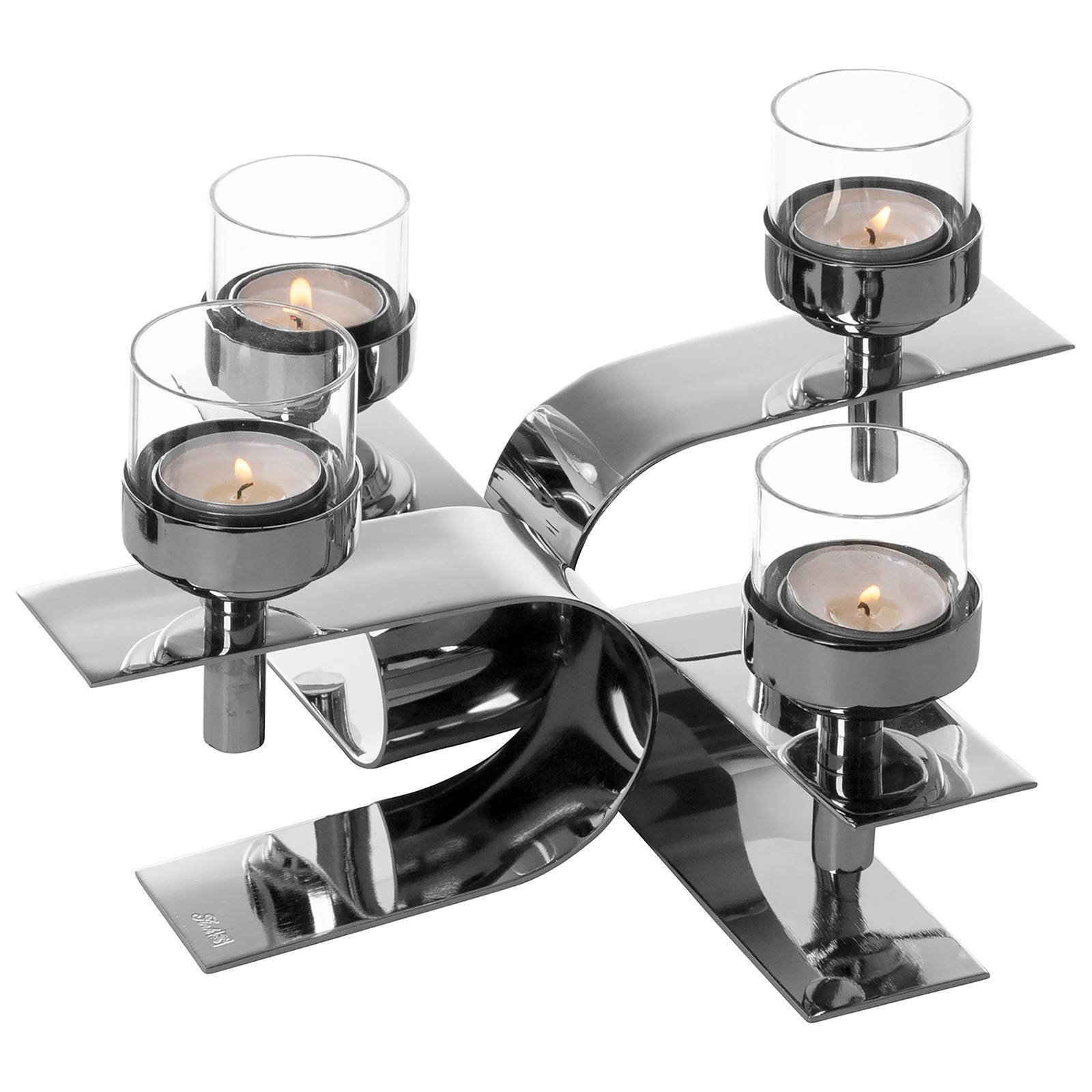 ✓ Bemerkenswerter 4-flg. Teelichthalter 30 x 30 cm aus Edelstahl und Aluminium, hochwertig vernickelt ✓ Moderne Kreuzform mit schwungvoll & gebogenen Elementen für eine außergewöhnliche Silhouette ✓ Die klaren Linien & glänzende Oberfläche des Kerzenhalters erzeugen edle Lichtreflexe im Wohnraum ✓ Ideal für Teelichter und kleine Stumpenkerzen, vielseitig einsetzbar als Tisch- & Sideboard-Dekoration ✓ Kerzenständer inklusive vier Gläser für eine stimmungsvolle Beleuchtung bei festlichen Arrangements