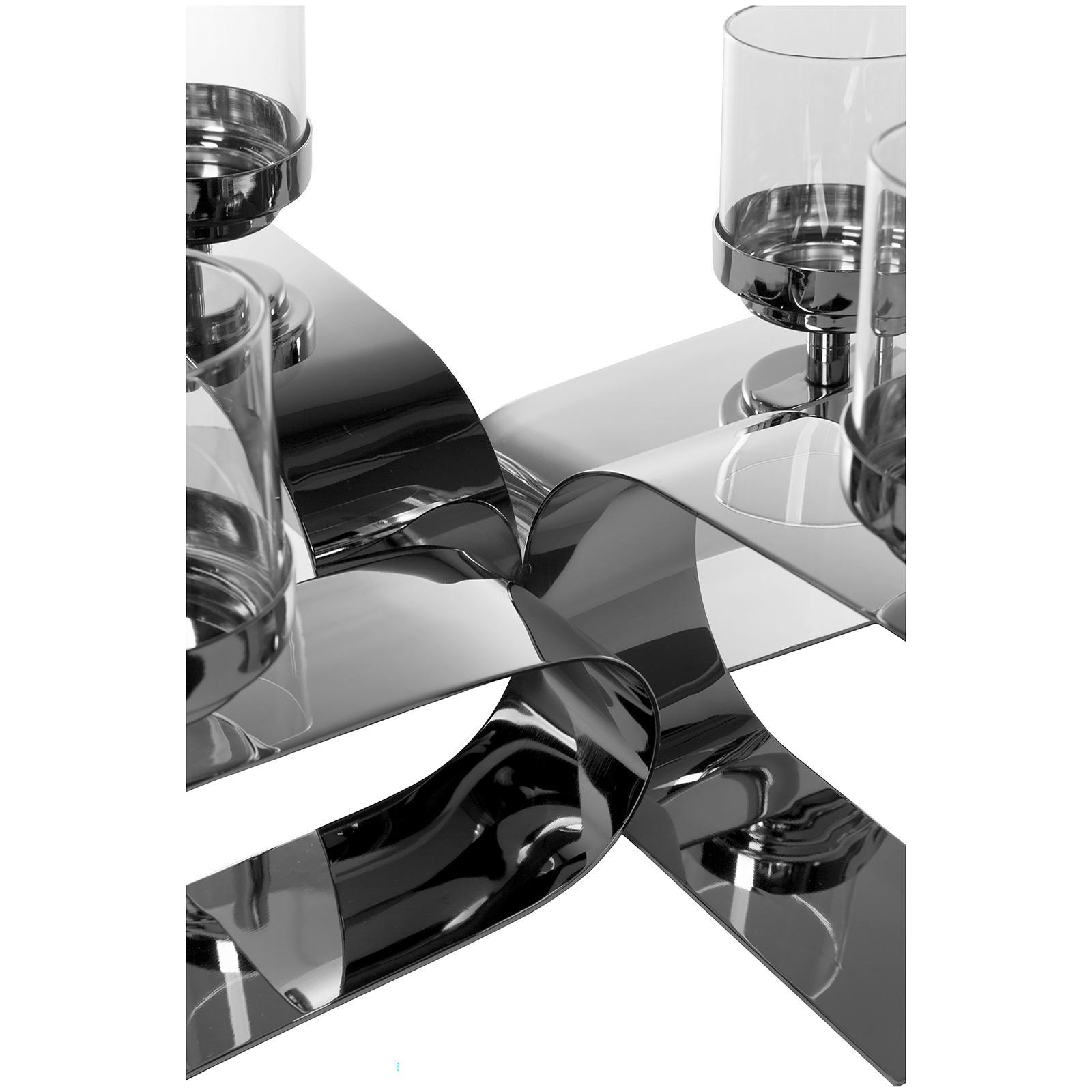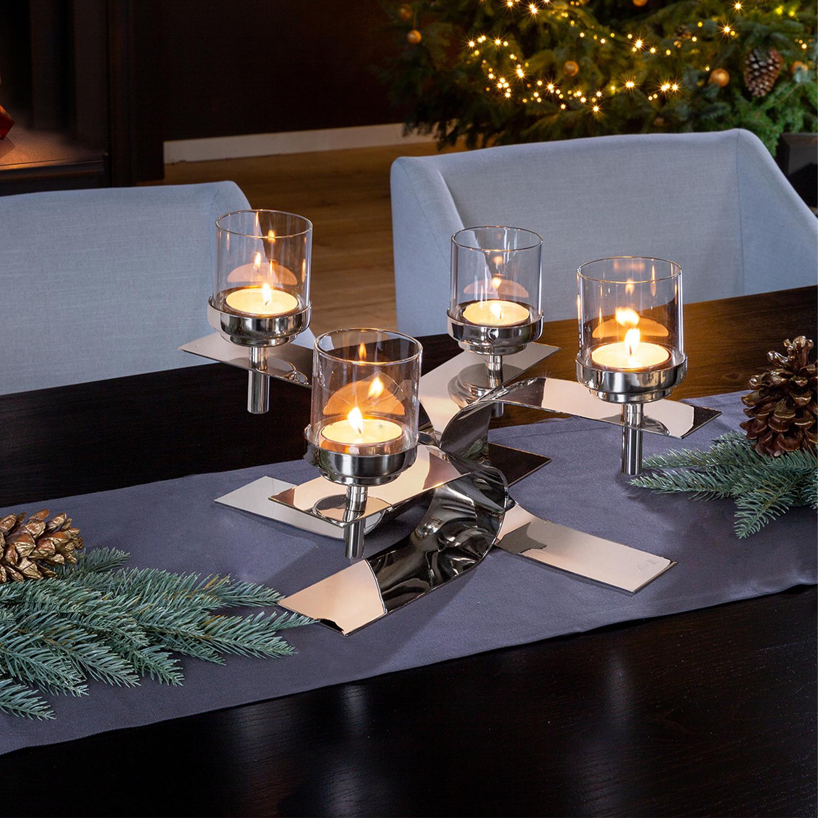 ✓ Bemerkenswerter 4-flg. Teelichthalter 42 x 42 cm aus Edelstahl und Aluminium, hochwertig vernickelt ✓ Moderne Kreuzform mit schwungvoll & gebogenen Elementen für eine außergewöhnliche Silhouette ✓ Die klaren Linien & glänzende Oberfläche des Kerzenhalters erzeugen edle Lichtreflexe im Wohnraum ✓ Ideal für Teelichter und kleine Stumpenkerzen, vielseitig einsetzbar als Tisch- & Sideboard-Dekoration ✓ Kerzenständer inklusive vier Gläser für eine stimmungsvolle Beleuchtung bei festlichen Arrangements