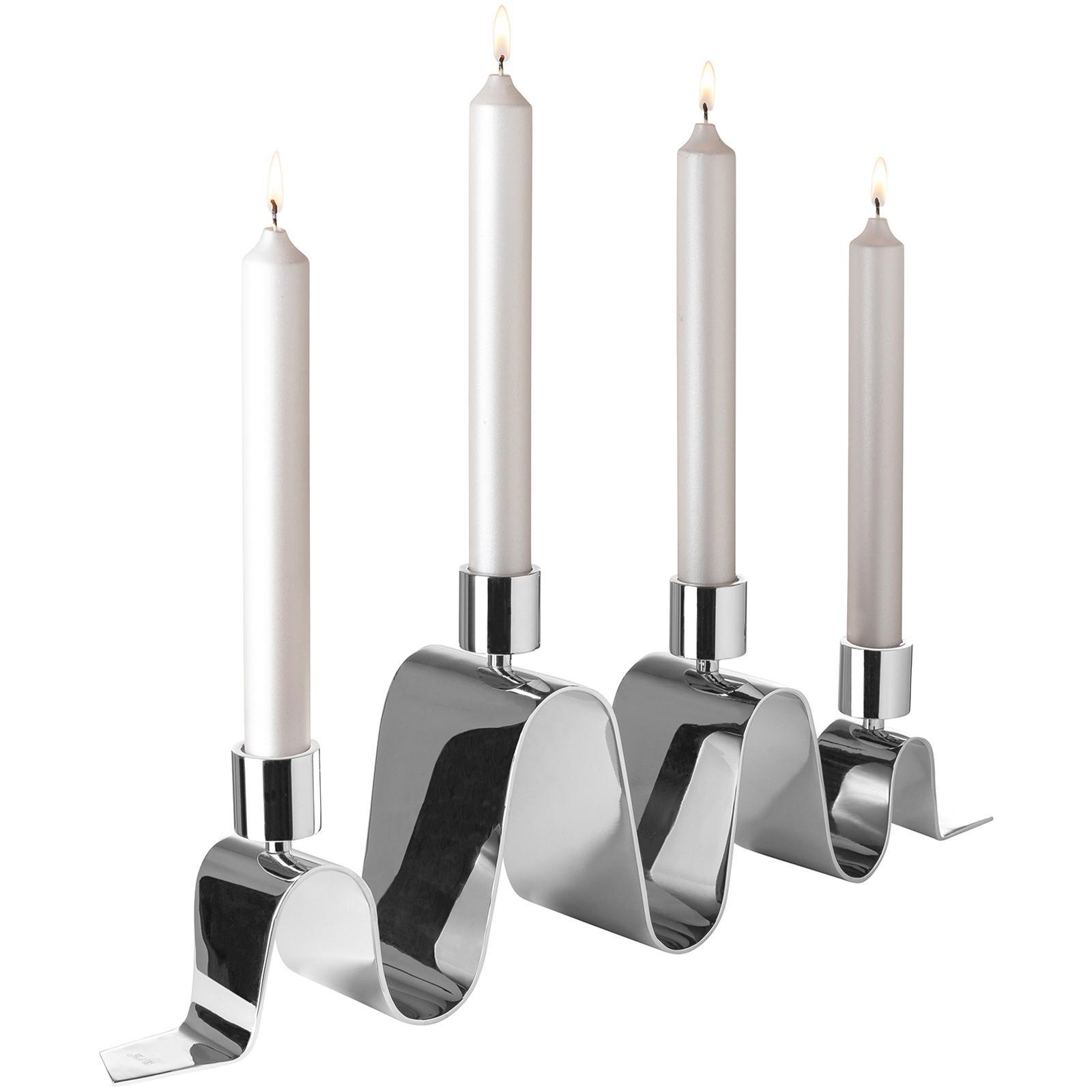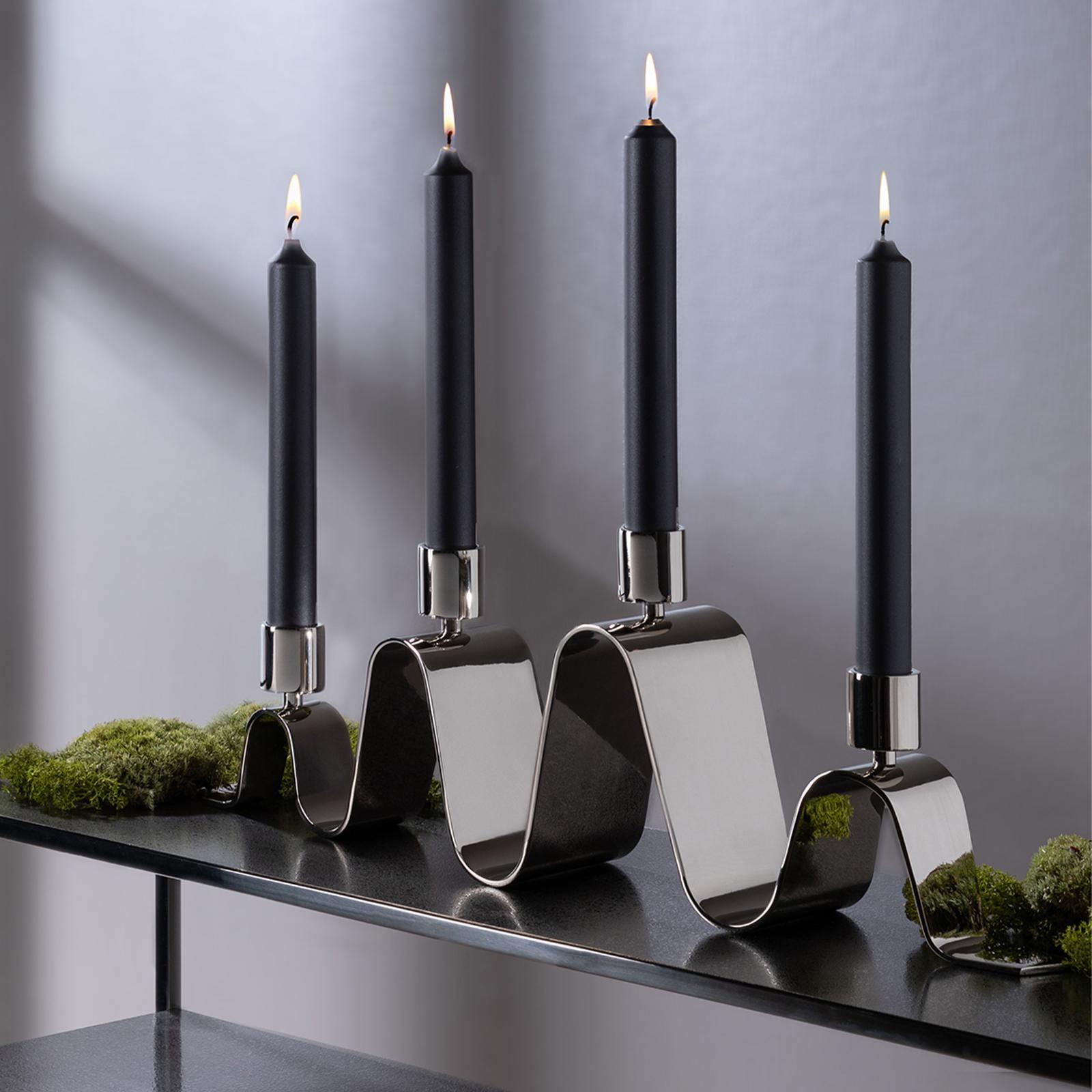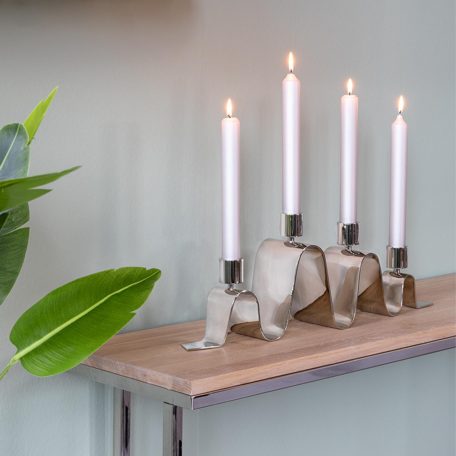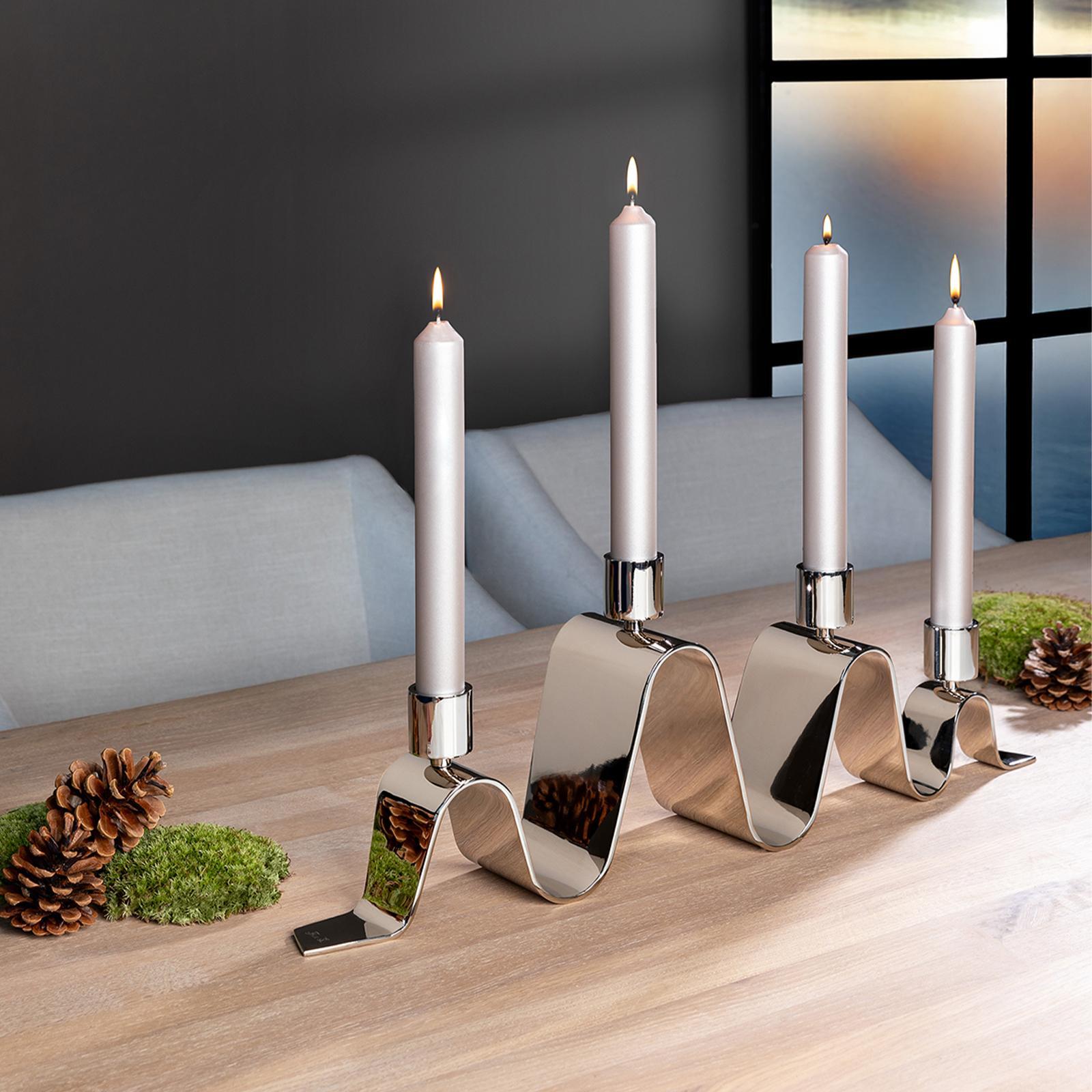 ✓ Moderner 4-flg. Kerzenhalter aus Aluminium mit eleganter Wellenform für eine edle Tischdekoration ✓ Die glänzend vernickelte Oberfläche reflektiert Kerzenlicht stimmungsvoll & verleiht luxuriösen Glanz ✓ Das wellenförmige Design vereint Eleganz und Stabilität - ein stilvoller Blickfang für jeden Wohnraum ✓ Der flache & breite Stil passt ideal auf Esstische oder Sideboards und wirkt dabei harmonisch modern ✓ Edler Design-Leuchter für Stabkerzen - perfekt, um stilvolle Akzente in modernen Interiors zu setzen