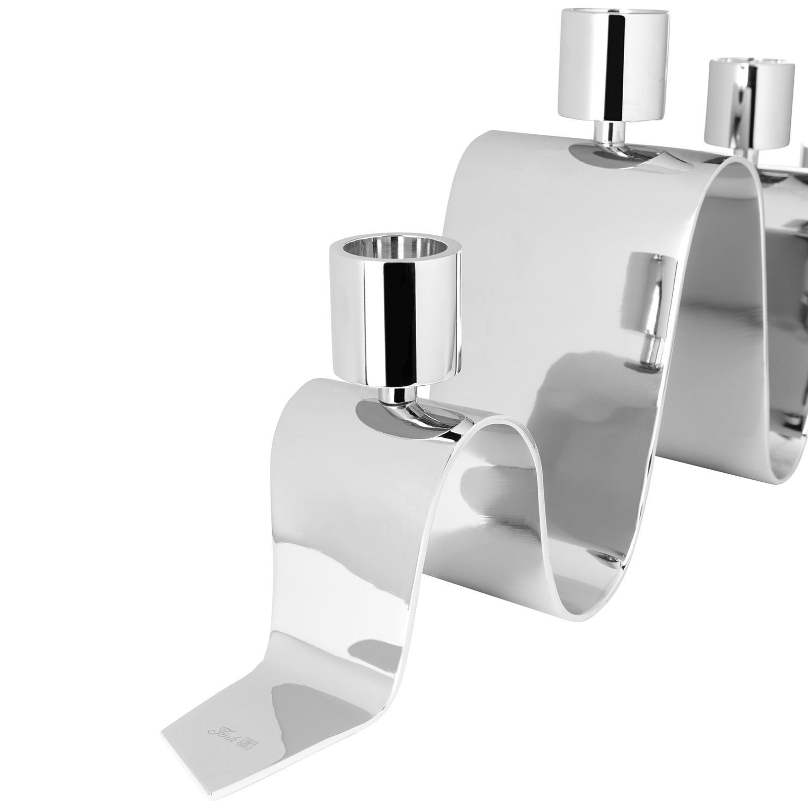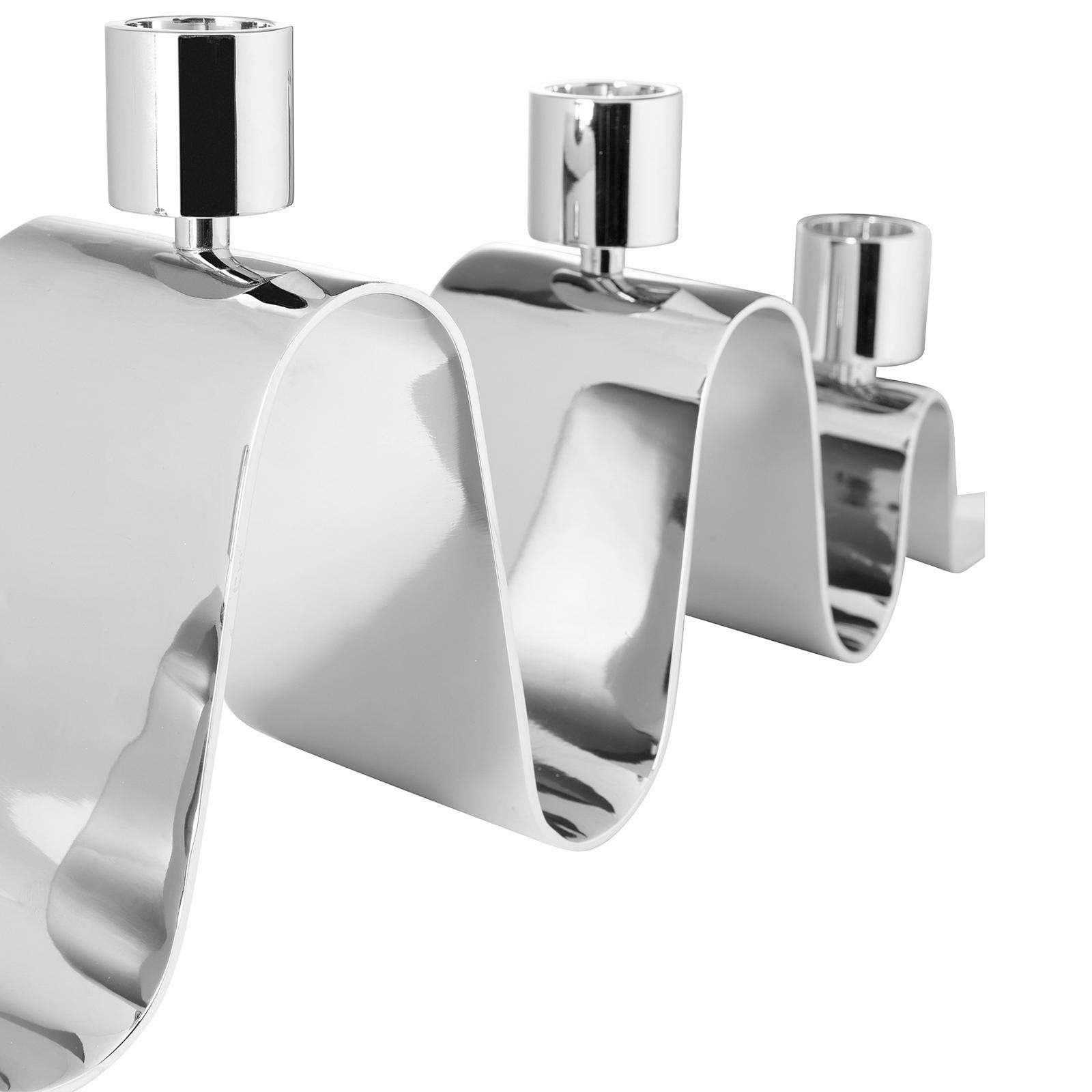 • Länge ca.: 9 cm • Breite ca.: 51 cm • Höhe ca.: 19,5 cm • Serie: Fink Living • Kapazität: für 4 Stabkerzen Ø 3 cm • Material: Aluminium • Veredelung: vernickelt • Oberfläche: glänzend poliert • Oberfläche Details: glatt • Farbe: silber • Form: wellenform • Dimension: groß • Umgebungsnutzung: Für Innenbereich • Anlass: Hochzeiten, Deko, Wellnes & Entspannung, Geschenkidee • Nutzungsbereich: Tischdekoration, Buffets, Wohnzimmer • Gewicht ca.: 1,25 Kg