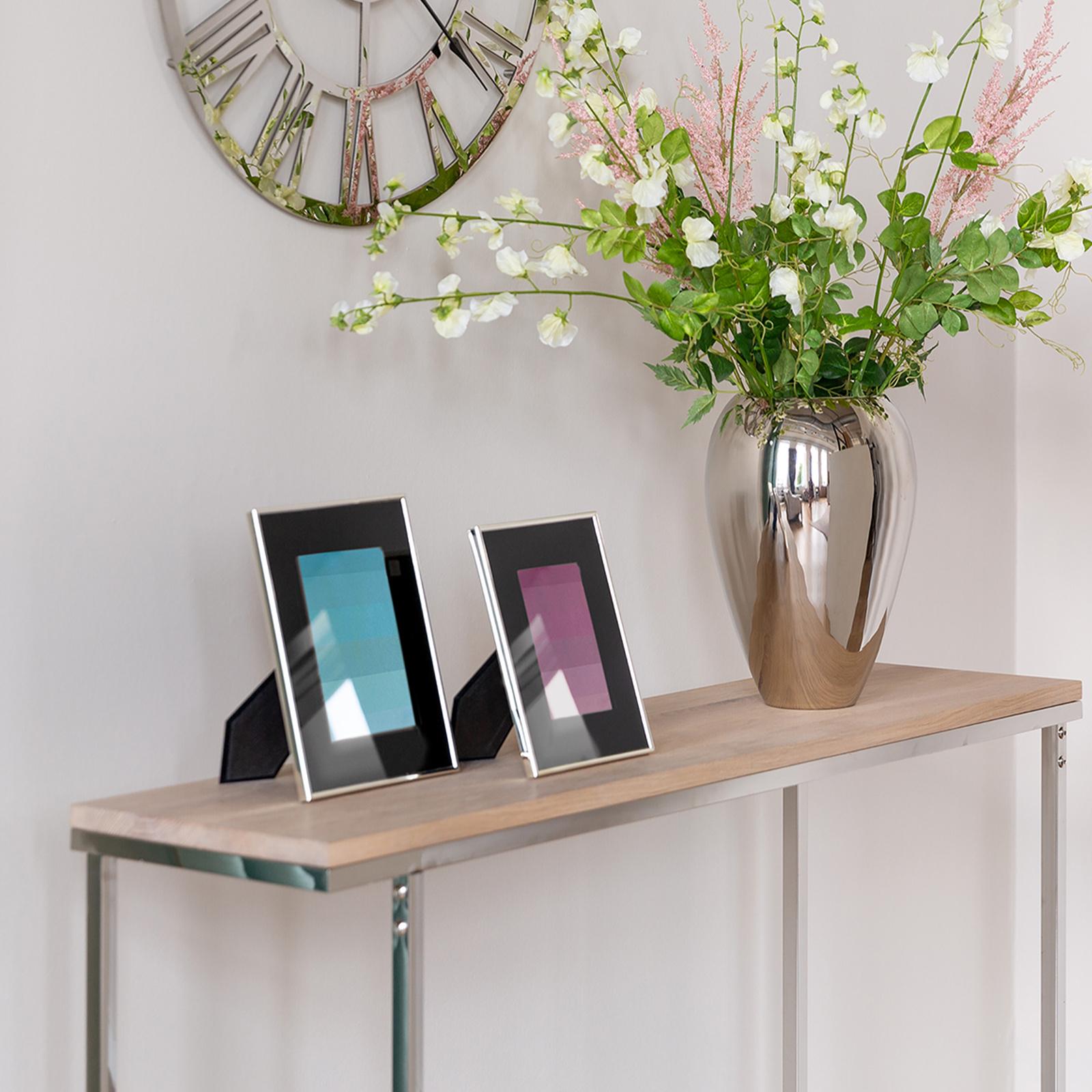 Dieser edle Bilderrahmen verbindet klassische Materialien mit modernem Design und bringt Fotos im Format 13x18 cm wirkungsvoll zur Geltung. Der umlaufende Rand aus glänzendem Silber sorgt für eine elegante Einfassung, während die breite Glasleiste in tiefem Schwarz einen starken Kontrast bildet und dem Rahmen eine markante, zeitgemäße Ausstrahlung verleiht. Die Kombination aus Silberglanz und schwarzem Glas wirkt besonders edel und hebt das Bildmotiv kunstvoll hervor. Durch die klare Linienführung und die hochwertige Verarbeitung passt der Rahmen gleichermaßen in klassische wie auch moderne Wohnkonzepte. Er eignet sich hervorragend, um besondere Momente wie Familienfotos, Urlaubserinnerungen oder Portraits stilvoll zu präsentieren. Ob als Aufsteller auf dem Sideboard, im Regal oder als Wandschmuck - dieser Bilderrahmen bietet vielseitige Einsatzmöglichkeiten und setzt Ihre Fotos immer geschmackvoll in Szene. Durch das dezente, zugleich luxuriöse Erscheinungsbild wird er schnell zum Blickfang in jedem Raum und fügt sich dennoch harmonisch in das bestehende Interieur ein. Ein stilvolles Wohnaccessoire, das Eleganz und moderne Akzente vereint und wertvolle Erinnerungen ansprechend präsentiert.