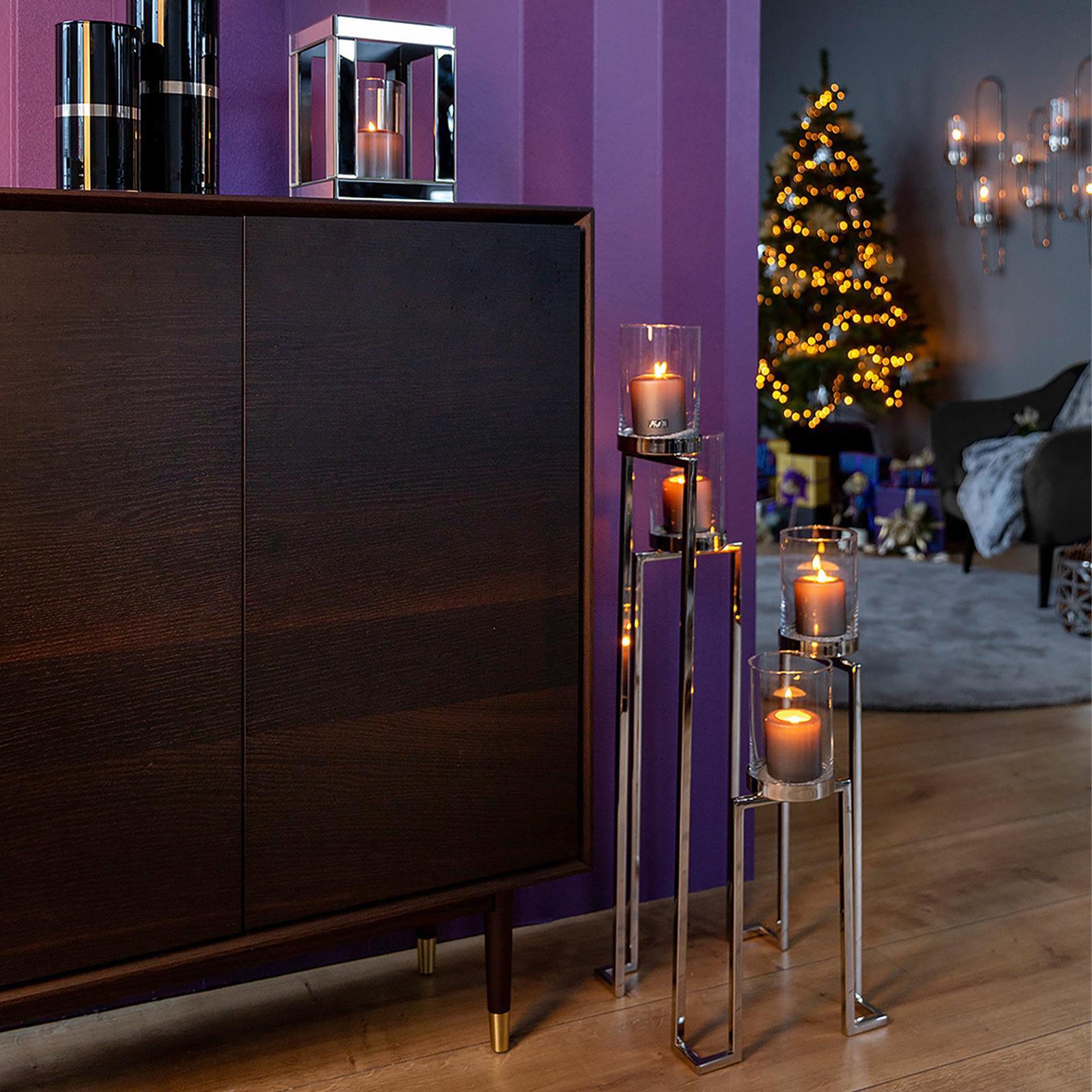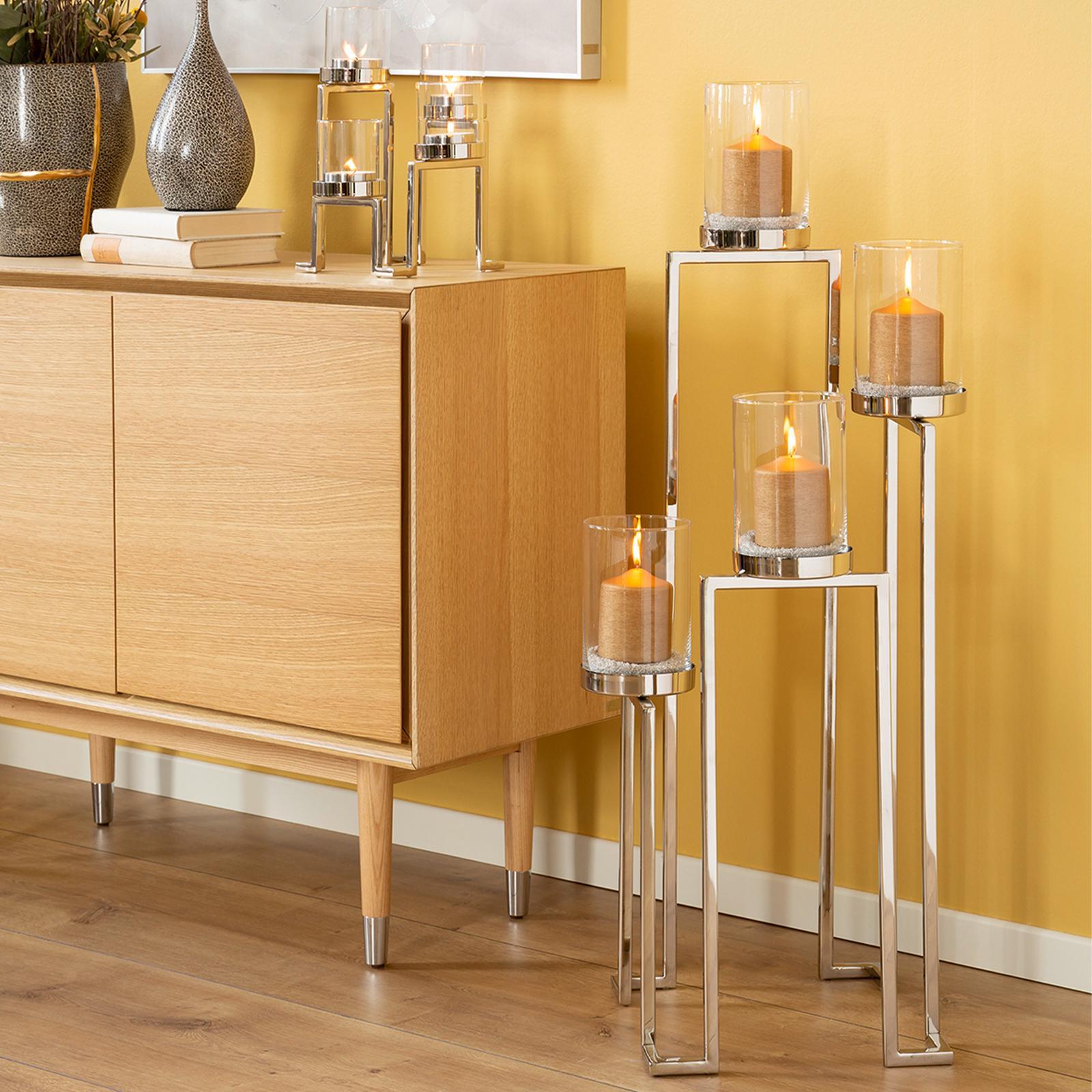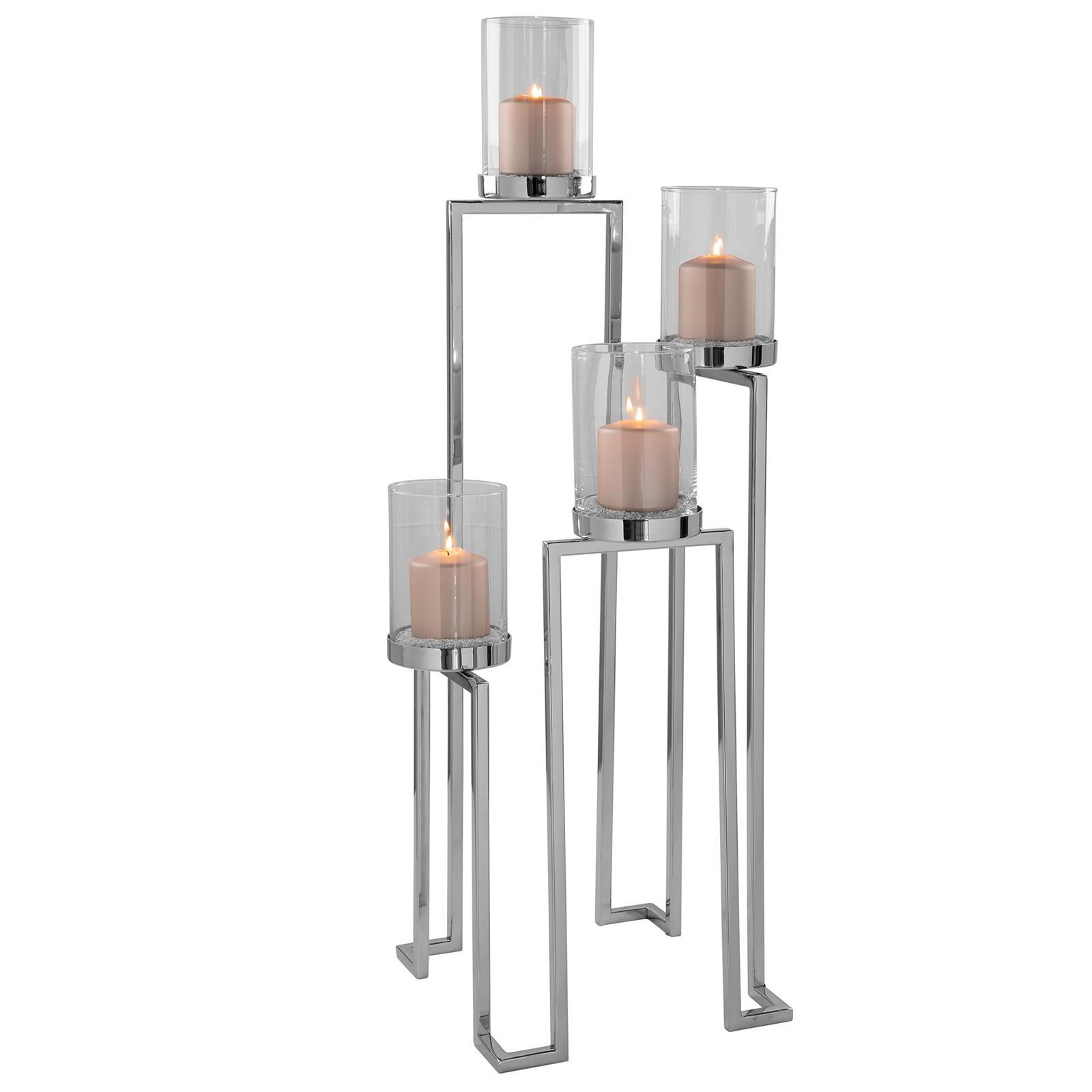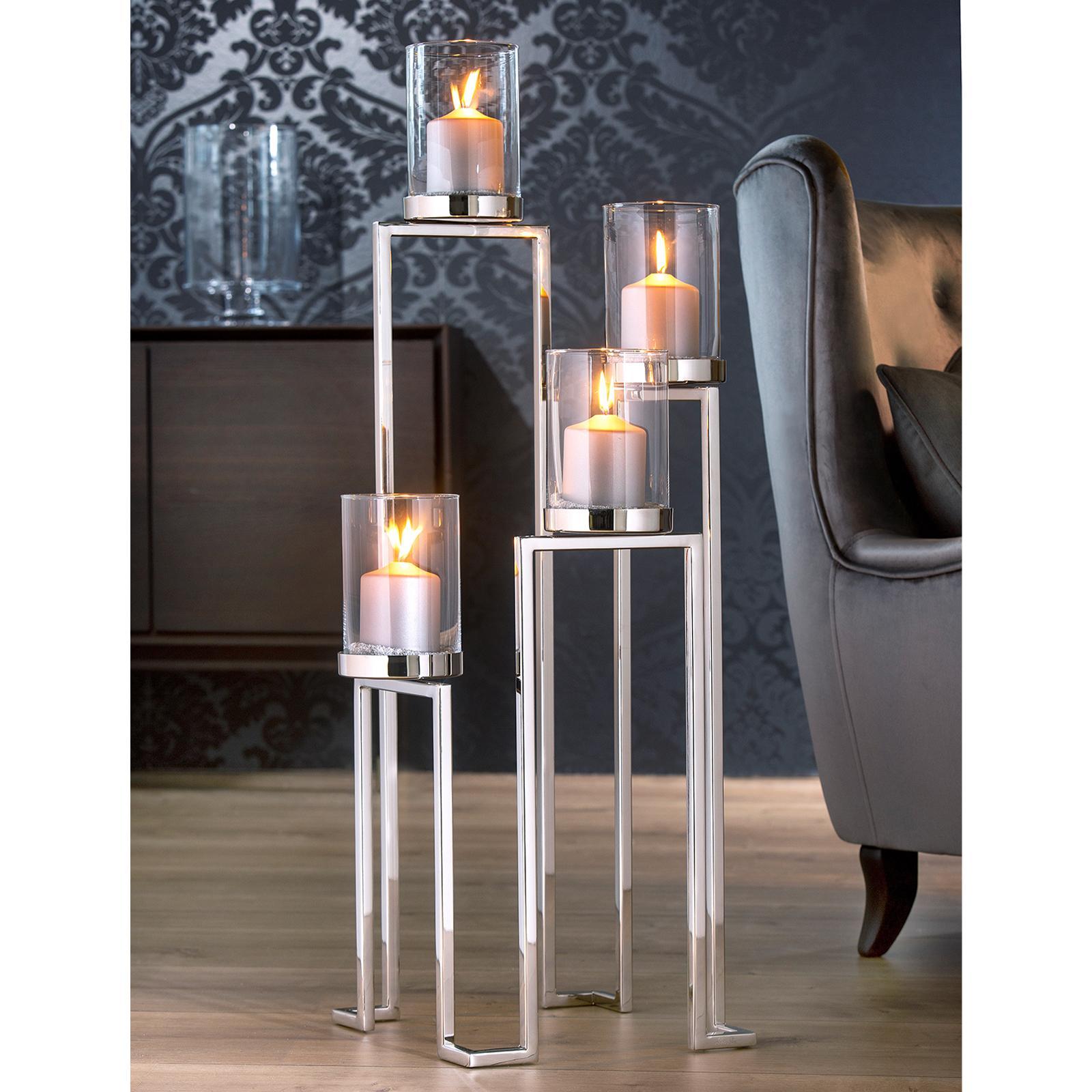 • Länge ca.: 32,5 cm • Breite ca.: 32,5 cm • Höhe ca.: 86 cm • Serie: Fink Living • Kapazität: für 4 Stumpenkerzen Ø 8 cm oder Teelichter • Material: Edelstahl • Material 1: Glas • Oberfläche: glänzend poliert • Oberfläche Details: glatt • Farbe: silber • Eigenschaft: mit 4 Aufsatz-Glaszylinder • Ausstattung: Glaszylinderboden geschlossen • Dimension: groß • Umgebungsnutzung: Für Innenbereich • Anlass: Hochzeiten, abendliche Entspannung, Dekoration, Dinner & Brunch • Nutzungsbereich: Wohnzimmer, Esszimmer • Nutzungsmöglichkeit: Dekoration, Teelichter, Kerzen • Gewicht ca.: 1,07 Kg