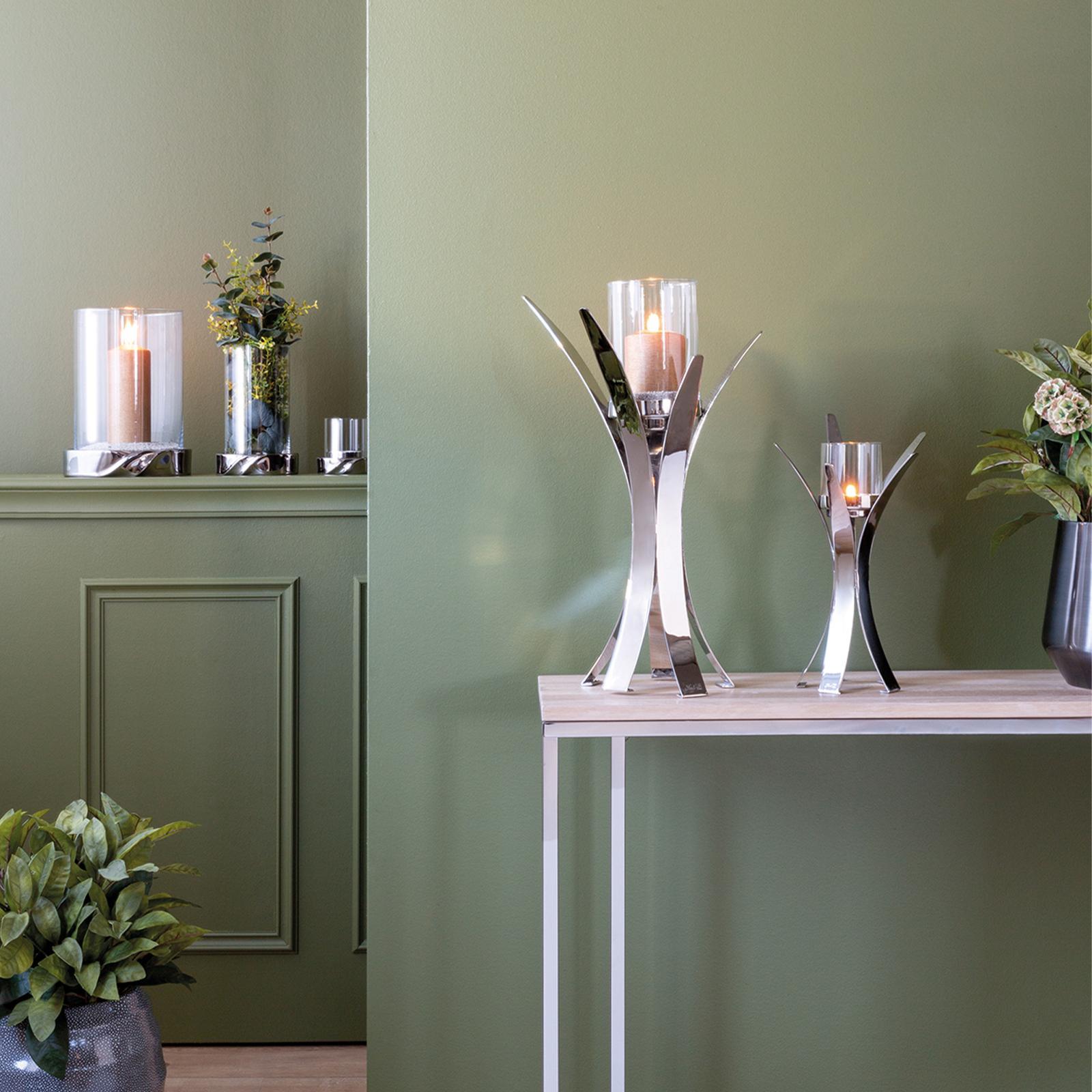 Dieser Kerzenhalter vereint glanzvolle Eleganz mit außergewöhnlicher Formensprache und wird so zum dekorativen Mittelpunkt in jedem Raum. Mit einer Höhe von 37 cm bietet er reichlich Präsenz, ohne zu dominant zu wirken, und setzt Kerzen - ob Stumpenkerze oder Teelicht - stilvoll in Szene. Der klare Glaszylinder schützt die Flamme, sorgt für ein gleichmäßiges Brennen und verleiht dem Ensemble eine zusätzliche Raffinesse. Besonders markant ist die Konstruktion auf fünf feinen Standfüßen, die dem Leuchter eine filigrane Leichtigkeit verleihen und zugleich für sicheren Stand sorgen. Die glänzend vernickelte Edelstahloberfläche reflektiert das Kerzenlicht weich und bringt warme Lichtakzente in den Raum, wodurch eine gemütliche und zugleich edle Atmosphäre entsteht. Ob als Highlight auf einem Sideboard, als Akzent auf dem Esstisch oder als dekoratives Detail im Regal - das minimalistische Design harmoniert mit modernen wie klassischen Einrichtungen und lässt sich vielseitig kombinieren. Durch die Kombination aus Glas, Edelstahl und der besonderen 5-Fuß-Struktur entsteht ein Kerzenleuchter, der nicht nur funktional überzeugt, sondern auch als stilvolles Geschenk eine hervorragende Wahl darstellt. Er verbindet Stabilität, Eleganz und eine unverwechselbare Optik in einem außergewöhnlichen Wohnaccessoire.