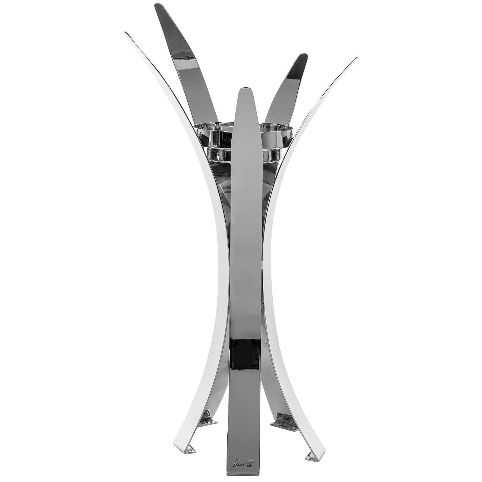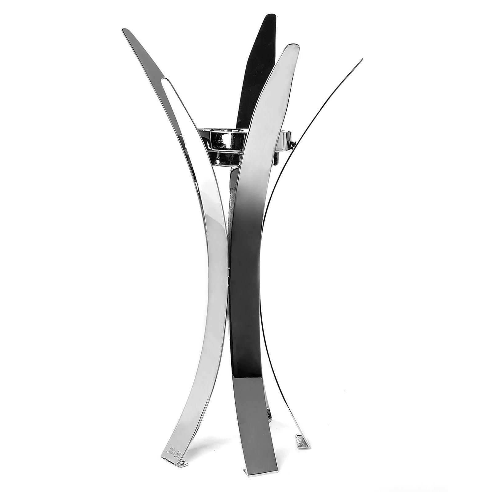 Dieser Kerzenhalter verbindet extravagantes Design mit klarer Eleganz und wird durch seine besondere Form zum dekorativen Highlight. Mit einer Höhe von 53 cm bietet er die ideale Größe, um Kerzen stilvoll zu präsentieren - ob Stumpenkerze oder Teelicht. Seine ungewöhnliche Konstruktion mit fünf filigranen Füßen verleiht dem Leuchter eine leichte, beinahe schwebende Anmutung, während er dennoch stabil auf jeder Oberfläche steht. Die vernickelte Edelstahloberfläche sorgt für strahlenden Glanz und verstärkt die Wirkung des Kerzenlichts, das sich in feinen Reflexen widerspiegelt. Dadurch entsteht eine warme, atmosphärische Beleuchtung, die den modernen Charakter des Designs elegant unterstreicht. Als Blickfang auf dem Esstisch, als dekoratives Detail auf einem Sideboard oder als Akzent im Regal entfaltet der Leuchter seine volle Wirkung. Sein minimalistischer Aufbau lässt sich mühelos in verschiedene Wohnstile integrieren - von puristisch-modern bis klassisch-elegant. Dank der Verarbeitung ist der Kerzenleuchter nicht nur ein funktionales Accessoire, sondern auch ein stilvolles Geschenk für Menschen mit Sinn für außergewöhnliche Wohnideen. Mit diesem Leuchter setzen Sie einen edlen Akzent, der Licht und Design perfekt vereint.