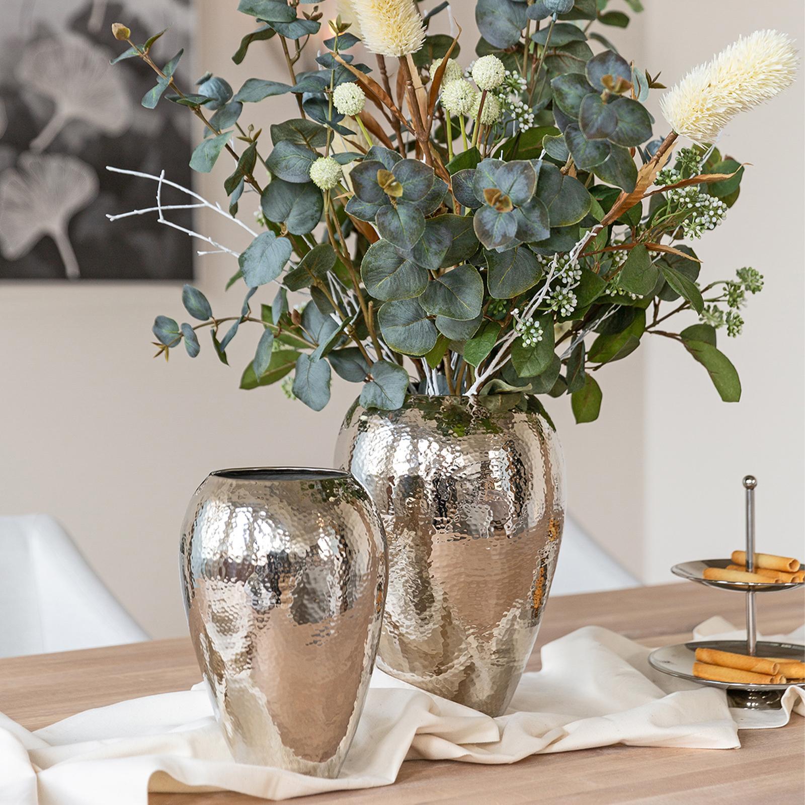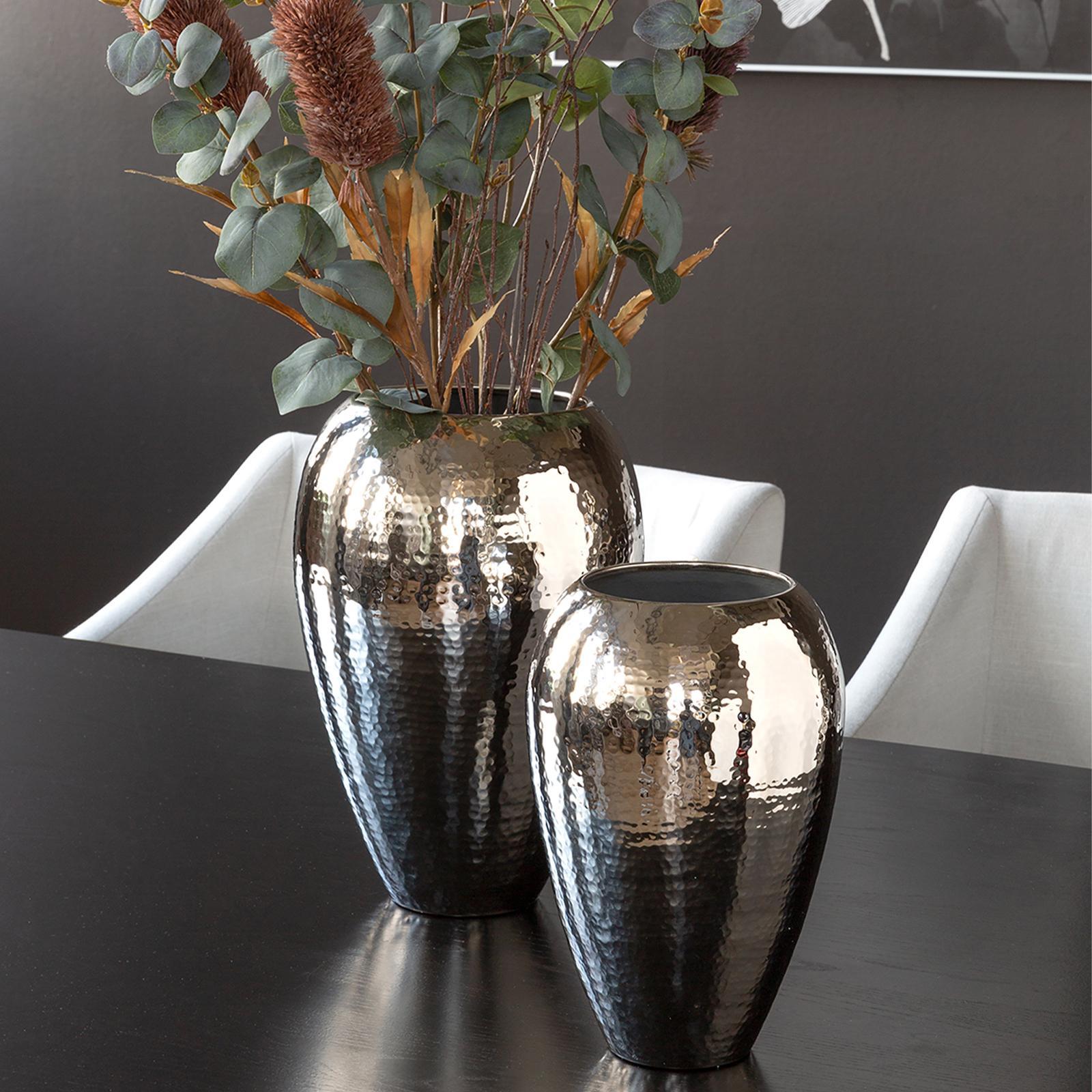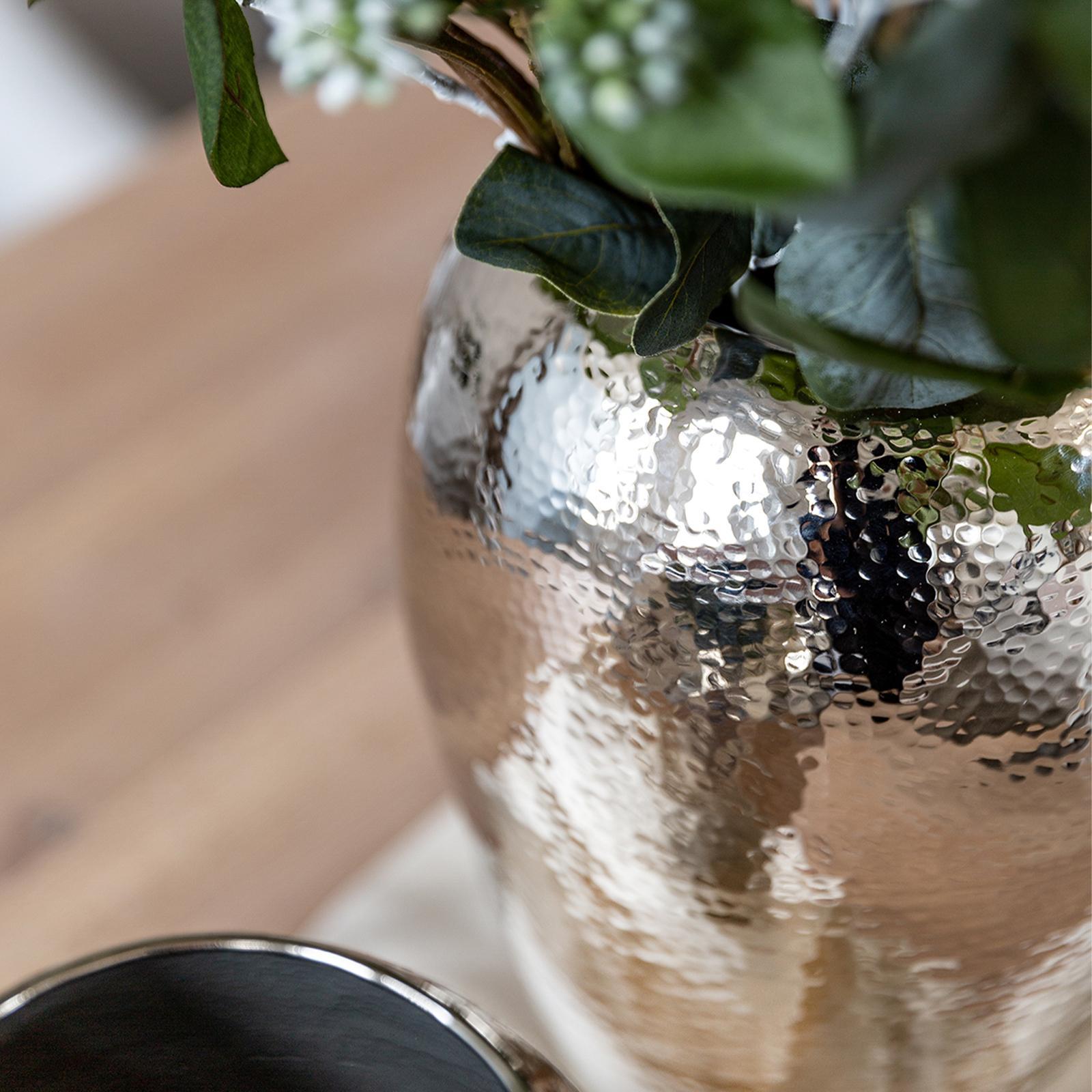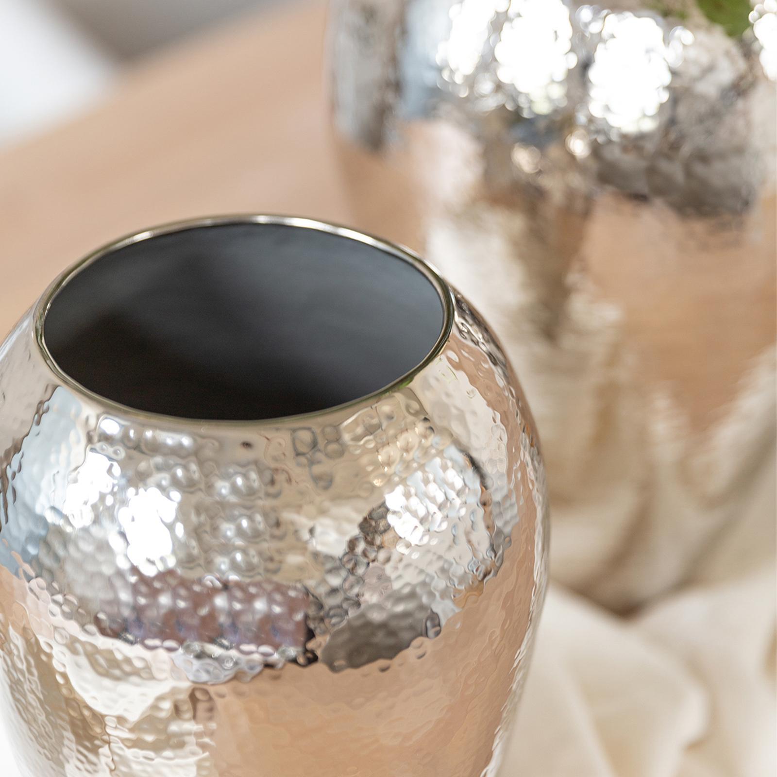 • Länge ca.: 21 cm • Breite ca.: 21 cm • Höhe ca.: 32 cm • Durchmesser ca.: 21 cm • Serie: Fink Living • Material: Eisen • Veredelung: vernickelt • Oberfläche: glänzend poliert • Oberfläche Details: gehämmert • Farbe: silber • Form: rund • Dimension: groß • Umgebungsnutzung: Für Innenbereich • Anlass: Jubiläen & Feste, Deko, Saisonale Anlässe, Geschenkidee • Nutzungsbereich: Fußboden, Sideboard, Wohnambiente • Nutzungsmöglichkeit: langstielige Schnittblumen, Trockenblumen, Sträuße • Besonderheit: wasserdicht • Besonderheit I: Unikatcharakter, Handarbeit • Gewicht ca.: 1,1 Kg