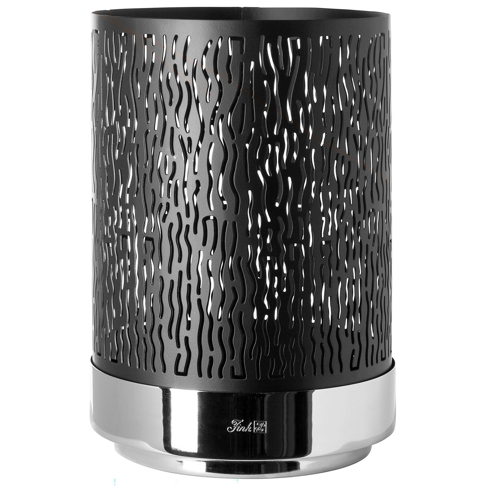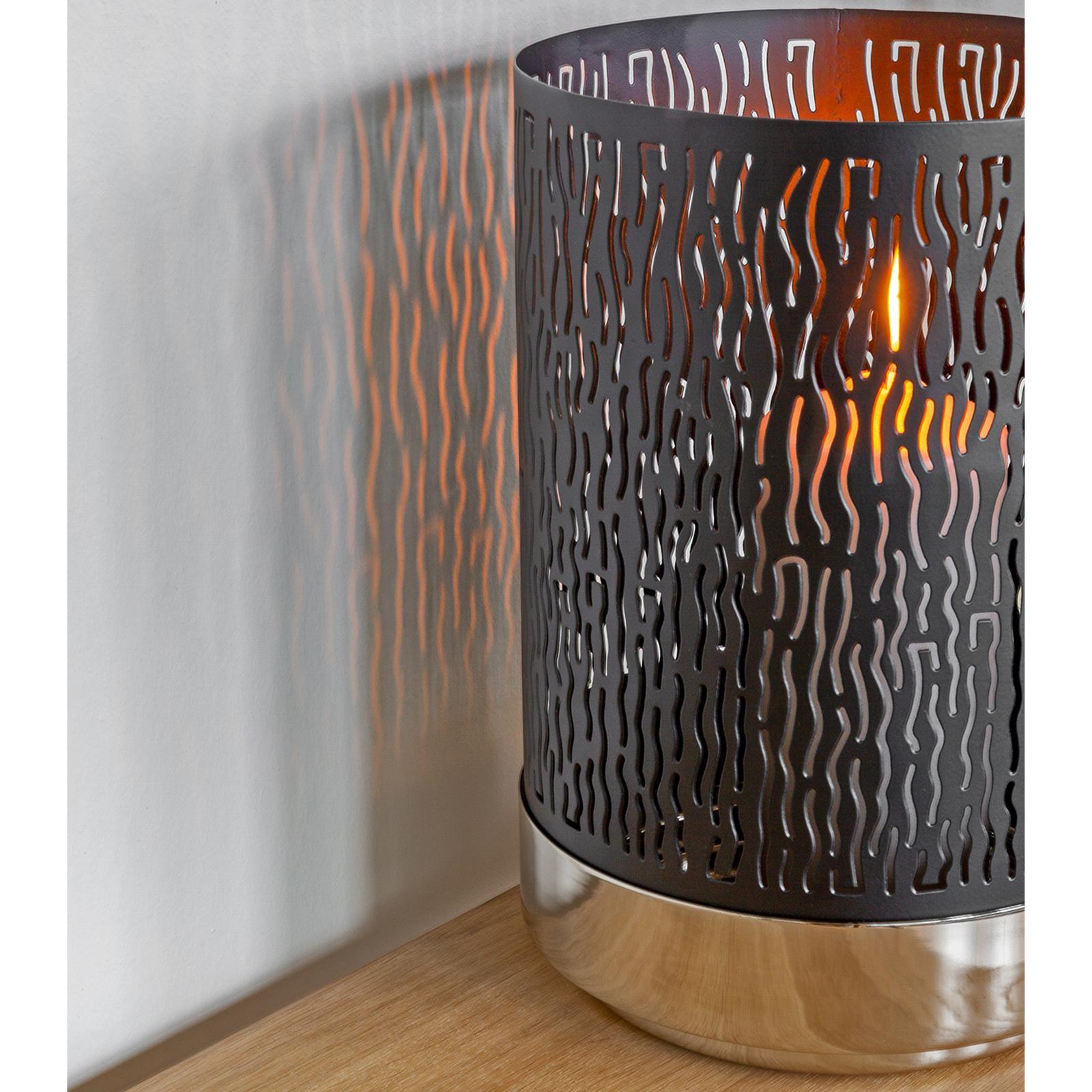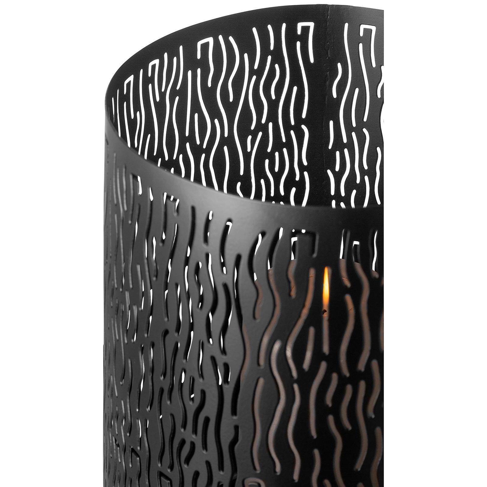 • Länge ca.: 21 cm • Breite ca.: 21 cm • Höhe ca.: 30 cm • Durchmesser ca.: 21 cm • Serie: Fink Living • Kapazität: für 1 Stumpenkerze • Material: Eisen • Beschichtung: pulverbeschichtet • Oberfläche: matt-glänzend • Oberfläche Details: strukturiert • Farbe: schwarz-silber • Eigenschaft: ohne Aufsatz-Glaszylinder • Ausstattung: mit Edelstahl-Fuß • Form: rund • Dimension: groß • Look & Stil: wellenförmige Ausschnitte • Umgebungsnutzung: Für Innenbereich • Anlass: Saisonale & thematische Deko, Gartenabende, Geschenkidee • Nutzungsbereich: Sideboard, Fensterbank, Tischdekoration, Anrichte • Besonderheit: für LED Leuchten / Kerzen geeignet • Gewicht ca.: 1,35 Kg
